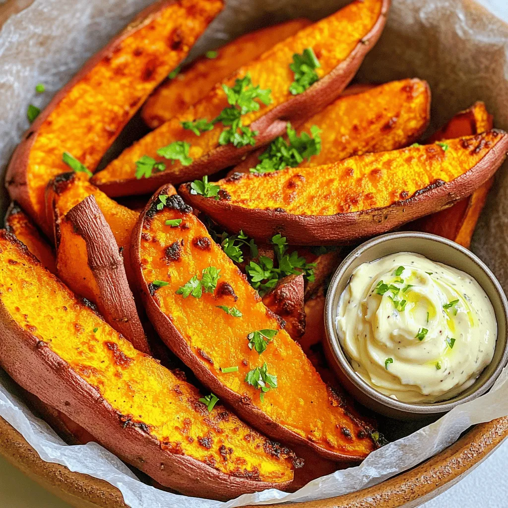 - 2 medium sweet potatoes - 2 tablespoons olive oil - 1 teaspoon paprika - 1 teaspoon garlic powder - ½ teaspoon onion powder - ½ teaspoon salt - ¼ teaspoon black pepper - Optional: fresh parsley for garnish - Calories per serving: About 150 calories - Macronutrients breakdown: - Carbohydrates: 30g - Protein: 2g - Fats: 7g Sweet potatoes are rich in vitamins A and C, making them a healthy choice. They also provide fiber, which aids digestion. How to wash and peel sweet potatoes Start by rinsing the sweet potatoes under cool water. Use your hands or a vegetable brush to remove dirt. Next, peel the skin off with a vegetable peeler. This step makes the wedges tender and tasty. Cutting the sweet potatoes into wedges After peeling, place the sweet potatoes on a cutting board. Cut each potato in half lengthwise. Then, slice each half into wedges about 1 inch thick. This size helps them cook evenly and become crispy. Combining olive oil and spices in a bowl In a large mixing bowl, pour in 2 tablespoons of olive oil. Add 1 teaspoon of paprika, 1 teaspoon of garlic powder, ½ teaspoon of onion powder, ½ teaspoon of salt, and ¼ teaspoon of black pepper. These spices give the wedges a nice kick. Importance of proper coating for optimal flavor Add the sweet potato wedges to the bowl and mix well. Make sure each wedge is fully coated. This step is key. A good coating ensures full flavor and helps achieve that crispy texture. Preheating the air fryer Set your air fryer to 400°F (200°C). Let it preheat for about 5 minutes. This step helps the wedges start cooking right away, which is vital for crispiness. Arranging wedges in the air fryer basket Carefully place the seasoned wedges in the air fryer basket. Keep them in a single layer. Overcrowding the basket can make them soggy instead of crispy. Cooking time and tips for crispiness Air fry the wedges for 15-20 minutes. Shake the basket halfway through cooking. This helps to cook them evenly. When they turn golden brown and crisp, they are ready to enjoy! To get crispy sweet potato wedges, fry them in a single layer. This helps hot air circulate around each wedge. If they touch, some will steam instead of fry. You want them to get golden and crunchy. Make sure to shake the basket halfway through cooking. This lets the wedges flip and cook evenly. You will notice a big difference in crispiness if you do this. One common mistake is overcrowding the basket. If you add too many wedges, they won't cook well. Always leave space between the pieces. This makes sure they fry instead of steam. Another mistake is wrong seasoning ratios. Too much spice can overpower the sweet potato flavor. Use the right amounts for the best taste. Stick to the recipe for a well-balanced flavor. When serving, present the wedges nicely. A rustic bowl lined with parchment paper looks great. You can also sprinkle fresh parsley on top for color. Pair the wedges with delicious dips. Aioli or salsa works well and adds flavor. These dips enhance your meal and make it more fun. Enjoy your crispy sweet potato wedges! {{image_2}} You can easily change the flavors of your sweet potato wedges. To make them spicy, add a bit of cayenne pepper. Just a pinch can bring some heat. If you want a sweet twist, sprinkle cinnamon and brown sugar on the wedges. This mix adds a nice caramel flavor. Try both styles to see what you like best! You can enjoy sweet potato wedges in many ways. If you don't have an air fryer, you can bake them. Just spread the wedges on a baking sheet and cook them in the oven at 425°F (220°C) for about 25-30 minutes. Flip them halfway for even cooking. Another option is deep-frying. Heat oil in a pan and fry the wedges until golden brown. This gives a crispy texture but adds more fat. If you want to change the oil, you can use avocado oil or coconut oil. Both oils work well and have their own flavors. For spices, you can swap in Italian seasoning or chili powder. This will give your wedges a unique taste. Feel free to adjust ingredients based on what you have at home! To keep your sweet potato wedges fresh, store them in an airtight container. Place a paper towel inside to absorb moisture. This way, they stay crispy longer. They can last in the fridge for about 3 to 5 days. If they smell off or look soggy, it's best to throw them away. The best way to reheat sweet potato wedges is in the oven. Preheat the oven to 400°F (200°C). Spread the wedges on a baking sheet in a single layer. Warm them for about 10 minutes. This method keeps them crispy. You can also use a microwave, but this will make them soft. If you choose the microwave, heat in short bursts to avoid sogginess. You can freeze both uncooked and cooked sweet potato wedges. For uncooked wedges, place them on a baking sheet and freeze until solid. Then, transfer them to a freezer bag. For cooked ones, let them cool completely before freezing. To use frozen wedges, thaw them overnight in the fridge. Then, reheat in the oven for that crispy finish. To get crispy sweet potato wedges, follow these tips: - Cut sweet potatoes into even wedges, about 1 inch thick. - Toss them well with olive oil and spices. - Preheat your air fryer to 400°F (200°C) for 5 minutes. - Place the wedges in a single layer, avoiding crowding. - Shake the basket halfway through cooking. These steps help ensure even cooking and a perfect crunch. Yes, you can use other potatoes like russet or Yukon gold. They will cook differently: - Russet potatoes may take about 20-25 minutes. - Yukon gold may need around 15-20 minutes. Adjust cooking times based on size and thickness. These wedges pair well with many dishes. Here are some ideas: - Serve them as a side with grilled chicken or fish. - They make a great snack with dips like aioli or salsa. - Add them to salads for extra crunch and flavor. Feel free to mix and match as you enjoy! In this blog post, we explored how to create delicious air fryer sweet potato wedges. We covered essential ingredien