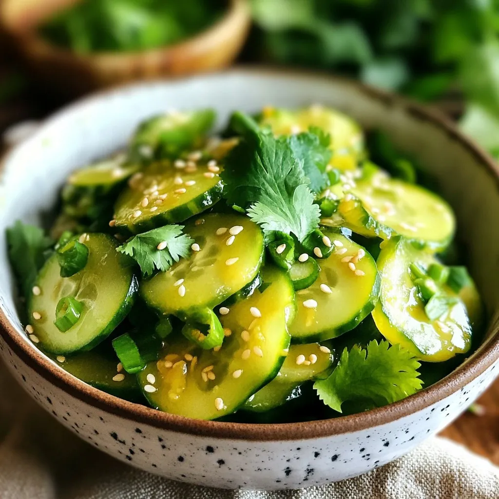 When mixing your salad, be gentle. You want to keep the cucumber slices whole. Add the green onions and sesame seeds last. This keeps them crunchy and bright. Serve the salad chilled or at room temperature. Garnish with fresh cilantro for a pop of color. This adds not only looks but also a fresh taste. Enjoy your salad as a side dish or a light snack!
