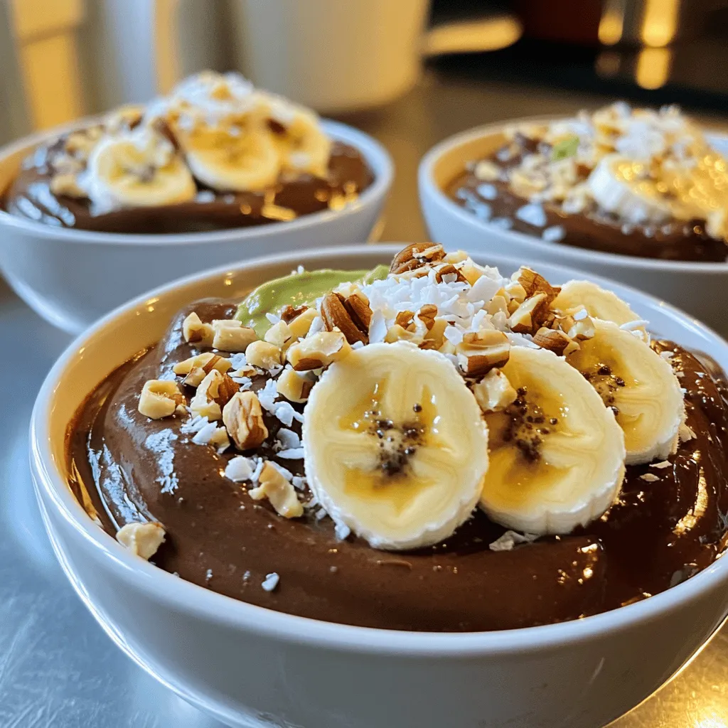To make this creamy and rich avocado chocolate pudding, gather these simple items: - 2 ripe avocados, peeled and pitted - 1/2 cup unsweetened cocoa powder - 1/2 cup maple syrup (or honey for a non-vegan option) - 1/4 cup almond milk (or any milk of choice) - 1 teaspoon vanilla extract - A pinch of sea salt - Optional toppings: sliced bananas, crushed nuts, or coconut flakes You can easily make this pudding fit your needs. If you want a vegan option, stick with maple syrup. For those who avoid nuts, use oat milk instead of almond milk. If you are gluten-free, all the ingredients listed are safe for you. You can also replace the cocoa powder with carob powder for a different flavor. Toppings make this dessert even better. Consider adding sliced bananas for sweetness. Crushed nuts add a nice crunch, while coconut flakes provide a fun texture. You can also drizzle some extra maple syrup on top for a sweet touch. Get creative with your toppings to make it your own! First, choose two ripe avocados. A ripe avocado feels slightly soft when you press it. Cut the avocados in half and remove the pit. Use a spoon to scoop the green flesh into a blender or food processor. This step is crucial for a smooth pudding. Now, add the following to your blender: - 2 ripe avocados - 1/2 cup unsweetened cocoa powder - 1/2 cup maple syrup - 1/4 cup almond milk - 1 teaspoon vanilla extract - A pinch of sea salt Blend everything together until creamy and smooth. You may need to scrape down the sides a couple of times. Taste the mixture and add more maple syrup if you want it sweeter. This is your moment to make it just right. Once blended, pour the pudding into bowls or a large dish. Cover it with plastic wrap or a lid. Place it in the fridge for at least 30 minutes. This chilling time helps it set. For serving, I love to add sliced bananas, crushed nuts, or coconut flakes on top. These toppings add a nice crunch and flavor. Enjoy the pudding cold for the best taste! To get a smooth and creamy pudding, use ripe avocados. Ripe avocados blend easily. I recommend using a food processor or a strong blender. Blend the avocados first until they are smooth. Scrape down the sides to mix well. Then, add the cocoa powder and other ingredients. Blend again until it is fully creamy. If it's too thick, add a little more almond milk. Taste the pudding before serving. If you want it sweeter, add more maple syrup. Remember, sweetness varies with personal taste. Start with the recipe's amount and adjust as needed. Blend well after each addition. This way, you get the right sweetness for your dessert. Presentation makes any dish exciting. Serve the pudding in stylish bowls. Top it with sliced bananas, crushed nuts, or coconut flakes. These toppings add flavor and texture. You can also use a drizzle of maple syrup on top. Chill the pudding before serving for a refreshing treat. Enjoy it cold for the best taste! {{image_2}} You can make this pudding even more fun! Try adding different flavors. For example, mix in some espresso powder for a coffee kick. You can also use almond extract instead of vanilla. For a tropical twist, add a spoonful of coconut cream. These small changes can make a big difference in taste. This recipe is already vegan if you use maple syrup. To keep it gluten-free, just check your cocoa powder. Most brands are gluten-free, but some may have cross-contamination. You can also swap almond milk for coconut or oat milk. Both will taste great and keep it vegan. Presentation is key! Serve the pudding in small cups or bowls. Top it with sliced bananas or crushed nuts for some crunch. You can also sprinkle coconut flakes on top for a tropical flair. For a fun dessert, layer the pudding with fruit in a jar. This makes for a beautiful and tasty treat. To store leftover avocado chocolate pudding, place it in an airtight container. Make sure the container is sealed tightly. This helps keep the pudding fresh and prevents it from absorbing other smells in the fridge. Avocado chocolate pudding can last up to 3 days in the fridge. For best taste and texture, eat it within the first two days. Always check for any changes in color or smell before serving. If the pudding darkens, it’s still okay to eat but may taste different. You can freeze avocado chocolate pudding for up to 3 months. To freeze, scoop the pudding into ice cube trays or small containers. Cover them tightly. When you want to enjoy it, let it thaw in the fridge overnight. You may need to stir it to restore its creamy texture. Avocado chocolate pudding is quite healthy! It uses ripe avocados, which are full of good fats. These fats help your heart. The cocoa powder adds antioxidants, which protect your body. Maple syrup gives sweetness without processed sugar. Overall, this pudding is a tasty and nutritious treat. Yes, you can use other sweeteners! Honey is a great choice if you're not vegan. Coconut sugar or agave syrup also works well. Just adjust the amount to fit your taste. Each sweetener can change the flavor a bit, so try what you enjoy most. You can use any milk you like! Soy milk, oat milk, or coconut milk are good options. Each kind brings a different taste. If you want it creamier, try using coconut milk. Just pick what fits your diet and taste. You can keep avocado chocolate pudding in the fridge for about three days. Make sure to cover it tightly to keep it fresh. The pudding may darken a little, but it will still taste great. Just give it a stir before serving again. Absolutely, kids will love it! This pudding is rich and sweet, so it’s a fun treat. It has healthy ingredients, making it a better dessert choice. You can also let kids help with toppings like bananas or nuts. It’s a fun way to get them excited about healthy food! Avocado chocolate pudding is simple and delicious. We covered key ingredients, swaps for diets, and optional toppings. Step-by-step, I explained how to prepare and blend your pudding. Tips helped achieve texture and sweetne