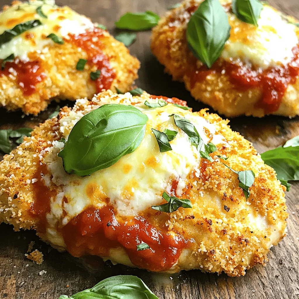 ![To make Baked Chicken Parmesan, gather these main ingredients: - 4 boneless, skinless chicken breasts - 1 cup breadcrumbs (preferably panko for extra crunch) - 1/2 cup grated Parmesan cheese - 1 teaspoon garlic powder - 1 teaspoon dried oregano - 1 teaspoon dried basil - 1/2 teaspoon salt - 1/2 teaspoon black pepper - 2 large eggs - 1 cup marinara sauce (homemade or store-bought) - 1 1/2 cups shredded mozzarella cheese - Fresh basil leaves for garnish These ingredients create a tasty dish. The chicken stays juicy, while the breading gets crispy. The marinara sauce adds a rich flavor, and mozzarella gives it that gooey texture we love. You can add a few optional ingredients to make it even better: - Red pepper flakes for heat - Fresh garlic for a bolder taste - Spinach or mushrooms for extra veggies - Different cheeses like provolone for variety These extras can change the dish. You can make it spicier or add more depth. Feel free to get creative! When picking ingredients, here are some tips: - Choose fresh chicken breasts. Look for a bright color and no odor. - Use quality breadcrumbs. Panko breadcrumbs give the best crunch. - Pick good marinara sauce. Taste a bit to ensure it’s flavorful. - Go for fresh herbs. They make a big difference in taste. These tips help you select the best ingredients for your Baked Chicken Parmesan. Great ingredients equal great meals! For the complete recipe, check the Full Recipe section. First, preheat your oven to 400°F (200°C). This helps the chicken cook evenly. Next, place the chicken breasts between two sheets of plastic wrap. Use a meat mallet or rolling pin to pound them to 1/2 inch thick. This makes the chicken tender and helps it cook faster. Now, set up your breading station. In a shallow dish, mix breadcrumbs, Parmesan cheese, garlic powder, oregano, basil, salt, and pepper. In another dish, beat the eggs. This will help the coating stick to the chicken. Take each chicken breast and dip it into the eggs. Let any extra egg drip off. Then, dredge the chicken in the breadcrumb mix. Press down to make sure the coating sticks well. Place the breaded chicken breasts on a greased baking sheet. Bake them in the preheated oven for 20 to 25 minutes. The chicken should be cooked through and the coating golden brown. After the first bake, remove the chicken from the oven. Spoon marinara sauce generously over each piece. Then, sprinkle shredded mozzarella cheese on top. This adds that gooey, cheesy goodness we all love. Return the chicken to the oven for another 10 to 12 minutes. You'll know it's done when the cheese is melted and bubbly. Once the chicken is out of the oven, let it rest for a couple of minutes. This helps the juices settle. For a fresh touch, garnish with basil leaves before serving. Your dish is now ready, and it's beautiful! You can find the full recipe at the end of this article. Enjoy every bite! To get that perfect crunch on your chicken, use panko breadcrumbs. They are lighter and crispier than regular breadcrumbs. Mix them with grated Parmesan cheese and seasonings for extra flavor. When you coat the chicken, press down firmly. This helps the crumbs stick better. Bake the chicken on a greased tray to ensure it cooks evenly. Flip the chicken halfway through baking to crisp both sides. One common mistake is not pounding the chicken. If your chicken is uneven, it may cook poorly. Always pound it to an even thickness. Another mistake is skimping on the coating. Make sure to fully coat the chicken in the breadcrumbs. This adds flavor and helps achieve that crunchy texture. Lastly, don’t rush the baking time. If you take it out too soon, the chicken might be undercooked. If you have leftovers, you can get creative. Slice the chicken and add it to pasta for a quick meal. You can also make a sandwich with the chicken and some marinara sauce. For a fun twist, chop the chicken into pieces and toss it on a salad. The flavors blend well, and it makes a great lunch option. Check out the Full Recipe for more ideas. {{image_2}} You can make Baked Chicken Parmesan healthier by swapping some ingredients. Instead of regular breadcrumbs, use whole wheat breadcrumbs. They add fiber and nutrients. For the cheese, try part-skim mozzarella to reduce fat. You can also replace marinara sauce with a low-sugar version. Use fresh herbs like parsley or spinach to boost flavor without adding calories. These swaps make the dish lighter but still tasty. Want to add some zing? Try adding crushed red pepper flakes to the breadcrumb mix. It gives a nice kick. You can also mix in different herbs like thyme or rosemary for new flavors. For a twist, use pesto instead of marinara sauce. It adds a fresh, herby taste and makes it unique. Experimenting with different cheeses, like provolone or fontina, can also elevate your dish. If you need a gluten-free option, use gluten-free breadcrumbs or cornflakes. They work well as a coating and still give that crunchy texture. Almond flour is another great choice for breading. It adds a nutty flavor and keeps the dish gluten-free. Always check labels on sauces to ensure they are gluten-free. These options make Baked Chicken Parmesan friendly for everyone while keeping it delicious. For the complete recipe, check the [Full Recipe]. Store leftovers in an airtight container. Let the chicken cool to room temperature first. Place it in the fridge for up to three days. If you want to keep it longer, consider freezing it. To reheat, preheat your oven to 350°F (175°C). Place the chicken on a baking sheet. Cover it with foil to keep moisture in. Bake for about 20 minutes, or until heated through. You can also use a microwave for faster reheating. Just make sure to cover it to avoid drying out. If you plan to freeze, cool the chicken completely first. Wrap each piece tightly in plastic wrap, then in foil. This helps prevent freezer burn. You can freeze it for up to three months. When ready to eat, thaw it in the fridge overnight befor