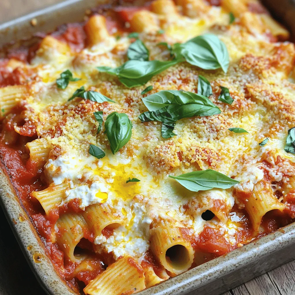 These ingredients form the base of your dish. Each one adds flavor and texture. Ziti pasta gives a nice bite, while ricotta and mozzarella create a creamy layer.
