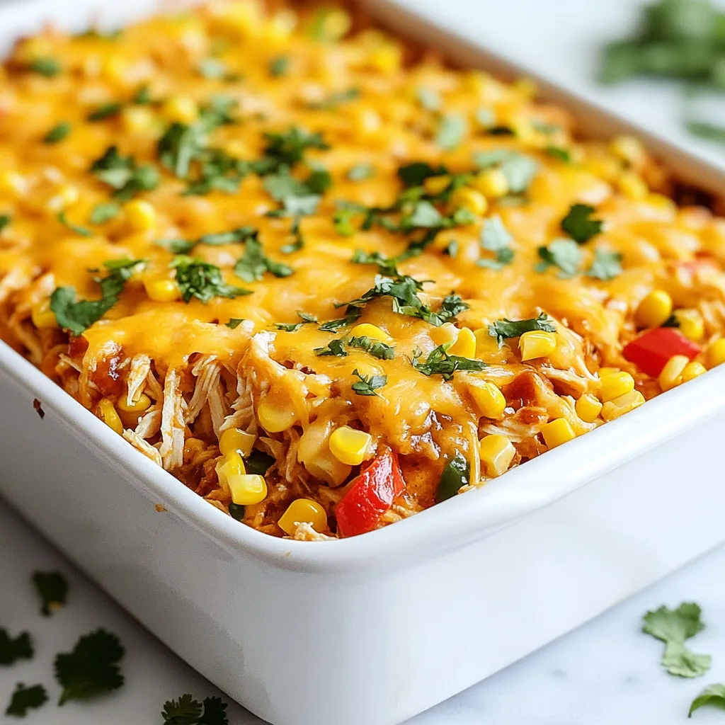 I pour the chicken mixture into the greased baking dish. I spread it out evenly, so it cooks well. Next, I sprinkle the shredded cheddar cheese over the top. This adds a rich flavor and a nice crust. I cover the dish with aluminum foil and bake it for 25 minutes. After that, I remove the foil and bake for another 10-15 minutes. I watch for the cheese to become bubbly and golden. Once it’s done, I take it out and let it cool for a few minutes. Then, I garnish it with fresh cilantro before serving.