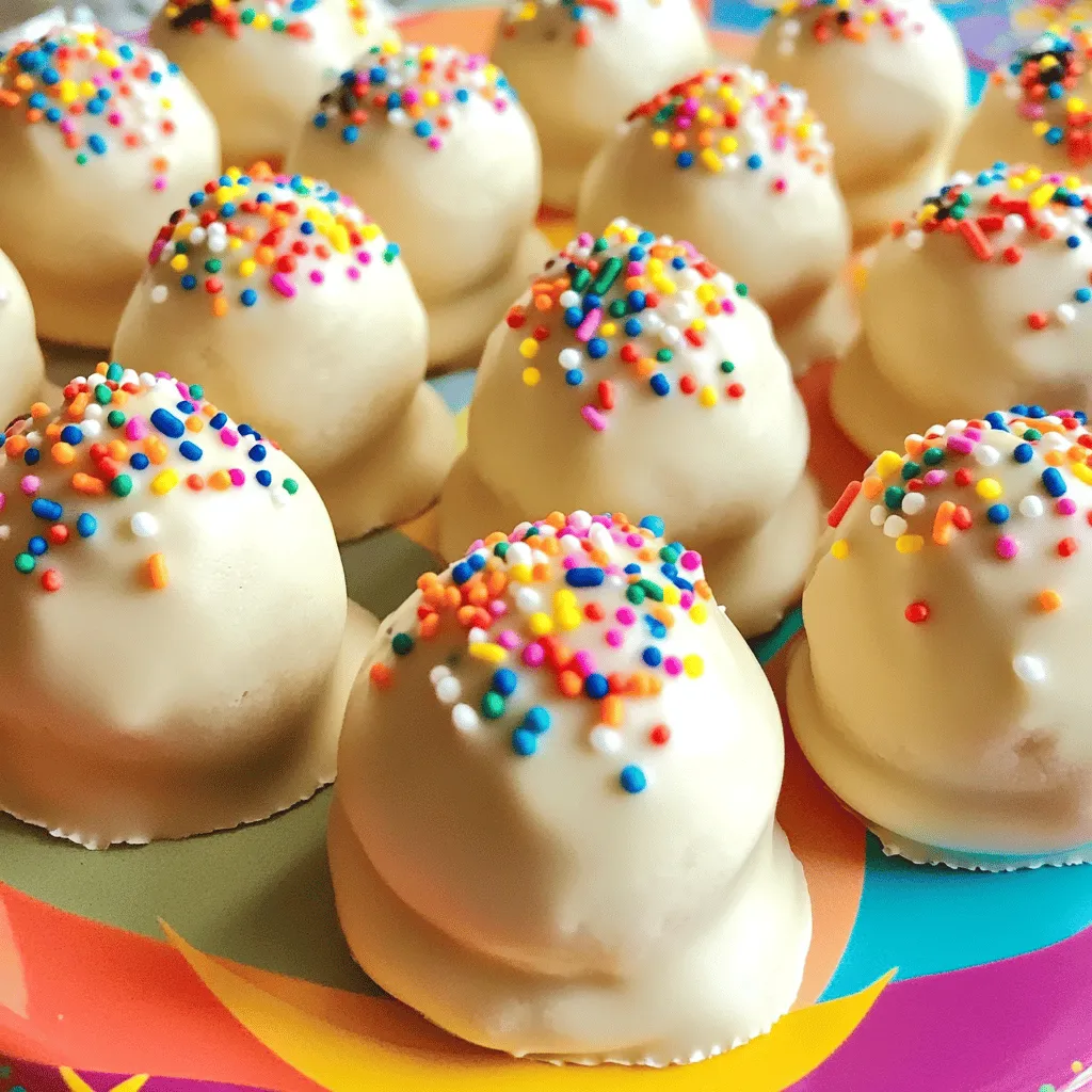 - 1 cup all-purpose flour - 1/2 cup unsalted butter, softened - 1/2 cup brown sugar, packed - 1/4 cup granulated sugar - 1 teaspoon vanilla extract - 1/4 teaspoon salt - 1 cup mini chocolate chips - 1/2 cup rainbow sprinkles - 1 cup white chocolate chips (for coating) In this recipe, I use simple and fun ingredients. First, we need flour, which is the base of our cookie dough. It gives the truffles that classic cookie taste. I also use unsalted butter, so I can control the salt in my mixture. Next, brown sugar adds moisture and a rich flavor. The granulated sugar gives sweetness and a slight crunch. Both sugars blend well, making the dough light and fluffy. I add vanilla extract for a warm, sweet aroma. A pinch of salt balances the sweetness and enhances the flavors. For the fun part, mini chocolate chips and rainbow sprinkles add joy to each bite. They create a festive look and taste, perfect for celebrations. Finally, white chocolate chips coat the truffles, making them pretty and sweet. This mix of ingredients creates a delightful treat. Each truffle is a small bite of joy. The combination of flavors and textures makes this recipe a hit for any birthday or special occasion. To make the flour safe, heat it in the oven. Preheat your oven to 350°F (175°C). Spread 1 cup of all-purpose flour evenly on a baking sheet. Bake it for 5 to 7 minutes. This step kills any bacteria. After baking, let the flour cool completely before using it. Start by creaming the butter and sugars. In a large mixing bowl, add 1/2 cup of softened unsalted butter, 1/2 cup of brown sugar, and 1/4 cup of granulated sugar. Mix them together until the mixture is light and fluffy. Next, add the cooled flour, 1 teaspoon of vanilla extract, and 1/4 teaspoon of salt. Stir until all the ingredients combine well. The dough should be thick and easy to handle. Finally, gently fold in 1 cup of mini chocolate chips and 1/2 cup of rainbow sprinkles. Now it’s time to shape the dough. Use a tablespoon or a cookie scoop to scoop out the dough. Roll each scoop into a ball about 1 inch in diameter. Place the dough balls on a lined baking sheet. You should get about 20 truffles from this mixture. To firm up the truffles, chill them in the refrigerator for about 30 minutes. For coating, you need to melt the white chocolate chips. Place 1 cup of white chocolate chips in a microwave-safe bowl. Heat them in the microwave in 30-second intervals. Stir the chocolate between each interval until it is smooth and fully melted. To coat the truffles, dip each chilled ball into the melted white chocolate. Make sure each truffle is fully covered. Use a fork to lift the truffle out and let the excess chocolate drip off. Place it back on the lined baking sheet. While the coating is still wet, sprinkle some rainbow sprinkles on top for extra fun. Allow the truffles to set at room temperature or place them in the fridge for about 15 minutes to harden. To get the right texture for your cookie dough, you want it thick and creamy. Make sure to cream the butter and sugars well. This step adds air and makes the dough light. If the dough feels too dry, add a splash of milk or a little more butter. For flavor, try adding almond extract or lemon zest for a twist. When coating your truffles, keep the melted white chocolate smooth. If it starts to thicken, warm it gently. Dip each truffle fully, then lift it with a fork. Let the excess chocolate drip back into the bowl. This helps avoid clumps. If you find drips on the truffles, gently tap the fork to shake them off. To serve your truffles, arrange them on a bright platter. You can also use cupcake liners for a fun touch. For gifts, consider a decorative box or jar. Add a cute label or ribbon to make it special. This way, your treats look as good as they taste! {{image_2}} You can make these truffles even more fun. Try adding a few drops of different extracts. Almond extract gives a nice twist. It adds a warm, nutty flavor. You can also swap out the white chocolate for dark or milk chocolate. Each change gives a new taste. You get to be creative with each batch! Mix-ins can make your truffles unique. Instead of rainbow sprinkles, use chocolate sprinkles or crushed cookies. This adds a nice crunch. You can also add nuts like chopped walnuts or pecans. Dried fruit, like cherries or cranberries, works too. These mix-ins will surprise your taste buds! Want to make it gluten-free? Use gluten-free flour instead of all-purpose flour. This swap keeps the taste and texture. For a vegan version, replace butter with coconut oil. Use dairy-free chocolate for coating. Both options let everyone enjoy these truffles! To keep your truffles fresh, store them in an airtight container. You can use a plastic container or a glass jar with a tight lid. This helps to lock in moisture and flavor. Place a piece of parchment paper between layers if stacking them. This prevents sticking and makes them easy to grab. You can freeze these truffles for up to three months. To freeze, place them on a baking sheet in a single layer. Freeze until firm, then transfer them to a freezer bag. Make sure to remove as much air as possible. When you're ready to enjoy them, take them out and let them sit at room temperature for about 30 minutes. This keeps their texture and flavor just right. Yes, you can eat raw cookie dough, but there are safety tips to consider. Raw flour may have germs. To make it safe, heat the flour first. Spread it on a baking sheet and bake at 350°F for 5-7 minutes. This kills any harmful bacteria. Allow it to cool before mixing with other ingredients. By doing this, you can enjoy your cookie dough safely. If you need to substitute white chocolate, there are great options. Dark chocolate works well for a rich flavor. Milk chocolate gives a sweeter taste. If you want a dairy-free option, use vegan chocolate chips. These alternatives fit different diets and still taste amazing. Choose what you like best! These truffles can last u