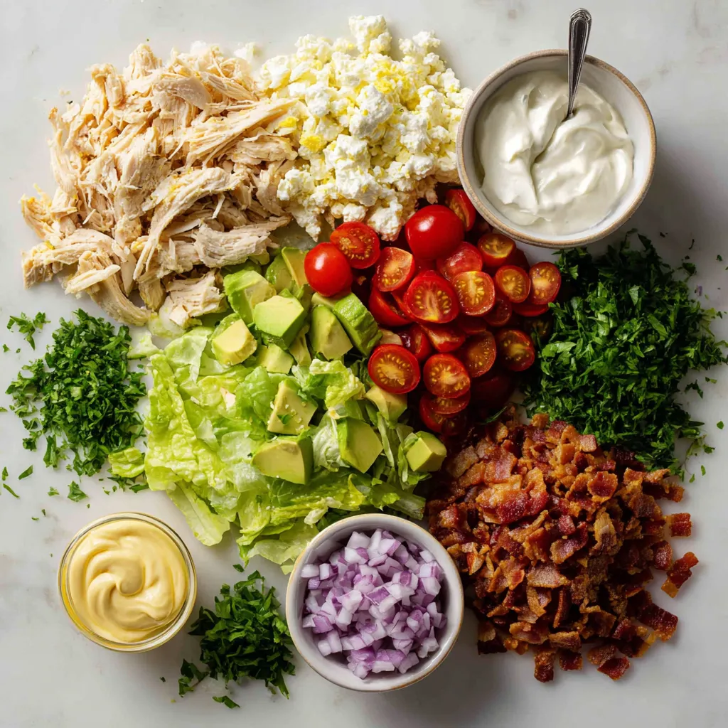 In a large mixing bowl, combine the shredded chicken, crumbled turkey bacon, halved cherry tomatoes, diced avocado, chopped romaine lettuce, and finely chopped red onion.