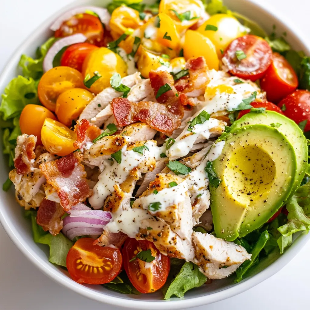 A refreshing salad combining chicken, crispy bacon, and fresh vegetables.