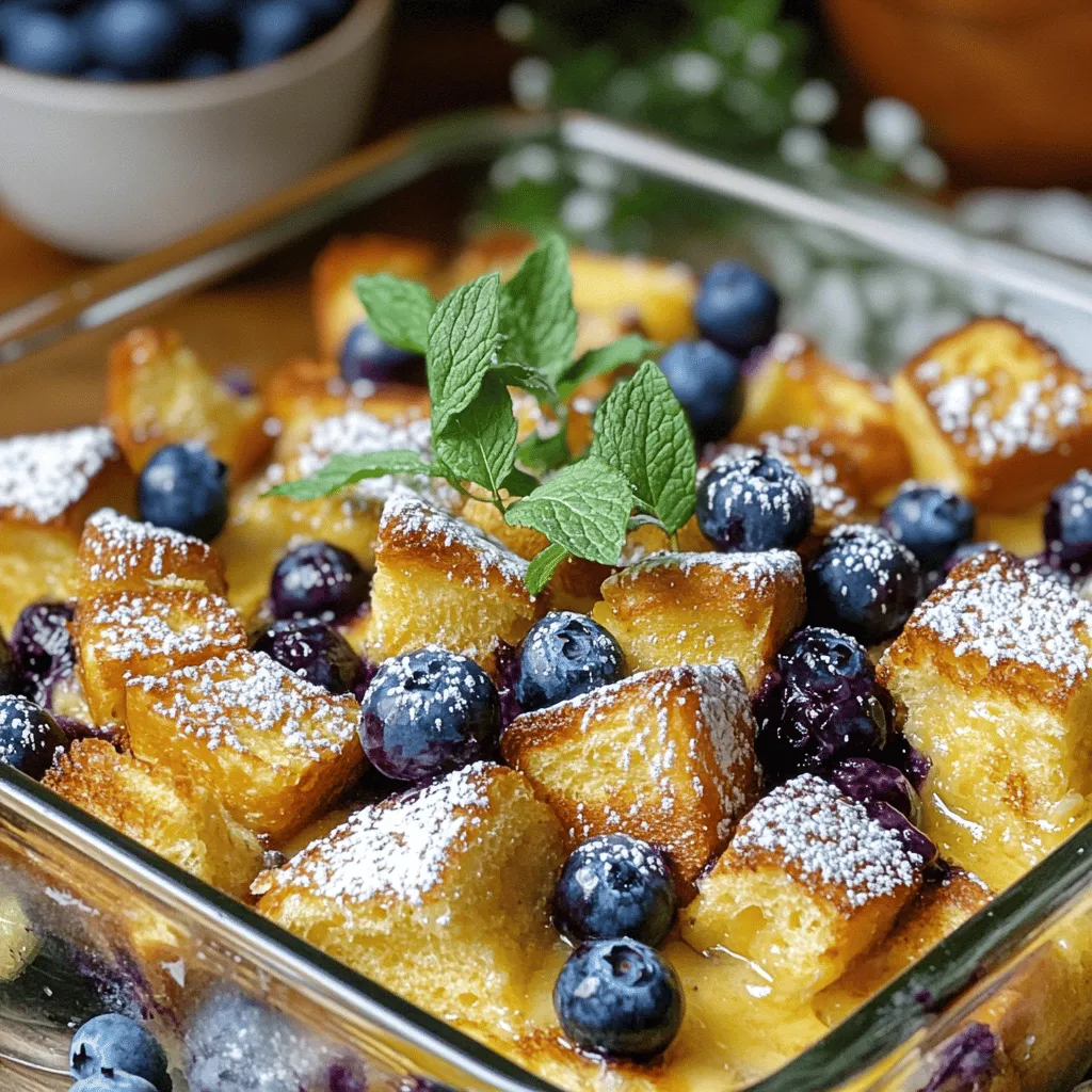![To create a delicious Blueberry French Toast Casserole, gather these key ingredients: - 1 loaf of brioche bread, cut into 1-inch cubes - 2 cups fresh blueberries (or frozen, thawed) - 6 large eggs - 2 cups milk - 1/2 cup heavy cream - 1/4 cup maple syrup - 1 teaspoon vanilla extract - 1 teaspoon ground cinnamon - 1/4 teaspoon salt These ingredients work together to create a rich, custardy base that soaks into the bread. The brioche bread gives a soft texture and sweet flavor. Blueberries add a burst of juiciness and color. For a beautiful finish, consider these optional garnishes: - 1/4 cup powdered sugar (for serving, optional) - Extra blueberries for topping - Fresh mint leaves for a pop of green Using these garnishes can elevate your dish. They enhance both the look and taste. A dusting of powdered sugar adds sweetness, while mint leaves bring freshness. To see the full recipe, check out the [Full Recipe]. 1. Preheat your oven to 350°F (175°C). This step is key for even baking. 2. Grease a 9x13 inch baking dish with cooking spray or butter. This helps the casserole slide out easily. 3. In a large bowl, whisk together 6 large eggs, 2 cups milk, 1/2 cup heavy cream, 1/4 cup maple syrup, 1 teaspoon vanilla extract, 1 teaspoon ground cinnamon, and 1/4 teaspoon salt. Mix until everything blends well. 4. Cut 1 loaf of brioche bread into 1-inch cubes. Place the cubes in the greased baking dish. 5. Sprinkle 2 cups of fresh blueberries (or thawed frozen blueberries) evenly over the bread. This adds a burst of flavor. 1. Pour the egg mixture over the bread and blueberries. Make sure all the bread gets soaked. Press down gently so every piece is covered. 2. Cover the dish with aluminum foil and refrigerate. Let it sit for at least 1 hour, or overnight for best results. This soaking time is crucial for a creamy texture. 3. When ready to bake, take the casserole out of the fridge. Let it sit at room temperature for about 15 minutes. This helps it bake evenly. 4. Bake the casserole covered with foil for 20 minutes. Then, remove the foil and bake for an additional 20-25 minutes. Look for a golden top and set egg mixture. 1. Once baked, remove it from the oven. Let it cool slightly before serving. This lets the flavors settle. 2. Dust with powdered sugar if you like. This adds a sweet touch. 3. Serve warm. Add extra blueberries and mint leaves on top for a pop of color. This makes the dish look even more inviting. For the complete details, you can follow the Full Recipe. Enjoy your baking! Choosing the best bread for the casserole is key. I love using brioche bread. Its soft texture soaks up the egg mixture well. You can also use challah for a similar feel. Avoid bread that is too dense, as it won't absorb flavors. When it comes to blueberries, fresh is best. They burst with flavor and juice. However, frozen blueberries work too. Just remember to thaw them first. Rinse and drain them to remove extra moisture. Proper soaking time ensures the bread absorbs the egg mixture. I recommend at least one hour. For the best results, let it soak overnight. This way, each bite is creamy and flavorful. To achieve a golden top, bake covered for part of the time. This traps steam and helps cook the inside. Uncover for the last 20 minutes. This allows the top to brown nicely. Serving suggestions can elevate your dish. I like to serve it warm, dusted with powdered sugar. Add a few extra blueberries on top for color. A sprig of mint adds a fresh touch. For creative plating, use a rectangular plate. Cut the casserole into squares and stack them. Drizzle maple syrup on the side. This creates a lovely visual that makes everyone eager to dig in. For the Full Recipe, check out the complete instructions and details. {{image_2}} You can easily switch up the flavors in your Blueberry French Toast Casserole. Try adding different fruits like strawberries or raspberries. These fruits add a nice tartness and extra color. You can mix them in with the blueberries or layer them on top. Another fun idea is to incorporate nuts or granola. Chopped pecans or walnuts add a nice crunch. They also give a rich flavor. Just sprinkle them on top before baking for the best results. Granola can add texture and sweetness too. If you need a dairy-free option, you can substitute the milk and cream with almond milk or coconut milk. Both options work well and keep the dish creamy. For a vegan alternative, replace the eggs with a flaxseed mixture. Mix one tablespoon of ground flaxseed with three tablespoons of water. Let it sit for a few minutes until it thickens. These tweaks still create a delicious casserole that everyone can enjoy. Just remember, each change can slightly alter the taste, so feel free to experiment. For the full recipe, check out the Blueberry Bliss French Toast Casserole. To keep your Blueberry French Toast Casserole fresh, place it in an airtight container. The fridge is the best place for leftovers. Ensure it cools to room temperature first. This dish stays good for up to three days in the fridge. If you want to enjoy it longer, consider freezing. When reheating, I recommend using the oven to keep the texture nice. Preheat your oven to 350°F (175°C). Place the casserole in an oven-safe dish. Cover it with foil to avoid drying out. Heat for about 15-20 minutes or until warm throughout. This method keeps the top crisp, just like fresh from the oven. You can freeze the casserole before or after baking. If freezing before baking, wrap it tightly in plastic wrap and foil. It can stay in the freezer for up to three months. To bake from frozen, thaw it overnight in the fridge, then bake as usual. If you freeze it after baking, let it cool completely first. Thaw it in the fridge, then reheat in the oven. Enjoy your delicious Blueberry French Toast Casserole any time! For the full recipe, check the earlier section. How long can I make this casserole ahead of time? You can prepare the Blueberry French Toast Casserole a day in advan