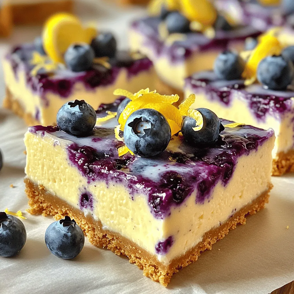 To make these tasty bars, you will need: - 1 ½ cups graham cracker crumbs - ½ cup unsalted butter, melted - 2 tablespoons sugar - 16 oz cream cheese, softened - ½ cup sugar - 2 large eggs - 2 tablespoons lemon juice - Zest of 1 lemon - 1 cup fresh blueberries - 1 tablespoon cornstarch - 1 teaspoon vanilla extract These ingredients create a creamy filling with a crisp crust. The blueberries and lemon add bright, fresh flavors that make every bite a delight. You can easily make swaps if needed. For the crust, try using almond flour for a gluten-free option. Instead of graham crackers, crushed cookies also work well. If you want a dairy-free version, use vegan cream cheese. You can also switch out blueberries for other fruits like raspberries or strawberries. Each fruit gives a unique taste and color to the bars. To make these blueberry lemon cheesecake bars, you'll need: - 8x8 inch baking pan - Parchment paper - Medium mixing bowl - Large mixing bowl - Mixer or whisk - Rubber spatula - Small bowl for blueberries Having the right tools makes the process smoother. Measure all your ingredients before you start. This helps keep things organized and fun! For the full recipe, follow the steps in detail to enjoy this easy, refreshing dessert. To start, gather your ingredients for the crust. You need graham cracker crumbs, melted butter, and sugar. Mix these in a medium bowl. Once combined, press the mixture into the bottom of an 8x8 inch baking pan. Make sure it is firm and even. Bake the crust at 350°F for 10 minutes. This step gives your bars a nice base. Let it cool slightly before moving on to the filling. Now it's time for the cheesecake filling. In a large bowl, beat the softened cream cheese with sugar until it’s smooth. Add the eggs one at a time, mixing well after each egg. Next, stir in the lemon juice, lemon zest, and vanilla extract. This mix brings a fresh flavor to your bars. In a small bowl, toss the fresh blueberries with cornstarch. This helps them not sink in the filling. Gently fold the blueberries into the cheesecake mixture. Pour the cheesecake filling over the cooled crust. Make sure it spreads evenly. Bake the bars for 25-30 minutes. Check if the edges are set, and the center should be slightly jiggly. Once done, let the bars cool at room temperature for about one hour. After that, refrigerate them for at least two hours. This cooling time helps the bars set well. When ready, lift them out using the parchment paper. Cut into squares and serve. For a fun touch, sprinkle some lemon zest on top. You can find the full recipe to guide you through these steps. To get a smooth and creamy texture, start with room-temperature cream cheese. Cold cream cheese will not mix well. Beat it until it is soft and fluffy. This step helps prevent lumps. Add eggs one at a time, mixing well after each. This keeps the batter light and airy. Cracks can spoil the look of your cheesecake bars. To avoid this, do not overmix the batter. Overmixing adds too much air. Also, bake at a lower temperature, around 325°F (160°C). This gentle heat helps the cheesecake cook evenly. If using a water bath, place the pan in a larger dish filled with water. This keeps moisture in the oven. For a lovely presentation, cut the bars into neat squares. Place them on a white plate to show off their pretty colors. Sprinkle a little lemon zest on top for a pop of color. A few fresh blueberries can make it even prettier. Add a dollop of whipped cream for extra creaminess. These small touches make your dessert shine, impressing all your guests. Check out the Full Recipe for more details. {{image_2}} You can switch the blueberries for other fruits. Raspberries, strawberries, or blackberries work well. Each fruit adds its own unique flavor. If you choose strawberries, slice them thinly. For raspberries or blackberries, just toss them in whole. This way, you’ll have a new treat each time. If you need a gluten-free option, use gluten-free graham crackers. You can also make a crust with almond flour. Mix the almond flour with melted butter and sugar. Press it into your pan like you would with regular graham crackers. The bars will still taste great! For a vegan version, swap out the cream cheese. Use a plant-based cream cheese instead. Replace the eggs with flax eggs. Mix one tablespoon of flaxseed meal with three tablespoons of water for each egg. Let it sit for a few minutes to thicken. Use maple syrup instead of sugar for sweetness. These changes keep it creamy and delicious. For the complete recipe, check the Full Recipe section. To keep your blueberry lemon cheesecake bars fresh, place them in an airtight container. If you do not have one, use plastic wrap to cover the bars tightly. This keeps out air and moisture, which can make them soggy or dry. Store the container in the fridge for best results. These cheesecake bars will last about 4 to 5 days in the fridge. After that, they may lose their flavor and texture. Always check for signs of spoilage, such as strange smells or changes in color. If they look or smell off, it’s best to throw them out. If you want to save some for later, you can freeze the bars. Cut them into squares and wrap each bar in plastic wrap. Then, place them in a freezer-safe bag or container. They can last up to 2 months in the freezer. When you're ready to eat, just thaw them in the fridge overnight. Enjoy the fresh taste, just like when you first made them! For the full recipe, check out the details above. Yes, you can use frozen blueberries. Just remember to thaw and drain them first. This keeps the cheesecake from getting too watery. Toss the thawed berries with cornstarch as you would fresh ones. This will help them stay whole while baking. Frozen blueberries can add a nice texture and flavor too. If you need a cream cheese substitute, try Greek yogurt or silken tofu. Both options work well in this recipe. Greek yogurt adds a tangy flavor, while silken tofu gives a smooth texture. You 