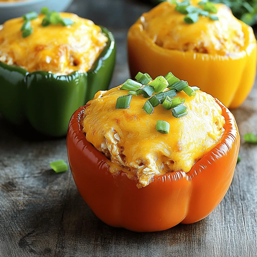 ![- 4 large bell peppers (any color) - 2 cups shredded cooked chicken - 1/2 cup buffalo sauce - 1/2 cup cream cheese - 1 cup shredded cheddar cheese - 1/2 cup celery, finely chopped - 1/4 cup green onions, sliced - Salt and pepper to taste - 1 tablespoon olive oil When you gather these ingredients, you set the stage for a great meal. The bell peppers form a colorful base, while the chicken and buffalo sauce bring bold flavors. The cream cheese adds a creamy touch, making each bite delightful. A serving of these stuffed peppers has about 400 calories. You get around 25 grams of fat and 30 grams of protein. The carbs total about 20 grams. For dietary needs, this recipe can be gluten-free if you check the sauce. It's also low-carb, making it great for many diets. Plus, the veggies add fiber, which is always a bonus! - Preheat oven to 375°F (190°C). - Cut the tops off the bell peppers and remove seeds. Lightly brush each pepper with olive oil. - In a large bowl, combine shredded chicken, buffalo sauce, and softened cream cheese. - Add half the cheddar cheese, chopped celery, and half the green onions. Mix well. Season with salt and pepper. - Stuff each bell pepper tightly with the buffalo chicken mixture. - Place them upright in a baking dish. If they wobble, trim a bit off the bottom. - Top each pepper with the remaining cheddar cheese. - Cover with aluminum foil and bake for 25 minutes. - Remove the foil and bake for another 10-15 minutes until cheese melts and peppers soften. - Let cool slightly and garnish with remaining green onions before serving. For the complete recipe, check [Full Recipe]. To achieve perfectly tender peppers, start with fresh bell peppers. Look for ones that feel firm and have smooth skin. Slice off the tops and remove the seeds carefully. A light brush of olive oil on the outside helps them roast well. For a flavorful filling, use shredded cooked chicken mixed with buffalo sauce. Cream cheese adds creaminess and keeps it moist. Don't forget to mix in chopped celery and green onions for a crunchy texture and fresh taste. Serve Buffalo Chicken Stuffed Peppers with sides like ranch or blue cheese dressing. These dips complement the heat of the buffalo sauce. You can also pair them with a fresh salad for a balanced meal. For garnishing, sprinkle extra green onions on top after baking. This adds color and a fresh crunch. Arrange the peppers on a colorful platter for an eye-catching display. One common mistake is overfilling the peppers. Stuff them firmly but leave some space at the top. This helps the filling cook evenly. Under seasoning can also take away from the flavor. Always taste your filling before stuffing. Another issue is baking time errors. Keep an eye on the peppers as they bake. The cheese should be melted and bubbly, and the peppers should be tender. Follow the [Full Recipe] for clear baking instructions. {{image_2}} You can swap out the chicken for other proteins. Turkey works well and keeps it light. You can also use tofu for a vegetarian option. If you want beef, go for ground beef or shredded beef. Each choice adds its own flavor. You might even try a mix for added depth. For vegan options, use plant-based chicken substitutes. They blend perfectly with the spices and sauces. Want to change the heat? You can adjust the buffalo sauce. For milder flavors, use less sauce. Try a mild buffalo sauce if you prefer less heat. If you like it spicy, use extra sauce or add hot sauce. You can even mix in some jalapeños for a kick. This way, you can make everyone happy. Mixing in different vegetables can enhance the filling. Chopped spinach or diced tomatoes can add freshness. You can also incorporate grains like quinoa or rice for more texture. If you want to change the cheese, try pepper jack for a spicy twist. Cream cheese can be swapped for Greek yogurt for a lighter option. Each alternative gives a unique taste to your stuffed peppers. For the full recipe, check out the details above. To keep your Buffalo Chicken Stuffed Peppers fresh, place them in an airtight container. This method prevents moisture loss and keeps flavors intact. You can store them in the fridge for up to three days. If you want to enjoy them later, freezing is a great option. To freeze your stuffed peppers, let them cool completely first. Wrap each pepper in plastic wrap, then place them in a freezer-safe bag. This helps avoid freezer burn. They can stay frozen for up to three months. For reheating, take the peppers out of the freezer and let them thaw overnight in the fridge. Preheat your oven to 375°F (190°C). Place the peppers in a baking dish and cover them with foil. Heat for about 25 minutes or until they warm up. Enjoy them just like you made them fresh! Yes, you can make these stuffed peppers ahead of time. To prep in advance, follow these steps: - Prepare the filling and stuff the peppers. - Cover them with plastic wrap and store in the fridge for up to 24 hours. - When ready to cook, just bake them from the fridge. They may need a few extra minutes. These stuffed peppers shine on their own, but sides can enhance the meal. Here are some ideas: - A fresh green salad with a light vinaigrette. - Crispy tortilla chips with salsa or guacamole. - Creamy ranch or blue cheese dressing for dipping. Absolutely! While buffalo sauce is classic, you can try different sauces. Here are some ideas: - BBQ sauce for a sweet and smoky flavor. - Honey mustard for a tangy twist. - Teriyaki sauce for an Asian flair. Experiment with your favorite sauces to find new flavors. For the full recipe, check out the previous sections. Buffalo Chicken Stuffed Peppers are easy to make and delicious. We covered all the key steps, from prepping the ingredients to baking the perfect dish. You learned how to mix flavors, adjust spice levels, and avoid common mistakes. This meal is great for any occasion, and you can customize it to fit your tastes. I encourage you to try these peppers. Enjoy experimenting with dif