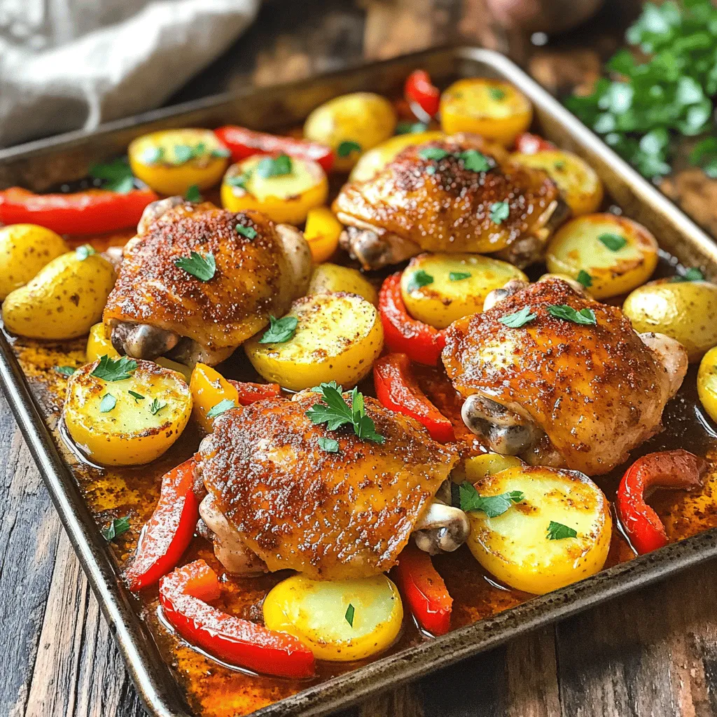 - 4 boneless, skinless chicken thighs - 1 red bell pepper, sliced - 1 yellow bell pepper, sliced - 1 small red onion, sliced - 2 cups baby potatoes, halved - 3 tablespoons olive oil - 2 tablespoons Cajun seasoning - 1 teaspoon garlic powder - 1 teaspoon onion powder - Salt and pepper to taste - Fresh parsley for garnish (optional) Choosing the right ingredients makes a big difference. For this Cajun Chicken Sheet Pan Dinner, I love using chicken thighs. They stay juicy and flavorful. Bell peppers add color and crunch. Use both red and yellow for the best taste. Baby potatoes are perfect here. They cook up soft and soak in all the flavors. Slice them in half for quicker cooking. You’ll also need olive oil for richness. Cajun seasoning brings that bold flavor. Garlic and onion powder add depth. Don’t forget salt and pepper to enhance every bite. Feel free to add fresh parsley on top. It gives a nice pop of color and flavor. For the full recipe, check the details. - Preheat the oven to 425°F (220°C). - Take your chicken thighs and place them in a large bowl. - Pour 1 tablespoon of olive oil over the chicken. - Add 1 tablespoon of Cajun seasoning, garlic powder, onion powder, salt, and pepper. - Mix everything well until the chicken is coated. - In another bowl, combine the sliced bell peppers, red onion, and halved baby potatoes. - Drizzle the remaining olive oil over the veggies. - Add the rest of the Cajun seasoning. - Toss the vegetables to coat them evenly with the oil and seasoning. - Grab a large baking sheet and arrange the chicken in the center. - Spread the seasoned vegetables around the chicken on the sheet pan. - Make sure they are evenly spaced for even cooking. - Bake in the preheated oven for about 25-30 minutes. - The chicken should reach an internal temperature of 165°F (75°C). - Check that the potatoes are tender. - Once done, take it out and let it rest for a few minutes. - You can garnish with fresh parsley before serving. For the full recipe, refer to the previous sections. Enjoy your simple and flavorful Cajun Chicken Sheet Pan Dinner! For a great Cajun Chicken Sheet Pan Dinner, cook the chicken until it hits 165°F (75°C). You can check this using a meat thermometer. Insert it into the thickest part of the thigh without touching the bone. This ensures juicy chicken every time. Let the chicken rest before serving. This helps keep the juices inside. If you skip this step, the chicken may dry out. Rest it for about five minutes on the pan before plating. You’ll see a big difference in taste and texture. To make your dish pop, consider garnishing with fresh herbs. Chopped parsley adds color and fresh flavor. It brightens up the meal and makes it more inviting. You can also add lemon wedges on the side. They add a zesty kick when squeezed over the chicken. Fresh herbs not only improve the look but also enhance the taste. They bring out that Cajun flair in every bite. {{image_2}} You can change up the vegetables in this dish. Try using zucchini, asparagus, or broccoli. These veggies add great taste without losing the fun of cooking. You can also switch the protein. Instead of chicken, use shrimp or sausage. Both options cook well and add a different flair to the meal. Shrimp cooks quickly, so be sure to adjust your cooking time. Sausage can add a heartier flavor, making it a filling choice. Want to spice up your Cajun chicken? You can add cayenne pepper for heat. A little goes a long way, so start small and taste as you go. You might also try adding fresh herbs like thyme or oregano. They can brighten the dish. For sauces, consider adding a splash of hot sauce or a drizzle of honey. Both can enhance the flavors and give your meal a unique twist. You can find the full recipe for all these ideas and more. To store your leftover Cajun Chicken Sheet Pan Dinner, let it cool first. Place the chicken and veggies in an airtight container. This keeps them fresh and tasty. You can store it in the fridge for up to three days. If you notice any odd smells or changes in color, it's time to throw it away. When you want to enjoy your leftovers, reheating is key. The best method is using the oven. Preheat it to 350°F (175°C). Place the chicken and veggies on a baking sheet and cover them with foil. Heat for about 15-20 minutes. This keeps everything juicy and tasty. If you want to freeze it, make sure it cools completely first. Place the food in freezer-safe bags or containers. It can last up to three months in the freezer. When you're ready to eat, thaw it in the fridge overnight before reheating. This keeps the flavor and texture just right. Cajun Chicken Sheet Pan Dinner shines with sides that complement its bold flavors. Here are some great options: - Rice: White or brown rice soaks up tasty juices. - Corn: Grilled or roasted corn adds sweetness. - Salad: A fresh green salad balances the spices. - Bread: Crusty bread makes a fun dipping tool. Yes, you can prepare Cajun Chicken Sheet Pan Dinner ahead. Season the chicken and veggies and store them in the fridge for up to 24 hours. This allows flavors to meld together. When you’re ready to cook, simply bake as directed in the Full Recipe. Cajun seasoning can be spicy, but you control the heat. If you want less spice, use less seasoning. Or, try a mild blend. You can also add sweet spices like paprika to balance heat. To keep the chicken juicy, avoid overcooking it. Use a meat thermometer to check the internal temperature. Aim for 165°F (75°C). Let the chicken rest for a few minutes after cooking. This helps the juices redistribute, making it tender and flavorful. In this blog post, we explored a simple Cajun Chicken Sheet Pan Dinner. You learned about the fresh ingredients needed, from chicken thighs to colorful veggies. I provided clear steps for preparation and cooking, along with helpful tips for perfecting your meal. Remember, you can switch up the ingredients and flavors to suit your taste. Enjoy your cooking adventur
