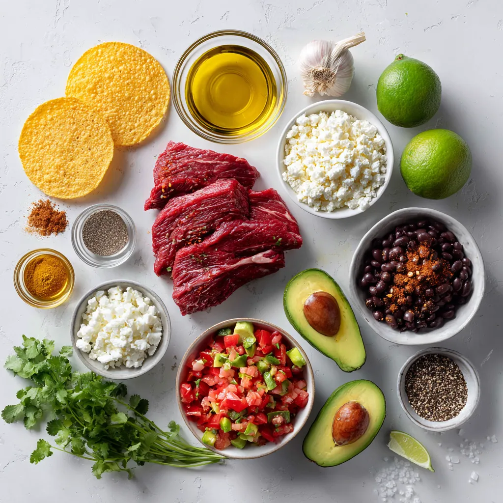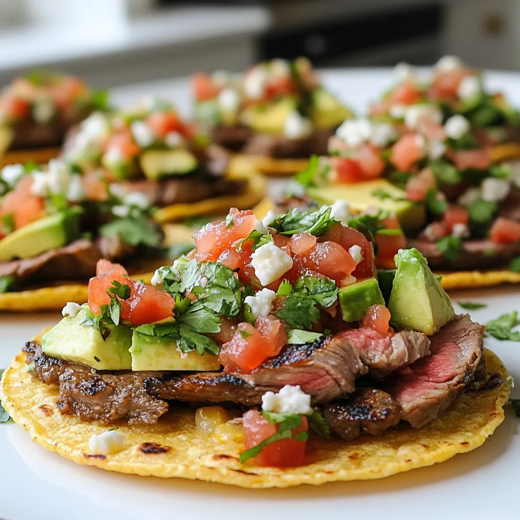 These ingredients create a tasty and filling meal. The flank steak gives a rich flavor. The tostadas add a crisp texture. The refried beans make each bite creamy. Fresh pico de gallo and avocado bring brightness.