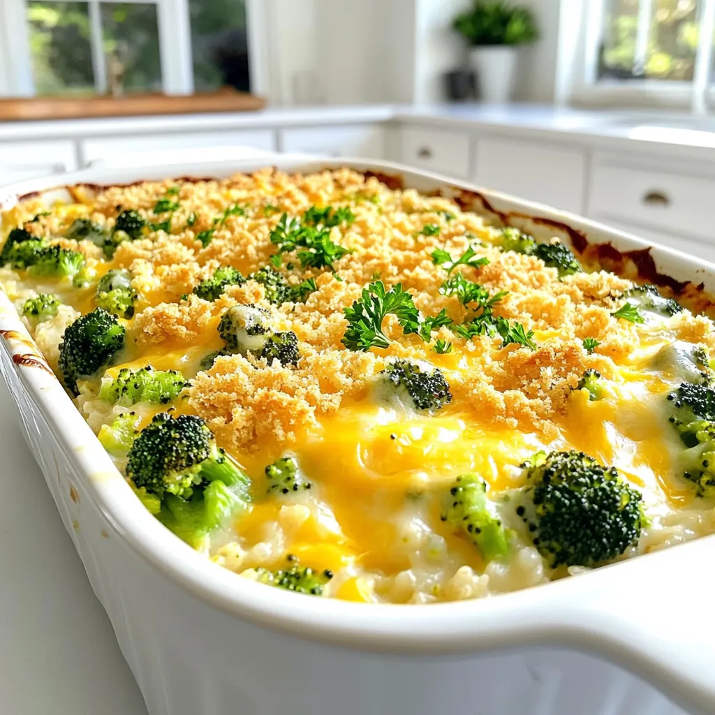 - 1 cup uncooked brown rice - 2 cups vegetable broth - 2 cups fresh broccoli florets - 1 cup shredded cheddar cheese - 1 cup milk (dairy or plant-based) - 1/2 cup cream cheese - 1 small onion, finely chopped - 2 cloves garlic, minced - 1 teaspoon paprika - Salt and pepper to taste - 1/2 cup breadcrumbs (for topping) - 2 tablespoons olive oil When I cook Cheesy Broccoli Rice Casserole, I focus on fresh, quality ingredients. The brown rice gives a nutty flavor and chewy texture. For the broth, I use vegetable broth to keep it light and tasty. Fresh broccoli florets add a bright crunch, making each bite special. Cheddar cheese is key here. It melts beautifully and adds a creamy richness. I also use cream cheese for extra smoothness. You can choose milk, either dairy or plant-based, based on your preference. Onion and garlic bring warmth and depth to the dish. I finely chop the onion to soften quickly. Minced garlic adds a punch of flavor. I season with paprika, salt, and pepper to enhance all the flavors. Finally, I top the dish with breadcrumbs for that golden, crispy finish. It all comes together for a comforting meal! - First, heat 2 tablespoons of olive oil in a large pot over medium heat. - Next, add 1 small chopped onion. Sauté for 3-4 minutes until it turns clear. - Then, add 2 cloves of minced garlic. Cook for 1-2 minutes until it smells good. - Stir in 1 cup of uncooked brown rice, 2 cups of vegetable broth, and 1 cup of milk. - Bring this mix to a gentle boil. - Once it boils, reduce the heat to low. Cover the pot and let it simmer. - Cook for about 30 minutes until the rice is soft and most liquid is gone. - Stir it now and then to stop it from sticking. - After the rice is done, add 2 cups of fresh broccoli florets. - Mix in 1/2 cup of cream cheese, 1 cup of shredded cheddar cheese, and 1 teaspoon of paprika. - Add salt and pepper to taste. Stir until the cheese melts and everything mixes well. - Preheat your oven to 350°F (175°C). - Grease a baking dish before pouring in the rice and broccoli mix. - Smooth the top with a spatula for even cooking. - Sprinkle 1/2 cup of breadcrumbs on top for a nice crunch. - Bake for 25-30 minutes until the top is golden and bubbly. - Let it cool for a few minutes before serving. To ensure your rice is tender, cook it gently. Use two cups of vegetable broth for flavor. Stir the mixture occasionally while it simmers. This helps the rice cook evenly. For a creamy consistency, add both cream cheese and cheddar. They melt beautifully and give a rich taste. Adding spices like paprika brightens the dish. You can also try garlic powder or onion powder for more flavor. If you want a twist, switch up the cheese! Try mozzarella or gouda for a different taste. For a beautiful presentation, sprinkle fresh parsley on top before serving. This adds color and freshness. Pair your casserole with a crisp salad or steamed veggies for a full meal. Enjoy every bite! {{image_2}} You can change the rice in this recipe. Use white rice for a quicker cook time. Quinoa or cauliflower rice are great options too. They add different flavors and textures. Changing the vegetables also works well. Try carrots, peas, or bell peppers. They add color and nutrients. You can even mix in spinach for extra greens. If you need a dairy-free option, use plant-based milk and cheese. Almond milk or oat milk are excellent choices. Look for dairy-free cream cheese too. This swap keeps the dish creamy and tasty. For gluten-free needs, skip breadcrumbs or use gluten-free ones. This keeps the crispy topping while being safe for gluten-free diets. You can make this casserole ahead of time. Prepare it up to the baking step. Store it covered in the fridge for one day. When you're ready, bake it as usual. To reheat, place the casserole in the oven at 350°F. Cover it with foil to keep it moist. Heat for around 20 minutes, or until warm. Enjoy the cheesy goodness again! To store your Cheesy Broccoli Rice Casserole, let it cool first. Use an airtight container for the best results. This keeps it fresh and tasty. You can keep leftovers in the fridge for up to 4 days. If you want to enjoy it later, proper storage is key. If you want to freeze the casserole, let it cool completely. Then, wrap it tightly in plastic wrap and foil. This helps avoid freezer burn. You can freeze it for up to 3 months. To thaw, place it in the fridge overnight. When you’re ready to enjoy it, reheat in the oven at 350°F (175°C) until hot. To prevent sogginess, do not add too much liquid. Make sure the rice absorbs it all during cooking. For flavor, make sure to season well with salt and pepper. Try to mix the cheese well so every bite is cheesy and delicious. Yes, you can use white rice instead of brown. It cooks faster but may not have the same nutty flavor. Use the same amount of rice. Adjust the cooking time to around 15-20 minutes. Check the texture often to avoid overcooking. To reheat the casserole, place it in the oven at 350°F (175°C) for about 15-20 minutes. Cover it with foil to keep it moist. You can also use the microwave. Heat in short bursts, stirring in between, until warm. This casserole goes well with a fresh side salad. You can also serve it with grilled chicken or fish for added protein. Roasted vegetables can be a nice touch too. The total time is about 1 hour. It takes 15 minutes to prep and 30 minutes to cook the rice. Baking adds another 25-30 minutes for a golden top. Yes, you can add protein! Cooked chicken, turkey, or even beans work great. Stir in the protein after mixing in the cheese. This will add flavor and make it a heartier meal. Cheesy Broccoli Rice Casserole is simple and tasty. You only need a few key ingredients, like uncooked brown rice and fresh broccoli. We went over how to prepare and bake it step by step. Remember to consider texture and flavor by choosing the right spices and cheeses. Feel free to make swaps for your diet needs or meal prep. With these tips, you can enjoy thi