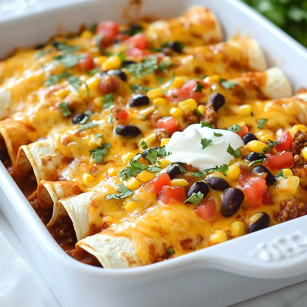 Delicious enchiladas filled with seasoned ground beef, black beans, corn, and cheese, topped with enchilada sauce and more cheese.