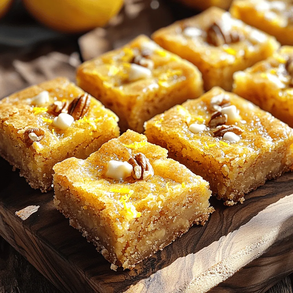 - 1 cup unsalted butter, melted - 1 ½ cups brown sugar, packed - 2 large eggs - 1 tablespoon vanilla extract - Zest of 2 lemons - ½ cup fresh lemon juice - 1 ½ cups all-purpose flour - ½ teaspoon baking powder - ½ teaspoon salt - 1 cup white chocolate chips - ½ cup chopped pecans (optional) You can swap unsalted butter with coconut oil or vegetable oil. This will change the flavor a bit, but it works. If you want to cut sugar, use maple syrup or honey. Keep in mind that you might need less liquid in your mix. For eggs, a banana or applesauce can work well. Use ¼ cup of either for each egg. This will make your blondies moist and tasty. Fresh lemon juice has a bright, lively flavor. It gives your blondies a zesty kick. Bottled lemon juice is convenient but lacks intensity. I recommend using fresh juice and zest for the best taste. When you can, always choose fresh lemons for your baking. They truly make a difference in your dish. To start, preheat your oven to 350°F (175°C). This helps your blondies bake evenly. While the oven heats, grease a 9x13 inch baking dish. You can also line it with parchment paper for easy removal later. Next, mix the wet ingredients. In a large bowl, combine 1 cup of melted unsalted butter with 1 ½ cups of packed brown sugar. Whisk them together until smooth. Then, add 2 large eggs, one at a time, mixing well after each addition. Stir in 1 tablespoon of vanilla extract. Don’t forget to add the zest of 2 lemons and ½ cup of fresh lemon juice. This gives your blondies a bright, zesty flavor! Now, let’s combine the dry ingredients. In a separate bowl, whisk together 1 ½ cups of all-purpose flour, ½ teaspoon of baking powder, and ½ teaspoon of salt. This ensures that your blondies rise well. Gradually fold the dry mixture into the wet mixture. Do this gently until just combined. Be careful not to overmix, or your blondies may become tough. After that, fold in 1 cup of white chocolate chips and, if you like, ½ cup of chopped pecans. This adds a nice crunch! Pour your batter into the prepared baking dish. Spread it out evenly. Now, it’s time to bake! Place the dish in your preheated oven and bake for 25-30 minutes. The edges should turn lightly browned. To check for doneness, insert a toothpick into the center. It should come out with a few moist crumbs, not wet batter. Once baked, remove the dish from the oven. Let it cool in the pan for about 15 minutes. After that, transfer the blondies to a wire rack to cool completely. Once cooled, cut them into squares and enjoy your delicious chewy lemon blondies! For the full recipe, refer back to the ingredients and instructions provided. To get the best chewy texture, watch out for signs of overmixing. Overmixing can make your blondies tough. Mix only until the dry ingredients combine with the wet ingredients. The batter should look thick and slightly lumpy. Cooling time is also key. Let the blondies cool for about 15 minutes in the pan. This helps them set properly. If you cut them too early, they may crumble. You can boost the flavor by adding a splash of vanilla extract. It works well with lemon. You may also add extra lemon zest for a stronger citrus taste. Consider pairing your blondies with toppings. A simple lemon glaze can make them even more delightful. You can also serve them with whipped cream or fresh berries for a fun twist. For baking, a 9x13 inch baking dish works best. This size gives the blondies even thickness. You can also use glass, metal, or ceramic, but adjust the baking time as needed. Essential tools for this recipe include a whisk for mixing and a rubber spatula for folding. A toothpick is great to test for doneness. Always prepare your baking dish by greasing it or using parchment paper. This step makes it easier to remove the blondies later. Try this simple yet rewarding recipe for chewy lemon blondies. You’ll love the bright taste and texture! For the full recipe, check out the section above. {{image_2}} You can switch up the flavor of your chewy lemon blondies. Adding other citrus fruits like lime or orange gives a new twist. Simply replace some lemon juice and zest with your chosen fruit. This adds a unique taste while keeping it bright and tangy. You can also play with spices. A pinch of cinnamon or ginger can warm up the flavor. Try adding cardamom for an exotic touch. These small changes can make a big difference in taste. Want a gluten-free option? You can use almond flour or a gluten-free flour blend instead of all-purpose flour. This keeps the blondies chewy and delicious without the gluten. If you follow a vegan diet, you can replace eggs with flax eggs. Mix one tablespoon of ground flaxseed with three tablespoons of water. Let it sit for a few minutes to thicken. Use this mix in place of each egg for a perfect vegan blondie. Mix-ins can take your blondies to the next level. You can use dark chocolate chips or milk chocolate chips instead of white chocolate. Each type adds its own special flavor. Dried fruits like cranberries or apricots also make great additions. They add a chewy texture and a bit of sweetness. Nuts like walnuts or almonds can bring in a nice crunch. Choose what you love to make your blondies even more fun. For the full recipe, check out the earlier section. To keep your chewy lemon blondies fresh, use an airtight container. Glass or plastic containers work well. You can also use foil or plastic wrap if you don't have one. Blondies can stay at room temperature for up to three days. If you want to keep them longer, store them in the fridge. They will last for about a week in the fridge. Just remember, cold blondies might lose some of their soft texture. You can freeze chewy lemon blondies for later enjoyment. First, let them cool completely. Then, cut them into squares. Wrap each square tightly in plastic wrap. After that, place them in a freezer-safe bag or container. They will stay fresh for up to three months in the freezer. To enjoy, take out the