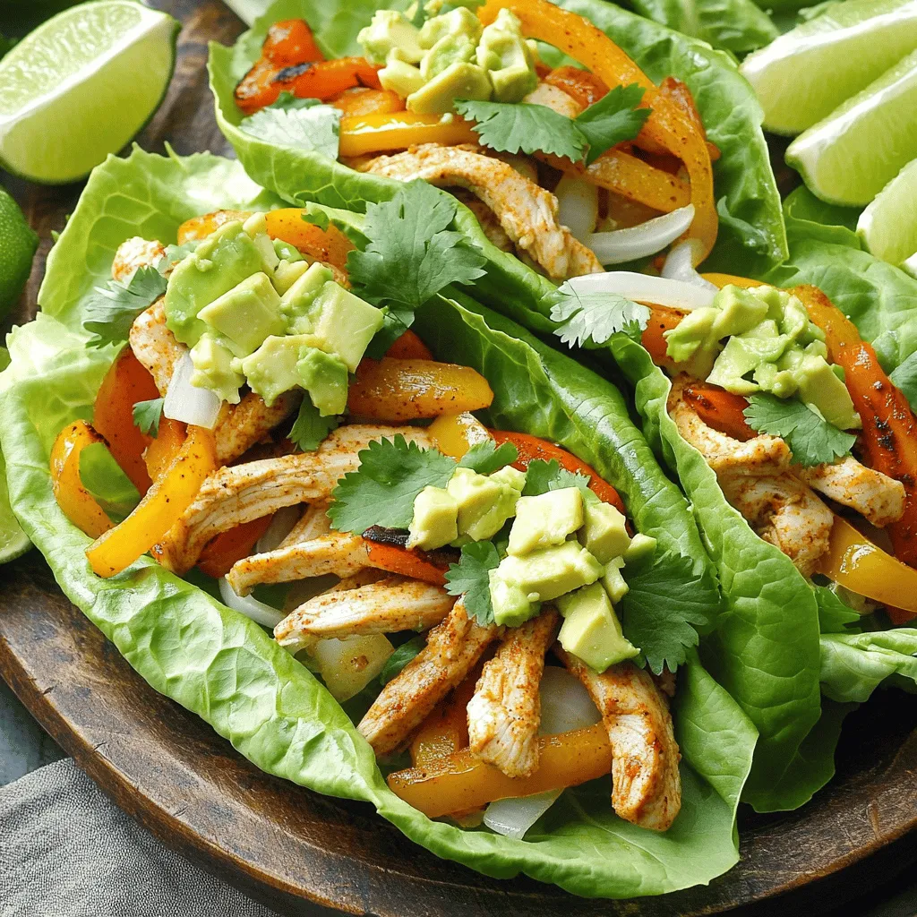 ![- Chicken breasts - Spices and seasonings - Fresh vegetables - Lettuce options To make Chicken Fajita Lettuce Wraps, you need some key ingredients. Start with chicken breasts. Use two, sliced into thin strips. This keeps the chicken tender and easy to eat. Next, gather your spices. Chili powder, cumin, and smoked paprika bring great flavor. Don't forget garlic powder, salt, and pepper for extra taste. Fresh vegetables are a must. You will need one bell pepper—choose red or yellow—and one medium onion. Slice both thinly to help them cook quickly. Finally, get your lettuce. Romaine or butter lettuce works best. These leaves are sturdy and hold the filling well. - Diced avocado - Fresh herbs - Lime wedges For added flavor, consider some optional toppings. Diced avocado adds creaminess. Fresh herbs like cilantro enhance the dish. Lastly, lime wedges provide a zesty kick. Squeeze some over your wrap before you eat. This meal is fresh and full of flavor! For the full recipe, check the detailed instructions in [Full Recipe]. To start, marinate the chicken with spices. In a bowl, mix the sliced chicken with olive oil, chili powder, cumin, smoked paprika, garlic powder, salt, and pepper. Make sure each piece is well coated. This marinade adds a lot of flavor. Let it sit for 10-15 minutes, if possible. The best way to cook chicken for fajitas is in a hot skillet. This method helps create a nice sear. The heat brings out the spices and gives the chicken a great texture. Heat a large skillet over medium-high heat. Once hot, add the seasoned chicken. Cook for about 5-7 minutes. Stir occasionally to ensure even cooking. The chicken should be browned and fully cooked. When the chicken is nearly done, add the sliced bell pepper and onion. Sauté for another 3-4 minutes. You want the veggies to be tender but still crisp. They should get a bit charred for more flavor. Now it’s time to assemble the wraps. Take a leaf of romaine or butter lettuce. Spoon some of the chicken and vegetable mix onto the center of the leaf. Top it with diced avocado and a sprinkle of fresh cilantro. This adds a refreshing touch. Squeeze a lime wedge over the filling for extra flavor. Fold the lettuce over the filling to create your wrap. For a nice presentation, arrange the filled wraps on a platter. Garnish with lime wedges and extra cilantro. This makes the dish colorful and inviting. For the full recipe, check the instructions provided above! To ensure your chicken is tender, start with fresh, high-quality chicken breasts. Slice them thinly so they cook evenly. Marinating the chicken in oil and spices helps keep it moist. Cook on medium-high heat for about 5-7 minutes. This way, it stays juicy and full of flavor. To avoid soggy lettuce, choose sturdy leaves like romaine or butter lettuce. Rinse them gently and dry them well. If you use damp leaves, the wraps will get soggy quickly. Hold the wraps upright on a plate to keep them crisp until serving. For the best accompaniments, serve your wraps with fresh avocado, lime wedges, and chopped cilantro. These add bright flavors and textures to each bite. You can also include salsa or sour cream on the side for extra dipping. Pair your Chicken Fajita Lettuce Wraps with refreshing drinks. I recommend iced tea, lemonade, or a light beer. These beverages complement the spicy flavors and coolness of the wraps. Enjoy the full recipe for a delightful meal that everyone will love. {{image_2}} You can switch the chicken for turkey or beef. Ground turkey works well in this dish. It cooks quickly and absorbs the spices nicely. If you prefer beef, use flank steak or sirloin. Slice it thin for the best texture. For a vegetarian option, try using black beans or tofu. Both add protein and soak up flavors well. Adding different spices can change the entire dish. Try smoked paprika for a deeper flavor. You might also enjoy taco seasoning for a twist. Incorporating sauces can enhance the taste too. A splash of hot sauce adds heat, while a drizzle of lime crema gives creaminess. Each option offers a fun way to customize your wraps. For more ideas, check out the Full Recipe. To store your Chicken Fajita Lettuce Wraps, keep them in an airtight container. This helps to keep them fresh. Place the container in your fridge right away. You can safely store leftovers for up to three days. After that, the taste and texture may change. When you reheat your wraps, avoid using the microwave if possible. A skillet works best to keep the chicken tender. Warm the chicken over low heat, stirring gently. This helps maintain moisture. Always check that the chicken reaches at least 165°F to ensure it is safe to eat. For best results, eat leftovers within three days for great flavor. You can find the full recipe to make more Chicken Fajita Lettuce Wraps anytime! Yes, you can prepare Chicken Fajita Lettuce Wraps ahead of time. Cook the chicken and veggies first. Store them in an airtight container in the fridge for up to three days. When you are ready to eat, just heat the filling and assemble the wraps. This makes meal prep easy and quick. Romaine lettuce and butter lettuce work best for wraps. They have sturdy leaves that hold the filling well. Romaine gives a nice crunch, while butter lettuce offers a softer texture. Both types add freshness to your meal. Yes, Chicken Fajita Lettuce Wraps are low in carbs. Instead of tortillas, you use lettuce leaves. This swap cuts down on carbohydrates while still giving you a tasty dish. It’s a great option for those watching their carb intake. Absolutely! You can swap chicken with beef, turkey, or shrimp. Each option brings a new flavor. For a vegetarian twist, try using black beans or grilled tofu. This makes the recipe flexible for different diets. You can add many toppings to your wraps. Avocado adds creaminess. Fresh cilantro gives a burst of flavor. Sliced jalapeños can add heat. Lime wedges are great for brightness, enhancing every bite. To store leftover wraps, 