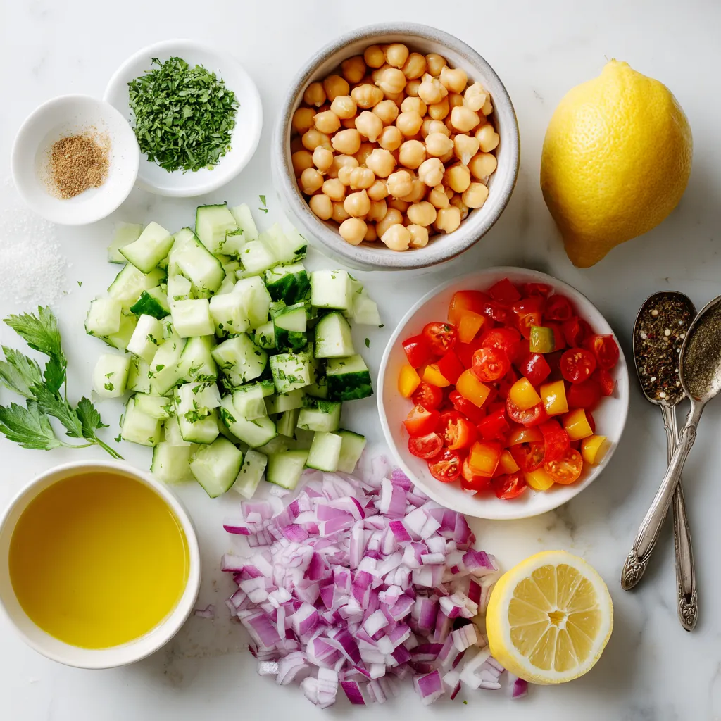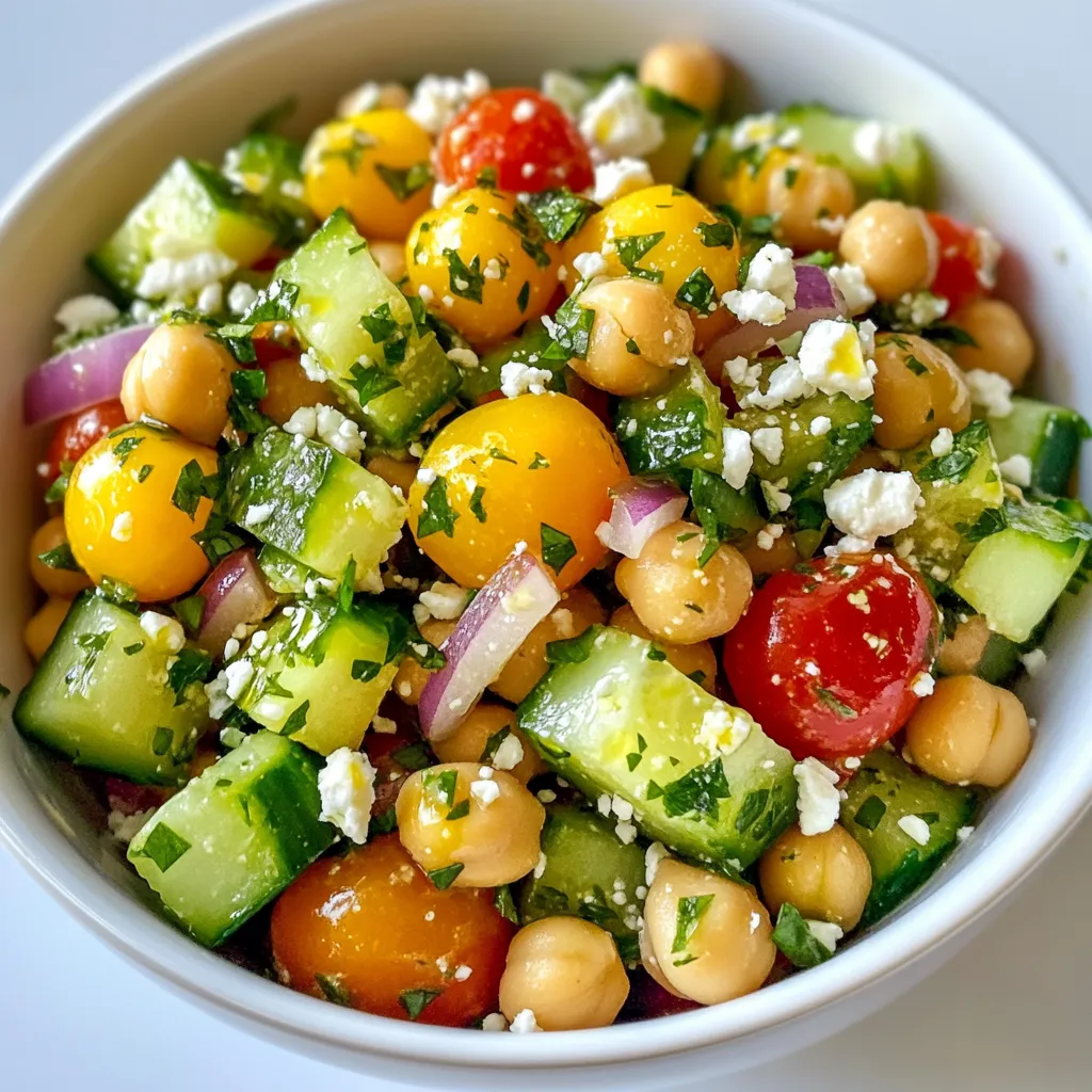 A refreshing salad featuring chickpeas, cucumbers, and a zesty dressing.