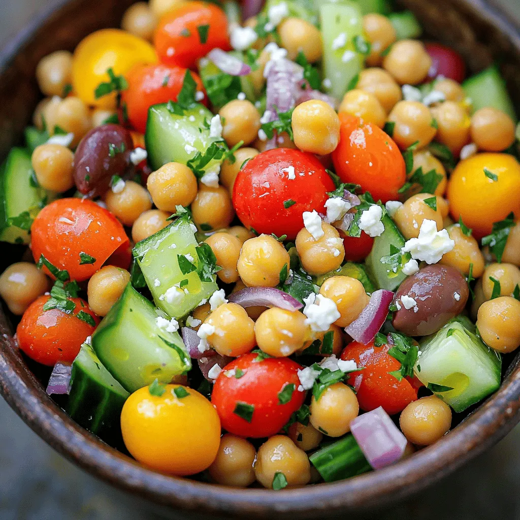 ![- 1 can (15 oz) chickpeas, drained and rinsed - 1 cup cherry tomatoes, halved - 1 cucumber, diced - 1 bell pepper (red or yellow), diced - 1/2 red onion, finely chopped - 1/2 cup Kalamata olives, pitted and halved - 1/2 cup feta cheese, crumbled - 1/4 cup fresh parsley, chopped This salad starts with chickpeas. They give it a nice, nutty taste. You can use canned chickpeas for ease. Next, we add colorful veggies. Cherry tomatoes and cucumbers add freshness. Diced bell pepper gives a sweet crunch. The red onion adds a sharp bite. Kalamata olives bring a briny flavor. Lastly, feta cheese adds creaminess and tang. Fresh parsley adds a bright note. - 1/4 cup olive oil - 2 tablespoons lemon juice - 1 teaspoon dried oregano - Salt and pepper to taste The dressing is simple yet flavorful. Olive oil is the base. It adds richness and smoothness to the salad. Fresh lemon juice brightens the dish. Dried oregano gives it a warm, herby taste. Don’t forget salt and pepper. They enhance all the flavors and bring the salad to life. 1. In a large bowl, combine the chickpeas, cherry tomatoes, cucumber, bell pepper, red onion, Kalamata olives, and feta cheese. 2. In a small bowl, whisk together the olive oil, lemon juice, dried oregano, salt, and pepper to create a dressing. Mixing these base ingredients in one bowl makes it easy. You can see all the vibrant colors. Whisking the dressing in another bowl ensures it blends well. This little step helps the flavors mix just right. 1. Pour the dressing over the salad ingredients and toss gently until everything is well combined. 2. Add the chopped parsley and toss again to disperse the herbs evenly throughout the salad. 3. Refrigerate the salad for about 30 minutes to allow the flavors to meld together. 4. Before serving, give the salad a gentle stir and adjust seasoning if needed. Tossing the salad is important. You want every bite to have the dressing. Chilling it for 30 minutes helps the flavors mix and taste better. A gentle stir before serving ensures it stays fresh and bright. If you need to, add more salt or pepper. For the Full Recipe, check the detailed steps and tips. Enjoy your fresh and flavorful Chickpea Mediterranean Salad! To get the best flavor from your Chickpea Mediterranean Salad, use fresh ingredients. Fresh herbs, like parsley, add a bright touch. Ripe cherry tomatoes bring sweetness. Don't skip the feta; it adds a creamy bite. For ingredient substitutions, feel free to mix it up. Use black olives if you can’t find Kalamata. Swap out feta with goat cheese for a different flavor. You can also try other veggies, like zucchini or radishes, for added crunch. Serving your salad well makes it even more appealing. Use a large, colorful bowl to highlight the bright ingredients. When you serve, sprinkle some extra feta on top. It adds a nice touch. To enhance visual appeal, try adding colorful herbs like basil or mint. A drizzle of olive oil on top can make it shine. Consider serving the salad on a bed of greens for a lovely contrast. You can change the flavor of your Chickpea Mediterranean Salad by swapping ingredients. Instead of chickpeas, try black beans or white beans. They offer a different taste and texture while still being healthy. If you want to use seasonal vegetables, think about adding fresh corn in summer or roasted root veggies in fall. These swaps keep your salad exciting and fresh. You can easily adjust this salad to fit your diet. To make it vegan, skip the feta cheese. You can replace it with avocado or a sprinkle of nutritional yeast for a cheesy flavor. For a gluten-free option, check your olives and dressing to ensure they are gluten-free. If you want to lower the fat and sodium, you can use less olive oil and skip the salt. These changes keep your salad tasty while meeting your dietary needs. {{image_2}} To keep your Chickpea Mediterranean Salad fresh, store leftovers in an airtight container. This helps prevent moisture loss and keeps the flavors bright. You can use glass or plastic containers with tight-fitting lids. Make sure to let the salad cool to room temperature before sealing it up. This step avoids condensation, which can make the salad soggy. The salad lasts about three to four days in the fridge. Keep it stored at a consistent temperature to maintain its freshness. If you need to store it longer, consider freezing it. However, note that freezing can change the texture of some ingredients. To freeze, place the salad in a freezer-safe container. When ready to eat, thaw it in the fridge overnight. Enjoy your Chickpea Mediterranean Salad fresh, flavorful, and ready to please! Can I make Chickpea Mediterranean Salad ahead of time? Yes, you can. Making the salad a few hours before serving helps the flavors meld. Just store it in the fridge. This salad tastes even better after sitting. What can I serve with this salad? You can serve this salad with grilled chicken, fish, or pita bread. It also pairs well with a light soup. This salad is great as a side or a main dish. Nutritional benefits of chickpeas Chickpeas are high in protein and fiber. They help keep you full, which is good for weight control. They also have vitamins and minerals like iron and magnesium. Health benefits of other ingredients - Cherry tomatoes: Full of vitamin C and antioxidants. - Cucumbers: Hydrating and low in calories. - Olive oil: Contains healthy fats and can reduce heart disease risk. - Feta cheese: Adds calcium and protein but use in moderation. Where to find more Mediterranean recipes You can explore more Mediterranean recipes online. Websites like Mediterranean Living and EatingWell have a wide range of options. Linking to the Full Recipe for more details For the full recipe, check out the [Full Recipe]. It provides step-by-step instructions and tips for success. This blog post shows how to make a Chickpea Mediterranean Salad. We covered key ingredients like chickpeas, fresh herbs, and a tasty dressing of olive oil and lemon juice. You