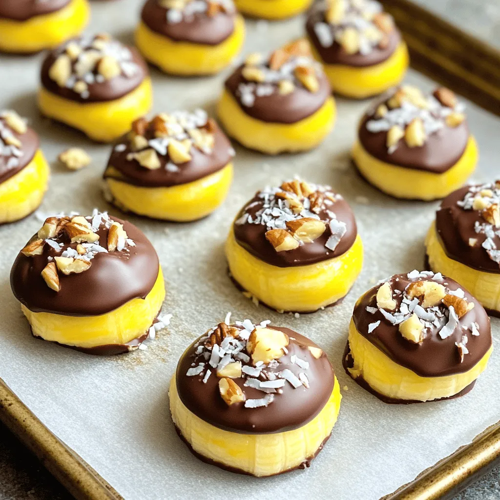 Now, dip each banana slice into the melted chocolate. Make sure they are fully covered. Allow any extra chocolate to drip off. Place them back on the parchment paper. If you like, add toppings right away. Chopped nuts, shredded coconut, or a sprinkle of sea salt work great. After that, chill the baking sheet in the freezer for 15-20 minutes. This helps the chocolate set and harden. Enjoy your yummy creation right away or keep them in the freezer for later.