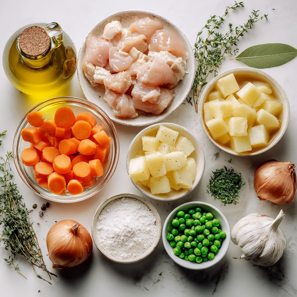 To start, gather all your ingredients. You need chicken thighs, carrots, potatoes, onion, garlic, chicken broth, frozen peas, olive oil, thyme, bay leaf, salt, and pepper. If you want a thicker stew, grab cornstarch. Also, have fresh parsley for garnish.