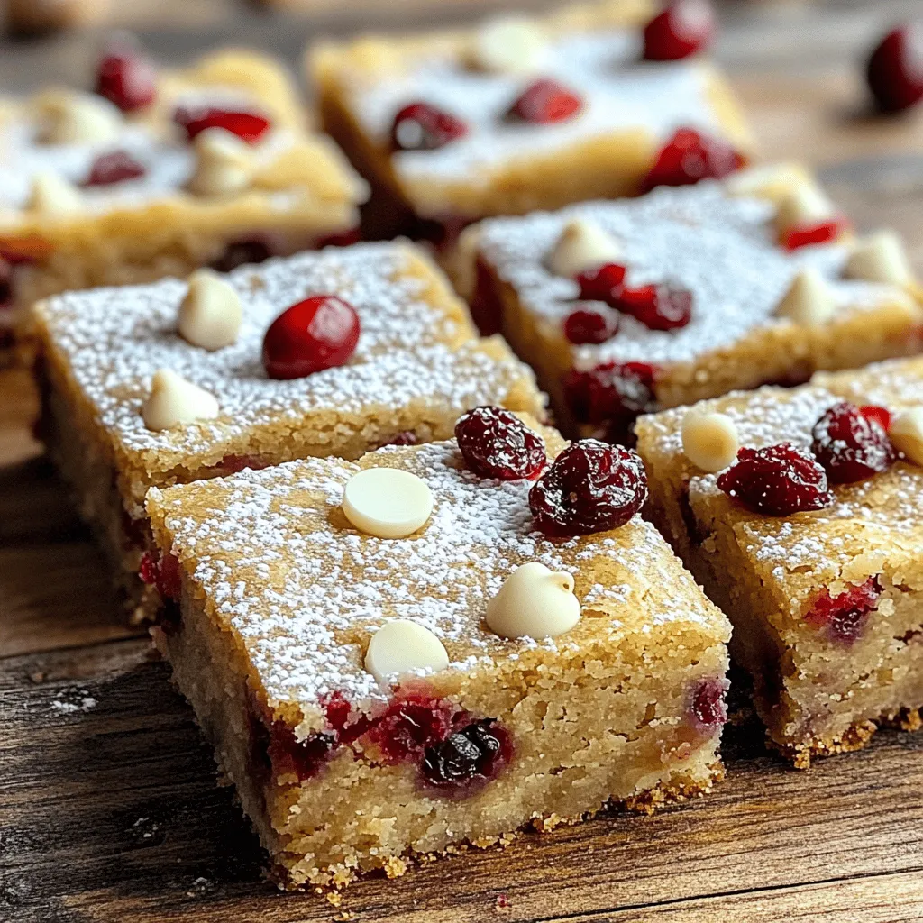 After baking, remove the pan from the oven. Let it cool for about 10 minutes. If you used parchment paper, lift the blondies out carefully. Place them on a wire rack to cool completely. Once cooled, cut them into squares. For a fun touch, dust with powdered sugar and add extra cranberries and white chocolate chips on top. Enjoy your sweet and chewy treat!
