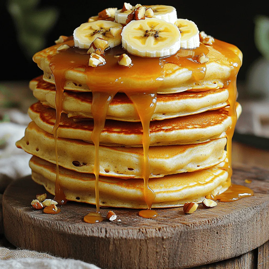 Each ingredient is important. The flour gives structure, while the sugar adds sweetness. Baking powder and baking soda help the pancakes rise. Salt balances the flavors. Buttermilk makes the pancakes soft and fluffy. The bananas add natural sweetness and moisture. The melted butter gives richness, and vanilla adds a lovely aroma. Finally, the caramel sauce drizzled on top makes them a true treat. Don’t forget your toppings for extra flavor and crunch!