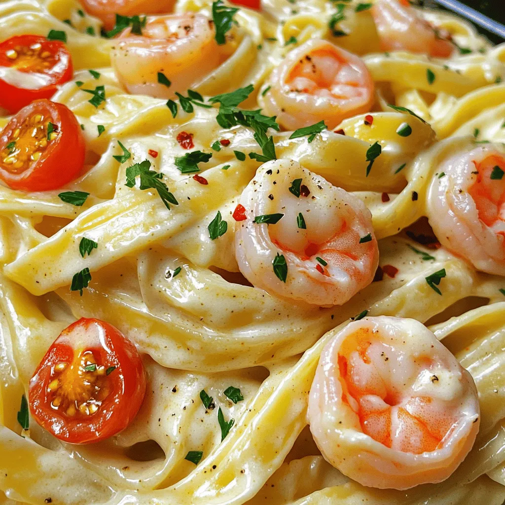 - 8 oz fettuccine pasta - 1 lb large shrimp, peeled and deveined - 2 tablespoons Cajun seasoning - 1 cup heavy cream - 1 cup grated Parmesan cheese - 1/2 cup cherry tomatoes, halved - 1/4 cup parsley, chopped The main ingredients for Creamy Cajun Shrimp Alfredo include fettuccine pasta and large shrimp. Fettuccine has a wide shape that holds the sauce well. It is easy to cook and pairs perfectly with creamy sauces. Shrimp adds protein and flavor to the dish. Peeled and deveined shrimp cooks quickly and looks great on the plate. Next, seasonings and sauces elevate the dish. Cajun seasoning brings bold flavors and a hint of spice. Heavy cream makes the sauce rich and smooth. Grated Parmesan cheese adds a salty, nutty taste. Together, these ingredients create a delightful blend that coats the pasta beautifully. Finally, we have vegetables and garnish. Cherry tomatoes add a pop of color and sweetness. They also bring freshness to the dish. Chopped parsley gives a bright finish and a hint of earthiness. Using these ingredients makes your dish not only tasty but also visually appealing. To cook the fettuccine, start with a large pot of salted water. Bring it to a boil. Add the fettuccine and cook it until it's al dente. This usually takes about 8 to 10 minutes, but check the package for specific times. Drain the pasta well but save 1/2 cup of that starchy pasta water. This water is essential later for the sauce. First, take your peeled and deveined shrimp and place them in a bowl. Sprinkle 2 tablespoons of Cajun seasoning over the shrimp. Toss them well to make sure each shrimp is coated in the seasoning. This step adds flavor and a nice kick. Next, heat 2 tablespoons of olive oil in a large skillet over medium-high heat. Add the shrimp and cook them for about 2 to 3 minutes on each side. They should turn pink and opaque. Once done, remove them from the skillet and set them aside. In the same skillet, add 3 cloves of minced garlic. Sauté it for about 30 seconds until it smells great. This step adds depth to the sauce. Then, lower the heat to medium and pour in 1 cup of heavy cream. Stir it well and let it come to a gentle simmer. Gradually whisk in 1 cup of grated Parmesan cheese until it melts and gets creamy. If the sauce is too thick, add a little of that reserved pasta water to reach your preferred consistency. Finally, toss in 1/2 cup of halved cherry tomatoes for a pop of color and flavor. Timing is key when combining the pasta and shrimp with the sauce. Add the cooked fettuccine and shrimp to the skillet. Toss everything to coat well in the sauce. Cook for another 2 to 3 minutes until everything is heated through. Taste and add salt and pepper to your liking. If you want extra heat, sprinkle on some red pepper flakes. Enjoy every creamy bite! To create a creamy sauce, I recommend using heavy cream brands like Land O'Lakes or Horizon Organic. These brands provide a rich texture. If the sauce is too thick, add a splash of reserved pasta water. This helps bring the sauce to your desired texture without losing flavor. Adjusting the spice level is easy. Start with two tablespoons of Cajun seasoning. If you love heat, add more. For a milder dish, use less. To enhance flavor, add a squeeze of lemon juice. This brightens the dish and balances the spice. Pair your Cajun shrimp Alfredo with garlic bread or a fresh salad. These sides complement the creamy pasta well. For a fun twist, garnish with lemon wedges or extra parsley. This adds color and freshness to your plate. {{image_2}} If you need a gluten-free meal, you can easily switch your pasta. Here are some great options: - Rice pasta: This has a nice texture and works well in Alfredo. - Zucchini noodles: Spiralized zucchini gives a fresh twist and is low in carbs. For Cajun seasoning, look for gluten-free brands or make your own. Combine these spices for a tasty mix: - Paprika - Onion powder - Garlic powder - Black pepper - Oregano Want to mix it up? You can use other proteins in this dish. - Chicken: Use diced chicken breast instead of shrimp. Cook it the same way, seasoning with Cajun spice. - Sausage: Andouille sausage adds a spicy kick. Slice it up and sauté with the same steps. For a vegetarian option, skip the meat completely. - Mushrooms: Use cremini or portobello for a hearty feel. - Chickpeas: They add protein and texture. Boost the flavor of your Alfredo with some simple additions. - Spinach: Toss in fresh spinach towards the end for a pop of color and nutrition. - Bell peppers: Sauté chopped bell peppers for a sweet crunch. If you love seafood, add scallops or crab for an extra treat. Just cook them gently, then mix with the sauce. Enjoy the blend of flavors! To keep your creamy Cajun shrimp Alfredo fresh, store it properly. First, let the dish cool to room temperature. Then, transfer it to an airtight container. This helps prevent odors from other foods. Use glass or BPA-free plastic containers for storage. Glass containers are great for reheating. Label the container with the date. This way, you know when to use it. Aim to eat leftovers within three days for the best taste. When reheating Alfredo, avoid clumping. Add a splash of milk or cream to the dish. This keeps the sauce creamy. You can reheat in the microwave or on the stovetop. For the microwave, use a microwave-safe dish. Heat in short bursts, stirring often. This helps distribute heat evenly. For stovetop heating, use low heat. Stir gently and add liquid as needed. This keeps the dish from getting too thick. Yes, you can freeze creamy pasta dishes! However, the texture may change a bit. To freeze, put the cooled Alfredo in a freezer-safe container. Make sure to leave some space, as it will expand. When you’re ready to eat, thaw it in the fridge overnight. Reheat slowly on the stovetop with a splash of cream. This helps revive the creamy texture. Yes, you can prep this dish in advance. Here’s how: - Cook the pasta: Make the fettuccine and store it in the fridge. - 