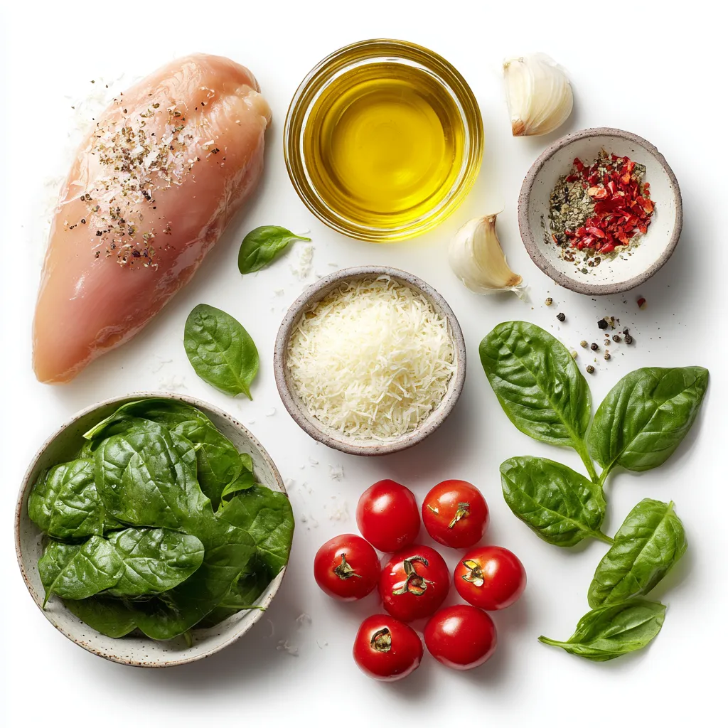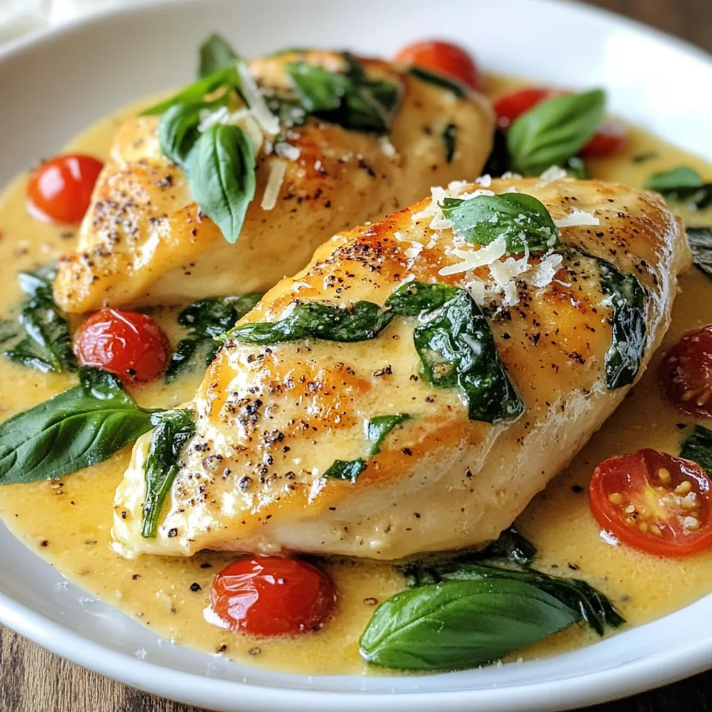 A delicious and creamy chicken dish with garlic, spinach, and tomatoes.