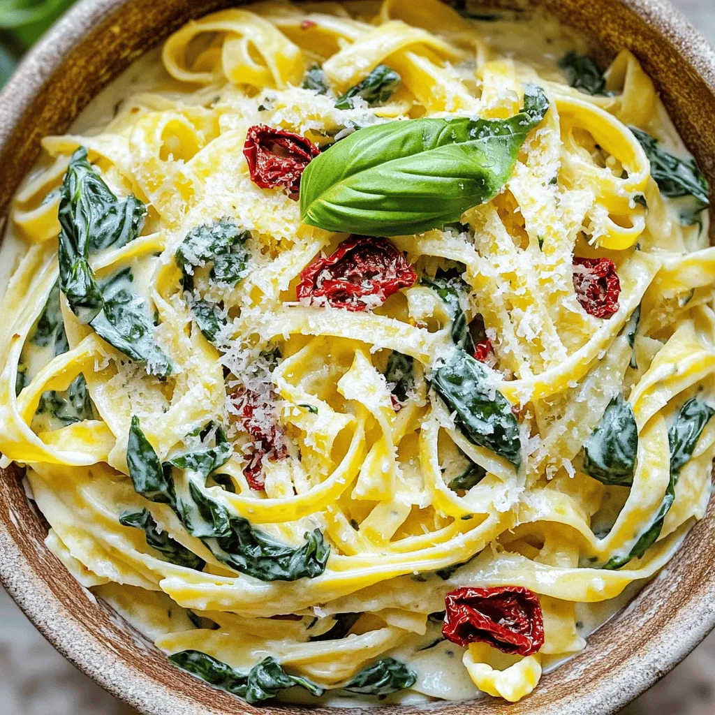 This recipe shows how to make Creamy Spinach Sun-Dried Tomato Pasta easily. You start by cooking pasta, then create a creamy sauce with fresh ingredients. You can choose different pasta or add proteins for variety. Remember, leftover pasta can be stored and reheated well. Enjoy your creamy dish with fresh garnishes for a beautiful finish. Cooking is fun, and this dish is sure to impress!