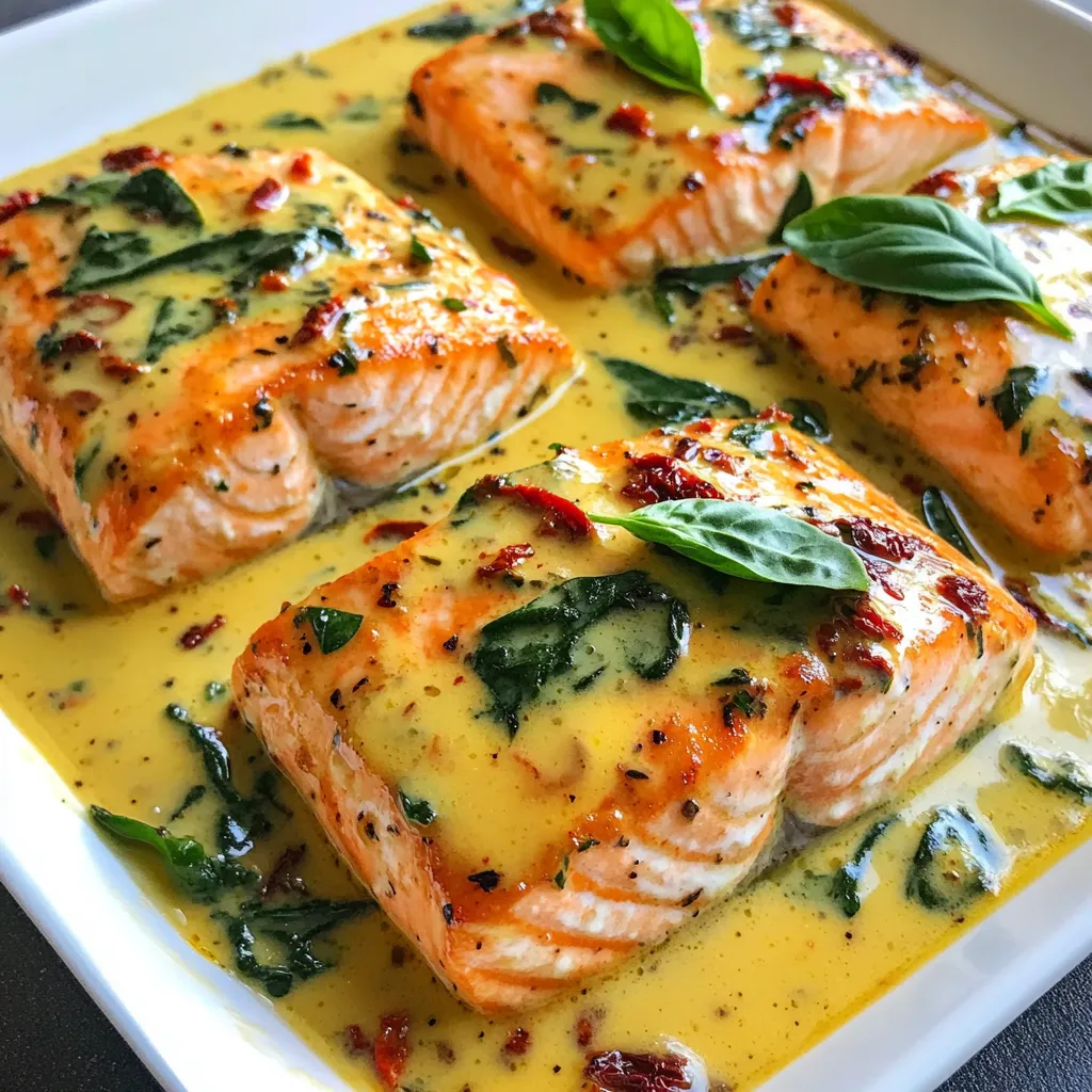 When picking salmon, look for bright color and firm texture. Fresh salmon gives the best taste. Use good quality olive oil for a rich flavor. Minced garlic adds a nice kick. Spinach should be fresh and vibrant. Sun-dried tomatoes should be soft and flavorful. Heavy cream makes the sauce rich and creamy. Parmesan cheese adds saltiness and depth. Italian seasoning blends herbs for a perfect taste. Fresh basil leaves are a nice touch at the end.