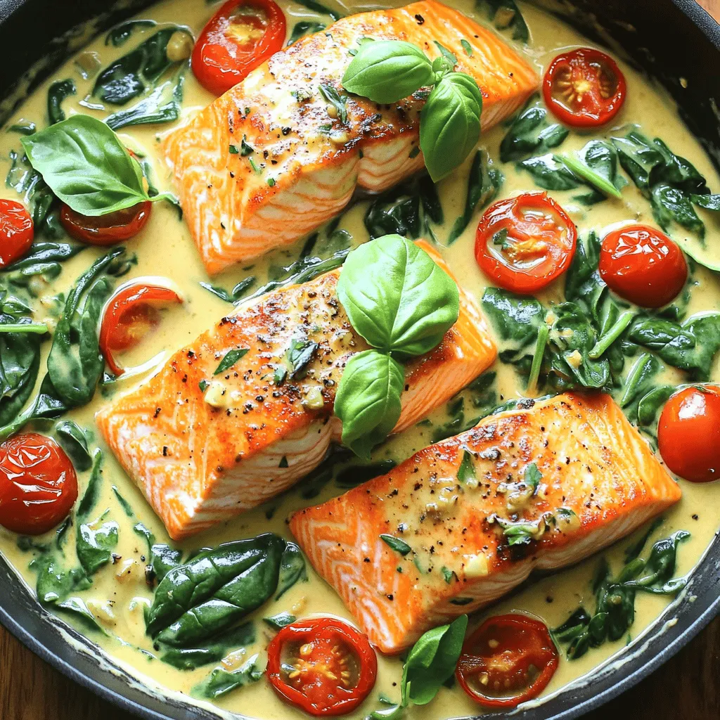 In this recipe, you need fresh salmon fillets. They are the star of the dish. Choose fillets that are bright and firm. Heavy cream adds a rich and creamy touch. It makes the sauce silky smooth. Fresh spinach gives color and nutrition. It also pairs well with the fish. Cherry tomatoes add sweetness and a pop of flavor.