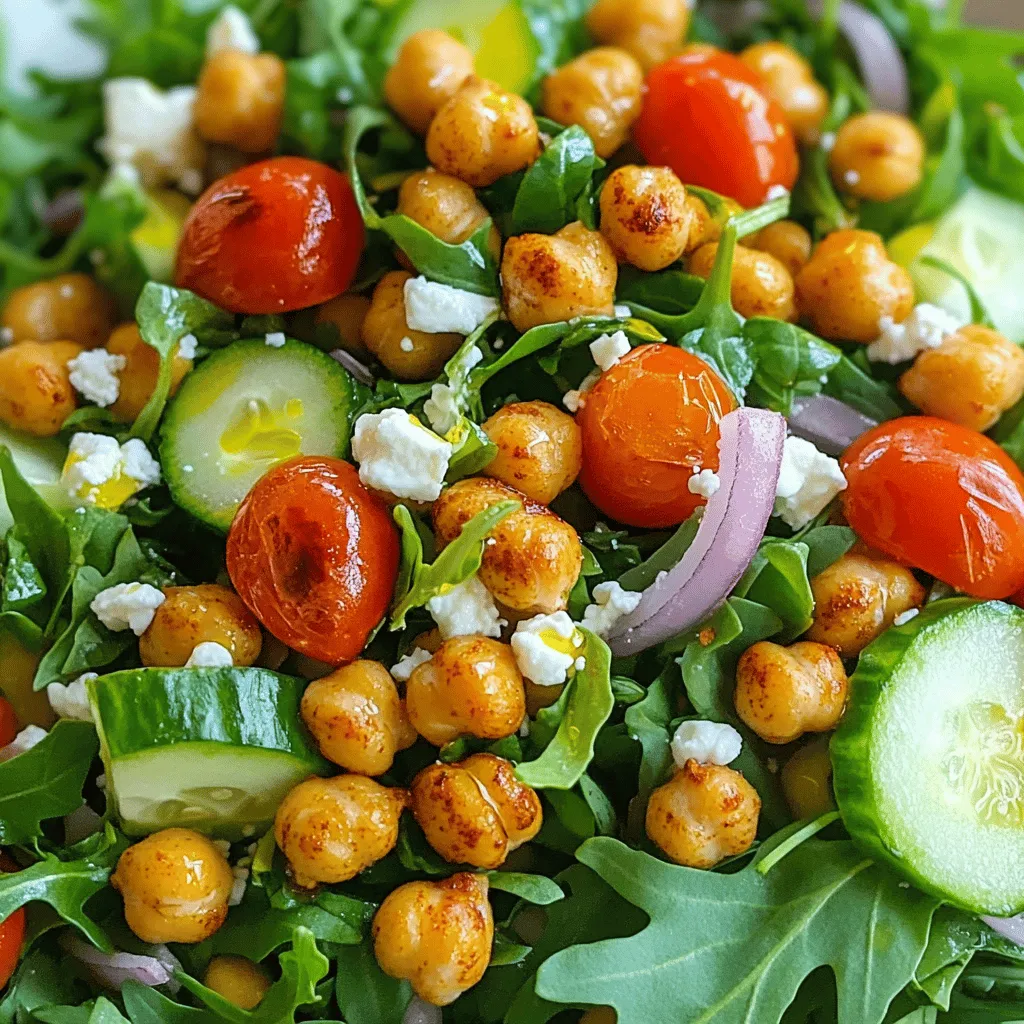 For this salad, you need a few key items. Here’s what you'll use: - 1 can (15 oz) chickpeas, drained and rinsed - 2 tablespoons olive oil - 1 teaspoon smoked paprika - 1/2 teaspoon garlic powder - Salt and pepper to taste - 4 cups mixed salad greens (arugula, spinach, and romaine) - 1 cup cherry tomatoes, halved - 1/2 cucumber, diced - 1/4 red onion, thinly sliced These ingredients come together to create a delightful mix of flavors and textures. You can make this salad your own with some fun add-ins. Here are some options: - 1/4 cup feta cheese, crumbled (optional) - Avocado slices for creaminess - Nuts or seeds for crunch - Bell peppers for extra color Feel free to mix and match based on your taste! The dressing brightens the salad and ties everything together. You only need: - Juice of 1 lemon - Fresh herbs (parsley or cilantro) for garnish This simple dressing brings a fresh zing to your dish. For the full recipe, check out the complete instructions above. First, set your oven to 400°F (200°C). This step is key for crispiness. The high heat will roast the chickpeas perfectly. Next, grab a bowl and add your rinsed chickpeas. Pour in 2 tablespoons of olive oil. Then, sprinkle in 1 teaspoon of smoked paprika and 1/2 teaspoon of garlic powder. Add salt and pepper to taste. Use a spoon to mix everything well. You want each chickpea coated evenly. Now, spread the chickpeas on a baking sheet in a single layer. Roast them for 25–30 minutes. Shake the pan halfway through to help them cook evenly. While the chickpeas roast, prepare your salad. In a large bowl, combine 4 cups of mixed greens, 1 cup of halved cherry tomatoes, 1/2 diced cucumber, and 1/4 thinly sliced red onion. Once the chickpeas are golden and crispy, take them out of the oven. Let them cool for a bit, then add them to your salad mix. Squeeze the juice of 1 lemon over everything and toss gently. If you like, sprinkle 1/4 cup of crumbled feta cheese on top. Finish with fresh herbs like parsley or cilantro for garnish. You can serve this salad right away for that crunch. For the complete recipe, check out the Full Recipe section. Enjoy your flavorful and healthy delight! To get those chickpeas nice and crispy, start with dry ones. Use a clean towel to pat them dry after rinsing. This helps them roast better. Toss the chickpeas with olive oil and spices well. The oil helps them crisp up. Spread them on a baking sheet in one layer. Crowding them makes them steam instead of roast. Bake them at 400°F for 25-30 minutes. Shake the pan halfway through. This helps them cook evenly and get crispy all around. You can boost the flavor of your chickpeas easily. Try adding different spices like cumin or chili powder. These add warmth and depth. You can also mix in some lemon zest for a bright touch. If you want a kick, add a pinch of cayenne pepper. Fresh herbs like parsley or cilantro make a great finish. They add a fresh taste and color. You can also choose to add feta cheese for some creaminess. This salad is great on its own, but you can serve it with many things. It pairs well with grilled chicken or fish. For a heartier meal, add quinoa or brown rice. You can also serve it with a side of pita bread for some crunch. If you want to make it more filling, add sliced avocado. The creamy texture contrasts well with the crispy chickpeas. For the best taste, serve it fresh right after making it. If you want a chill, refrigerate it for a short time before serving. Check out the Full Recipe for more details! {{image_2}} You can boost your crispy chickpea salad by adding protein. Try grilled chicken for a hearty touch. Shrimp works well too, giving a nice flavor. For a meatless option, consider adding tofu. Make sure to season and cook it well to get a nice crust. Lentils can also add protein and texture. Just remember to cook them before adding. This salad is great for all diets. If you want to keep it vegan, skip the feta cheese. You can replace it with avocado for creaminess. Nutritional yeast gives a cheesy flavor without dairy. If you want a different twist, add a scoop of hummus on top. It adds richness and pairs well with the salad. You can change this salad with seasonal ingredients. In spring, use fresh peas or radishes for crunch. Summer calls for fresh corn or bell peppers for sweetness. In fall, add roasted squash or apples for warmth. Winter is perfect for kale or hearty greens. These swaps keep the salad fresh and exciting all year. Try these ideas to make each salad unique! For the full recipe, check the details above. To store leftover salad, place it in an airtight container. This keeps it fresh. You can store it in the fridge for up to three days. The crispy chickpeas may lose some crunch, but the flavor stays great. If you want to reheat the chickpeas, use the oven. Preheat it to 350°F (175°C). Spread the chickpeas on a baking sheet and heat for about 10 minutes. This helps them regain some crispiness. You can also enjoy them cold on a salad. To keep your salad fresh, store the dressing separately. Mix it in just before serving. This keeps the greens crisp and bright. If using fresh herbs, add them right before serving. This keeps their flavor strong. Always check for freshness before eating leftovers. Enjoy your crispy chickpea salad at its best! For the full recipe, visit the recipe section. You can serve this salad with many dishes. Try grilled chicken, fish, or tofu. It pairs well with crusty bread or a light soup too. The flavors blend well with many sides. Add a dollop of hummus for a tasty twist. You can also enjoy it on its own as a light meal. Yes, you can make this salad ahead of time. You can prepare the chickpeas and salad base separately. Store them in airtight containers in the fridge. This keeps the chickpeas crispy and the greens fresh. Just mix them together right before serving. This way, you maintain the best taste and texture. Absolutely! This salad is great for meal prep. It holds up well when store