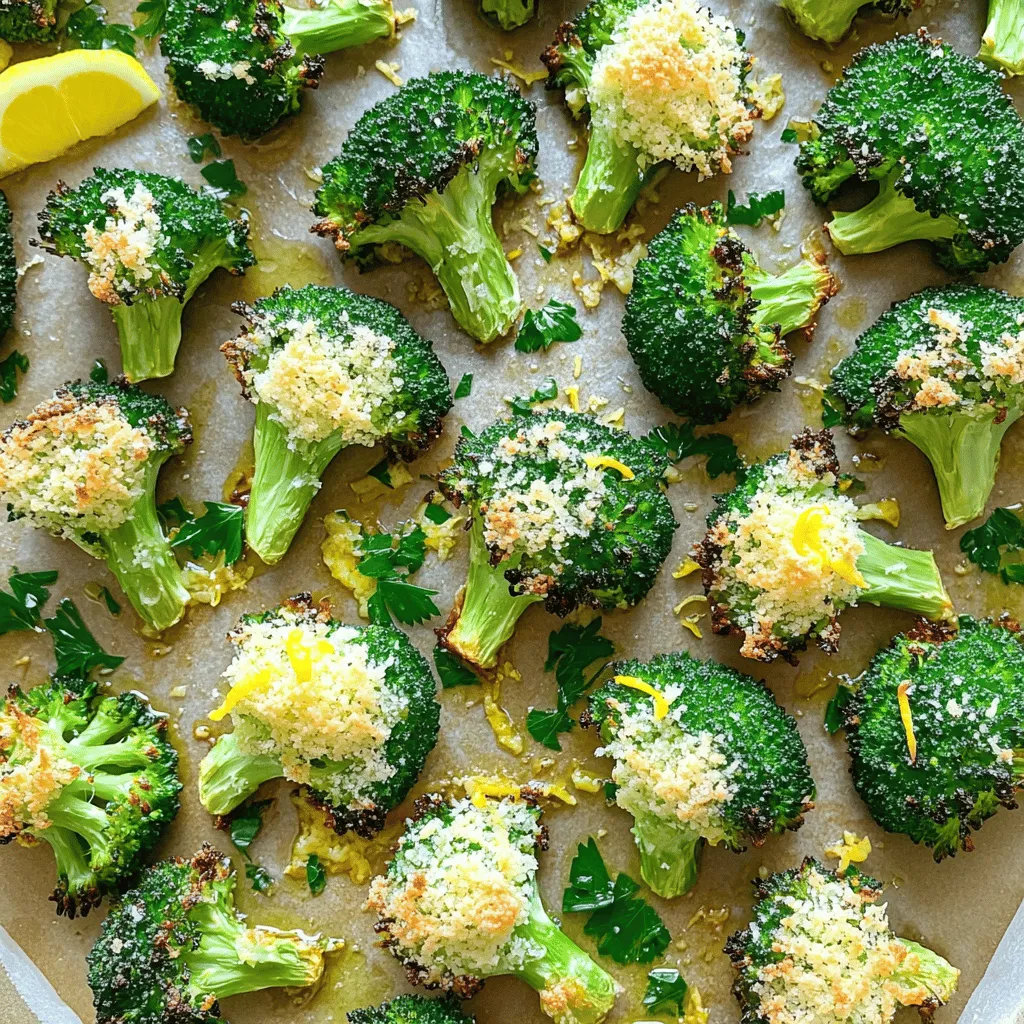 Preheat your oven to 425°F (220°C). Line a baking sheet with parchment paper for easy cleanup. Spread the seasoned broccoli in a single layer on the baking sheet. Roast the broccoli for 15 minutes. After 15 minutes, take it out and sprinkle half a cup of grated Parmesan cheese on top. Return it to the oven for another 5 to 10 minutes. The broccoli should be tender, and the cheese must be golden and crispy. Once it’s done, add a tablespoon of lemon zest and chopped parsley for extra flavor. Enjoy this delicious side dish!