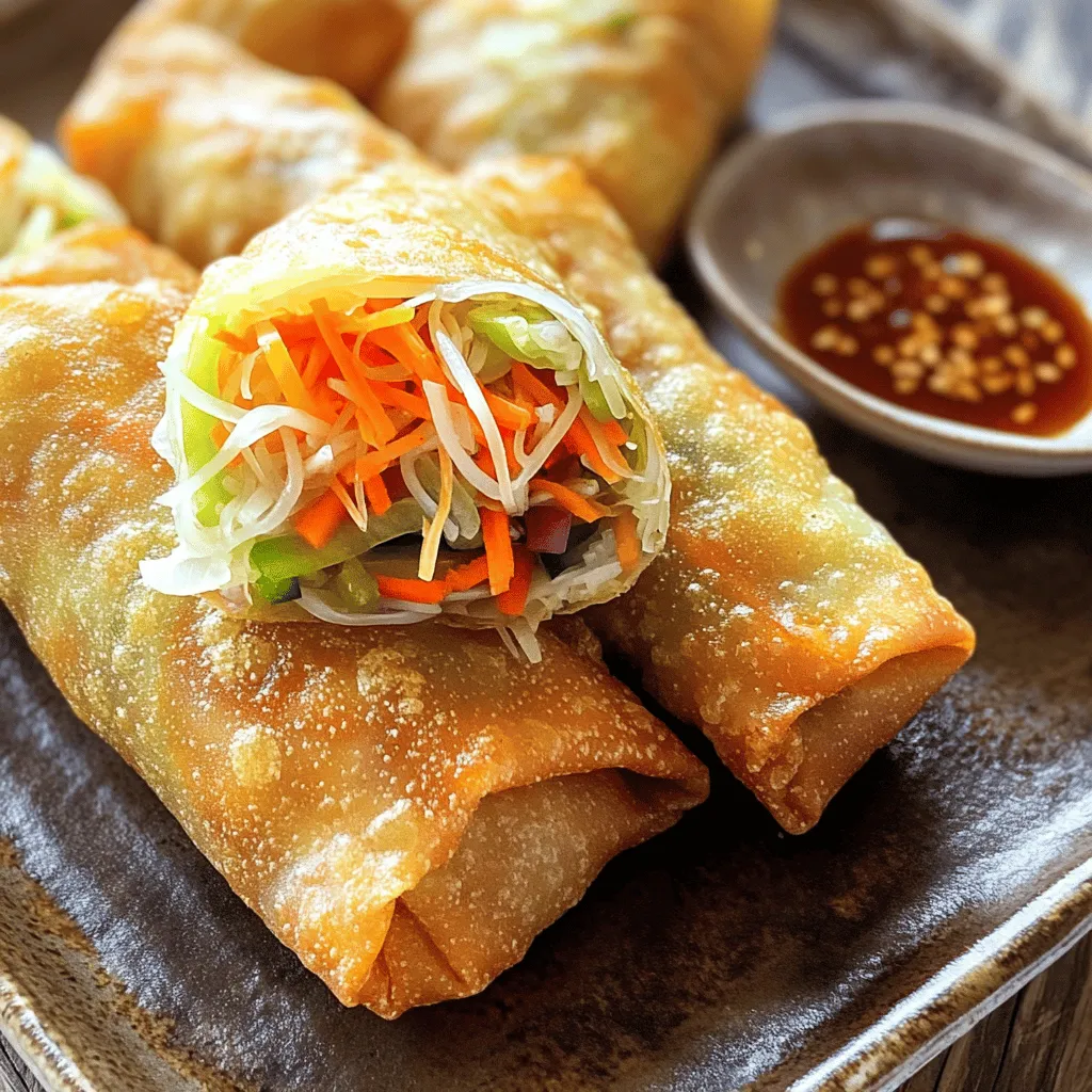 ![When making crispy veggie spring rolls, the right ingredients make all the difference. Here’s what you need: - 1 cup shredded carrots - 1 cup shredded cabbage - 1 cup bean sprouts - 1 bell pepper, thinly sliced - 2 green onions, chopped - 2 cloves garlic, minced - 1 tablespoon soy sauce - 1 teaspoon sesame oil - 1 package spring roll wrappers - Oil for frying - Salt and pepper to taste Each ingredient plays a key role. The shredded vegetables give crunch and color. Bell pepper adds sweetness, while garlic gives a nice depth. Soy sauce and sesame oil pack a flavor punch, making every bite tasty. Wrappers keep everything together and turn golden when fried. Choosing fresh vegetables is crucial. They enhance flavor and texture. I love using a mix of colors for visual appeal. It makes my spring rolls look as good as they taste. For frying, use oil with a high smoke point. This helps achieve that perfect crispy texture. Always ensure you have enough oil in the pan. This way, the spring rolls can float and cook evenly. If you want the full recipe, check out the detailed instructions! To start, gather all your shredded vegetables in a large bowl. I like to use: - 1 cup shredded carrots - 1 cup shredded cabbage - 1 cup bean sprouts - 1 bell pepper, thinly sliced - 2 green onions, chopped - 2 cloves garlic, minced Mix these together well. This blend offers great color and crunch. Next, add 1 tablespoon of soy sauce and 1 teaspoon of sesame oil. Stir it well to combine all the flavors. This adds a rich depth to your veggie mix. Now it’s time to wrap! Lay a spring roll wrapper flat on a clean surface. Make sure one corner is pointing toward you. Spoon about 2 tablespoons of the veggie mixture onto the bottom third of the wrapper. Next, fold the bottom corner over the filling. Then, fold in the sides tightly. Roll away from you to form a spring roll. Use a little water to seal the edge. This helps keep everything inside. Repeat this with the rest of the wrappers and filling. Frying is where the magic happens! Heat oil in a deep pan over medium heat. You want the oil to be hot but not smoking. A good test is to drop a small piece of wrapper in; it should sizzle. Carefully add a few spring rolls to the hot oil. Fry them for about 3-4 minutes, or until they turn golden brown and crispy. It’s best to avoid overcrowding the pan. This keeps them crispy. Once done, remove them and let them drain on paper towels. This step helps get rid of any excess oil. Serve them hot, optionally paired with a tasty dipping sauce! You can find the Full Recipe for more details. To make spring rolls crispy, oil temperature is key. Heat the oil to around 350°F before frying. Too cool oil makes soggy rolls. Too hot oil burns them quickly. Avoid overcrowding in the frying pan. Fry in small batches. This helps each roll cook evenly and stay crispy. Fry for about 3-4 minutes per batch. Look for a golden brown color. Rolling and sealing can be tricky. Make sure to fold tightly. If the rolls are loose, they might open while frying. Use a little water to seal the edges well. Be careful with seasoning. Too much can overpower the fresh veggies. Too little makes them bland. Taste the filling before rolling to adjust the flavor. Pair your spring rolls with tasty dipping sauces. Sweet chili sauce works great, adding a nice kick. Soy sauce is a classic choice, too. For side dishes, consider a fresh salad or rice. These complement the rolls well. Enjoy your meal! For the full recipe, click here: [Full Recipe]. {{image_2}} You can switch up the veggies in your spring rolls. Try mushrooms for a rich taste. Zucchini adds a nice crunch too. Feel free to mix and match based on what you have. You can also use different wraps. Rice paper is great for a fresh bite. Whole wheat wraps can make them a bit heartier. Want some heat? Add chili flakes or Sriracha to your veggie mix. This gives your rolls a nice kick. You can also serve them with hot dipping sauces. A spicy soy sauce can be a perfect match. Baking is a healthier choice for spring rolls. Preheat your oven to 400°F. Place the rolls on a baking sheet. Brush them lightly with oil. Bake for about 20 minutes, turning halfway through. This method gives you a nice crisp without the extra oil. Adjust your time if you make larger rolls. Keep an eye on them for a golden finish. You can check the [Full Recipe] for more details on how to make these delicious crispy veggie spring rolls. To keep your crispy veggie spring rolls fresh, place them in the fridge. Use an airtight container to prevent them from drying out. This method helps keep their taste and texture intact. Make sure to store them within two hours after cooking for the best results. When you want to reheat your spring rolls, use the oven or air fryer. Preheat your oven to 375°F (190°C). Place the spring rolls on a baking sheet and heat for about 10 minutes. This method makes them crispy again. Avoid using the microwave, as it can make them soggy. You can freeze uncooked spring rolls easily. Just wrap each one tightly and place them in a freezer-safe bag. Make sure to remove as much air as possible. To freeze cooked spring rolls, let them cool first. Then, place them in an airtight container. They can stay fresh for up to three months. Yes, you can make crispy veggie spring rolls ahead of time. To do this, prepare the filling and roll them up. Place the rolled spring rolls on a baking sheet in a single layer. Then, cover them with plastic wrap and freeze. This way, you can fry them later when you need a quick snack or meal. There are many tasty options to serve with crispy veggie spring rolls. Popular choices include: - Sweet chili sauce - Soy sauce - Peanut sauce - A fresh salad - Fried rice These sides add flavor and complement the spring rolls well. To test if the oil is hot enough, drop a small piece of bread or a tiny bit of the filling into the oil. If it sizzles and bubbles right away, the oil is ready. If not, wait a bi