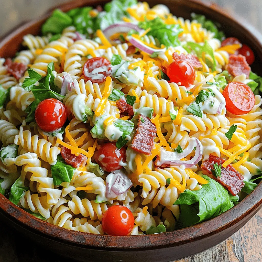 In this Easy BLT Pasta Salad, the main ingredients shine with their fresh flavors. The pasta serves as a cozy base, while the turkey bacon adds a satisfying crunch. Cherry tomatoes bring a sweet burst, making each bite delightful.