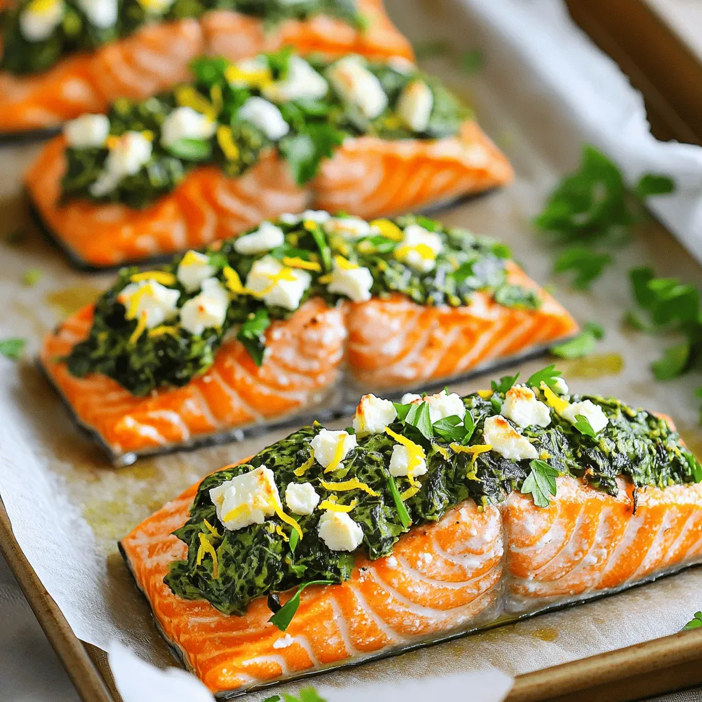 To make feta spinach stuffed salmon, gather these ingredients: - 4 salmon fillets (skin-on preferred) - 1 cup fresh spinach, chopped - ½ cup feta cheese, crumbled - 1 clove garlic, minced - 1 tablespoon olive oil - 1 teaspoon lemon zest - 1 tablespoon fresh lemon juice - Salt and pepper to taste - 1 teaspoon dried oregano - Fresh parsley, for garnish Use fresh ingredients for the best taste. The salmon should be bright in color, firm, and smell fresh. Spinach adds a nice green color and nutrients. Feta cheese gives a salty and creamy touch. Garlic is key for flavor. Olive oil keeps the dish moist. Fresh lemon juice and zest brighten the flavors. Salt, pepper, and oregano enhance the dish more. Finally, parsley adds a pop of color as a garnish. - Preheat your oven to 375°F (190°C). - In a skillet, add 1 tablespoon of olive oil and 1 clove of minced garlic. Sauté for about 1 minute. You want the garlic to smell great. - Add 1 cup of chopped spinach to the skillet. Cook until the spinach wilts, which takes about 2-3 minutes. Remove from heat and let it cool slightly. - In a bowl, combine the sautéed spinach with ½ cup of crumbled feta cheese, 1 teaspoon of lemon zest, 1 tablespoon of fresh lemon juice, 1 teaspoon of dried oregano, salt, and pepper. Mix it well. - Take 4 salmon fillets and pat them dry. Use a sharp knife to cut pockets into each fillet. Don’t cut all the way through. - Stuff each pocket with the spinach-feta mixture. Be generous with the filling! Place the stuffed fillets on a lined baking sheet. - Season the tops with a pinch of salt and pepper. Bake in the oven for 15-20 minutes. The salmon is done when it flakes easily with a fork. - Once baked, remove from the oven and let the salmon rest for a few minutes. Garnish with fresh parsley before serving. When selecting salmon, skin-on fillets add flavor and moisture. Skinless fillets may dry out faster. Always look for bright, moist, and firm fish. Fresh salmon should smell like the sea, not fishy. Ask your fishmonger about the catch date to ensure quality. Adjust the spinach-feta mix to your taste. If you like it saltier, add more feta. You can swap feta for cream cheese or ricotta for a different flavor. Fresh herbs like dill or basil also work well. Experiment with what you enjoy most! To check for doneness, use a fork to flake the salmon. It should come apart easily and look opaque. Avoid overcooked salmon; it becomes dry. If you're unsure, take it out of the oven a minute early. It will continue to cook slightly as it rests. {{image_2}} You can switch up the cheese in this recipe. Cream cheese or ricotta works great! They add a nice creaminess. You can also mix herbs into your cheese for more flavor. Try dill or basil for a fresh twist. Each cheese brings its own taste, so feel free to explore. You can add more greens to your filling. Kale or Swiss chard are excellent choices. They give a hearty texture and taste. You can also mix in other veggies. Chopped bell peppers or mushrooms can add more crunch and flavor. Get creative and make it your own! Baking gives a nice finish to the salmon. However, you can grill the stuffed salmon for a smoky taste. Just preheat your grill and cook for about 10-15 minutes. An air fryer is another option. Cook it at 375°F for about 10-12 minutes. Each method brings a unique flavor and texture. Enjoy experimenting! To keep your feta spinach stuffed salmon fresh, store it in the fridge. Use an airtight container to prevent odors. Cooked salmon lasts about 3 to 4 days in the fridge. Always check for any off smells or unusual colors before eating. To reheat the salmon, use the oven for best results. Preheat your oven to 350°F (175°C) and place the salmon on a baking dish. Cover it with foil to keep moisture. Heat for about 10-15 minutes or until warm. You can also use the microwave, but be careful. Heat it in short bursts to avoid drying out. For serving ideas, try adding a fresh salad or some rice on the side. You can freeze your stuffed salmon for later. It’s best to freeze before cooking for the best texture. Wrap each piece tightly in plastic wrap and then in foil. This helps avoid freezer burn. To thaw, move the salmon to the fridge for a night. This keeps it safe and tasty. Avoid thawing it at room temperature to prevent bacteria growth. You can serve many tasty sides with Feta Spinach Stuffed Salmon. Here are some great options: - Roasted vegetables: Carrots, broccoli, or asparagus add color and crunch. - Rice or quinoa: These grains soak up flavors and balance the meal. - Mixed greens salad: Fresh greens with a light dressing add a crisp touch. - Potatoes: Mashed or roasted potatoes work well for a hearty side. - Garlic bread: It’s a fun addition that complements the dish nicely. Mix and match these sides to create a balanced and delicious meal. Yes, you can prepare this dish ahead of time. Here’s how: - Stuff the salmon: Follow the recipe steps and stuff the salmon fillets. - Cover and chill: Wrap them in plastic wrap or place them in a covered dish. - Refrigerate: You can keep the stuffed salmon in the fridge for up to 24 hours. When ready to cook, just bake them as directed. This makes meal prep easy and quick. This recipe is quite healthy. Here’s why: - Salmon: It is rich in omega-3 fatty acids, which are good for your heart. - Spinach: This green is packed with vitamins and minerals, like iron and vitamin K. - Feta cheese: It adds flavor with less fat than some other cheeses. For a typical serving of this dish, you get about: - Calories: Around 350-400 calories. - Protein: 30-35 grams, thanks to the salmon and feta. This combination makes it a nutritious choice for any meal. This blog post showed you how to make Feta Spinach Stuffed Salmon. You learned about fresh ingredients, cooking steps, and tips for perfection. I shared ways to store leftovers and suggested side dishes. The dish is not only tasty but also healthy. With this guide, you can create a delightfu