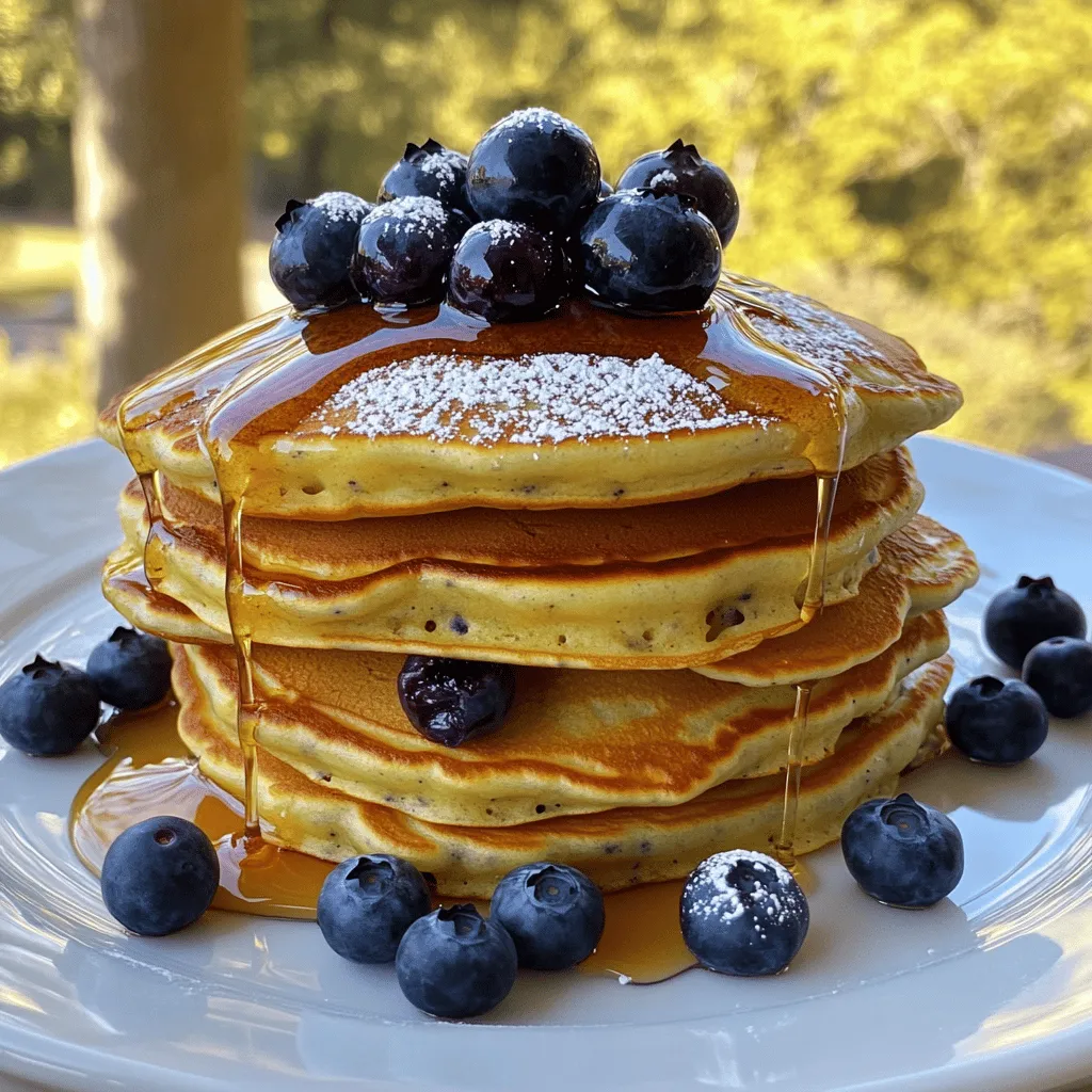![To make fluffy buttermilk blueberry pancakes, gather these simple ingredients: - 1 cup all-purpose flour - 1 tablespoon sugar - 2 teaspoons baking powder - 1/2 teaspoon baking soda - 1/4 teaspoon salt - 1 cup buttermilk - 1 large egg - 2 tablespoons melted butter - 1 teaspoon vanilla extract - 1 cup fresh blueberries (or frozen, if not in season) - Extra butter or oil for cooking Not all kitchens have the same items. Here are some easy swaps: - If you lack buttermilk, mix 1 cup of milk with 1 tablespoon of vinegar or lemon juice. Let it sit for 5 minutes. - You can replace all-purpose flour with whole wheat flour for a heartier pancake. This adds fiber too! - For a dairy-free option, use almond milk or oat milk in place of buttermilk and regular butter. - If you want less sugar, cut the sugar to 2 teaspoons or use honey instead. These pancakes are a tasty breakfast choice. Here’s a quick look at what’s in one serving (2 pancakes): - Calories: 230 - Protein: 6g - Carbohydrates: 34g - Dietary Fiber: 2g - Total Fat: 9g - Saturated Fat: 4g - Sugar: 4g - Calcium: 200mg Enjoy these pancakes with fresh blueberries and syrup. They’re fun to make and eat! For the full recipe, check the details above. First, gather your dry ingredients. In a large mixing bowl, add: - 1 cup all-purpose flour - 1 tablespoon sugar - 2 teaspoons baking powder - 1/2 teaspoon baking soda - 1/4 teaspoon salt Whisk these together until they blend well. This step is key for fluffy pancakes. Now, let’s move to the wet ingredients. In a separate bowl, mix: - 1 cup buttermilk - 1 large egg - 2 tablespoons melted butter - 1 teaspoon vanilla extract Whisk until it’s smooth. This mixture gives your pancakes moisture and flavor. Heat a non-stick skillet over medium heat. Lightly grease it with butter or oil. For each pancake, pour about 1/4 cup of the batter onto the skillet. Watch closely for bubbles on the surface. This usually takes about 2-3 minutes. Flip the pancake and cook for another 1-2 minutes until golden brown. Keep cooked pancakes warm as you repeat the process. Serve these fluffy buttermilk blueberry pancakes with maple syrup and fresh blueberries for a delightful breakfast. For the full recipe, check above! To make your pancakes super fluffy, use fresh baking powder. Make sure it’s active. Mix the wet and dry ingredients gently. Overmixing will make them tough. Let the batter rest for about 5 minutes. This helps the baking powder work better. Use a hot skillet and don’t flip too soon. Wait for bubbles to form on top. If you have leftovers, cool them first. Place them in a single layer in a container. You can stack them with parchment paper between layers. Seal the container tightly. Store it in the fridge for up to three days. For longer storage, freeze the pancakes. They can last for two months in the freezer. Serve these pancakes warm with maple syrup. You can add a pat of butter on top. For a fun twist, try whipped cream and fresh fruit. A sprinkle of powdered sugar makes them look fancy. You can also serve them with yogurt for a tasty breakfast. Explore the full recipe for more ideas! {{image_2}} You can make these pancakes even more fun! Try adding different mix-ins. Chopped nuts, like pecans or walnuts, give a nice crunch. You can also add chocolate chips for a sweet twist. If you love spices, a dash of cinnamon or nutmeg adds warmth and flavor. For a citrus touch, mix in some lemon or orange zest. Each add-in brings a new taste, making your breakfast unique. If you need gluten-free pancakes, swap the flour. Use a gluten-free all-purpose blend. Many blends work well and keep the pancakes light. Check if your blend contains xanthan gum. This helps the pancakes stick together. Follow the same recipe steps. You’ll still get fluffy, tasty pancakes without gluten. To make vegan pancakes, replace the buttermilk and egg. Use plant-based milk, like almond or soy milk, with a splash of lemon juice. This creates a good substitute for buttermilk. For the egg, use a flax egg. Mix one tablespoon of ground flaxseed with three tablespoons of water. Let it sit for five minutes to thicken. These simple swaps keep your pancakes soft and fluffy. You can enjoy delicious Fluffy Buttermilk Blueberry Pancakes while following a vegan diet! For the complete recipe, check out the [Full Recipe]. After making these fluffy buttermilk blueberry pancakes, you might have some leftovers. To store them, let the pancakes cool completely. Place them in an airtight container. You can also use plastic wrap. This keeps them fresh in the fridge for up to three days. If you want to store them longer, freezing is a great option. When you're ready to enjoy your leftover pancakes, reheating is simple. You can use a microwave or a skillet. For the microwave, place a pancake on a plate and heat for about 30 seconds. For the skillet, warm it on low heat for a couple of minutes. This helps keep them soft and fluffy. You can add a little butter to the pan for extra flavor. Freezing pancakes is easy and perfect for quick meals. To freeze, stack the pancakes with parchment paper between each one. This helps prevent them from sticking together. Then, place the stack in a freezer bag. You can keep them in the freezer for up to two months. When you want to eat them, just take out as many as you need and reheat them. Enjoy your pancakes anytime! Check out the Full Recipe for more tips. To make pancakes fluffier, you need to focus on a few key steps. First, don’t overmix the batter. Mix until you see no dry flour, but it’s okay if some lumps remain. This helps keep the air in the batter, which makes them rise. Second, use fresh baking powder. Old baking powder can lose its power and make your pancakes flat. Lastly, let the batter rest for a few minutes before cooking. This allows the baking powder to activate and helps create that fluffy texture. Yes, you can use many other fruits! Strawberries, bananas, and raspberries all work well. Just ch