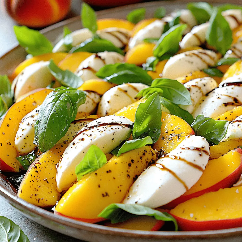 ![To make a fresh peach caprese salad, gather these simple ingredients: - 3 ripe peaches, sliced - 8 oz fresh mozzarella, sliced - 1 cup fresh basil leaves - 3 tablespoons balsamic glaze - 2 tablespoons extra virgin olive oil - Salt and black pepper to taste These ingredients create a bright and tasty dish that anyone can enjoy. When measuring, use dry measuring cups for the balsamic glaze and olive oil. A liquid measuring cup works best for any liquid. Slice the peaches and mozzarella evenly for a nice look. Use a sharp knife for clean cuts. Quality ingredients make the dish shine. Fresh peaches bring sweetness and juicy flavor. High-quality mozzarella adds creaminess and richness. Fresh basil gives a lovely aroma and taste. Using good balsamic glaze and olive oil enhances these flavors. Always choose fresh, ripe ingredients to create a salad that impresses. For the full recipe, check the details provided. To make this dish, start with fresh peaches. Wash them well to remove dirt. Cut each peach in half and take out the pit. Next, slice the peaches into wedges. You want thick slices for a great texture. Now, grab your fresh mozzarella. Slice it into rounds that match the peach slices. This pairing will create a beautiful look. Take a serving platter and arrange the peach slices. Alternate them with the mozzarella slices. This creates a colorful display. Tuck in fresh basil leaves between the fruit and cheese. The basil adds a lovely aroma and taste. Now it’s time to dress the salad. Drizzle balsamic glaze over the top. Follow this with extra virgin olive oil. Finally, sprinkle salt and black pepper to taste. These simple seasonings enhance the flavors. Let the salad sit for a few minutes. This waiting time allows the flavors to blend nicely. For serving, use a large, shallow dish. This helps showcase the bright colors of the salad. Place some extra basil leaves on top for a finishing touch. You can serve this salad as a starter or a side dish. It pairs well with grilled meats or fish. Consider adding crusty bread on the side. This will soak up the delicious juices. Timing is key for flavor. Aim to serve the salad right after you prepare it. This keeps the peaches fresh and juicy. If you need to prep ahead, slice the peaches just before serving. This prevents browning. For the best taste, use ripe peaches. They should feel slightly soft to the touch. The Full Recipe provides all the details you need. Follow these steps, and you will impress everyone! When I pick peaches, I look for soft, slightly firm fruit. Ripe peaches have a sweet smell. The skin should be smooth and slightly yellow or orange. Avoid peaches with large brown spots or wrinkles. Press gently; if it gives a little, it's ready. Picking the right peach is key to a great salad. The beauty of this salad comes from its bright flavors. I always season with salt and pepper. A pinch of salt enhances the sweetness of the peaches. Fresh black pepper adds a nice bite. Don't forget the balsamic glaze! It brings tanginess and depth. Start with a little and adjust to your taste. You can jazz up your salad with more ingredients. Try adding sliced prosciutto for a savory kick. Crumbled feta cheese can add creaminess. If you love nuts, sprinkle some toasted pine nuts for crunch. Each addition brings new flavors to the dish. Explore your options and have fun! For the full recipe, you can check the title above. {{image_2}} You can switch up ingredients based on what’s fresh and in season. Try using ripe tomatoes instead of peaches in the winter. You can also use burrata cheese for a richer flavor. Fresh herbs like mint or arugula can add a nice twist too. Don’t be afraid to mix it up! If you want a vegan version of this salad, replace the mozzarella with a plant-based cheese. You can also use avocado slices for creaminess. For a dairy-free option, almond or cashew cheese works well. Just make sure to check the labels for hidden dairy. For fun presentation, you can make peach caprese skewers. Just thread peach slices, mozzarella, and basil onto skewers. This makes a great finger food! You could also serve the salad in bowls. Layer the ingredients for a colorful look. Drizzle the balsamic glaze on top for added flair. For the full recipe, check out the details above. Storing your Fresh Peach Caprese Salad correctly keeps it tasty. If you have leftovers, place them in an airtight container. This helps keep moisture in and prevents the salad from drying out. You should eat the salad within two days for the best taste. If you wait longer, the peaches may get mushy. To keep your ingredients fresh, store them separately. Peaches can go in the fridge, but don’t wash them until you are ready to eat. This helps them last longer. Fresh mozzarella should stay in its liquid until you need it. Basil is best kept in water like a flower, or wrapped in a damp paper towel. Use glass or plastic containers with tight lids. These containers keep out air and moisture. If you want to store just the peaches, a simple bowl with a lid works well. For the mozzarella, keep it in its original packaging or a sealed container. Remember to label your containers with the date, so you know when to use them. For a full recipe of this delicious dish, check the [Full Recipe]. Yes, you can prepare some parts in advance. Slice the peaches and mozzarella ahead of time. Keep them in separate containers in the fridge. This helps them stay fresh. However, I recommend assembling the salad just before serving. This keeps the peaches and mozzarella from getting soggy. Balsamic glaze and olive oil should be added right before you serve. This way, the salad tastes its best. If you want a different cheese, try burrata or ricotta. Both add creaminess to the salad. For a dairy-free option, use avocado slices. They bring a smooth texture and healthy fat. You can also try vegan mozzarella, which works well too. Just ensure whatever you choose complements the peaches. To check if peach