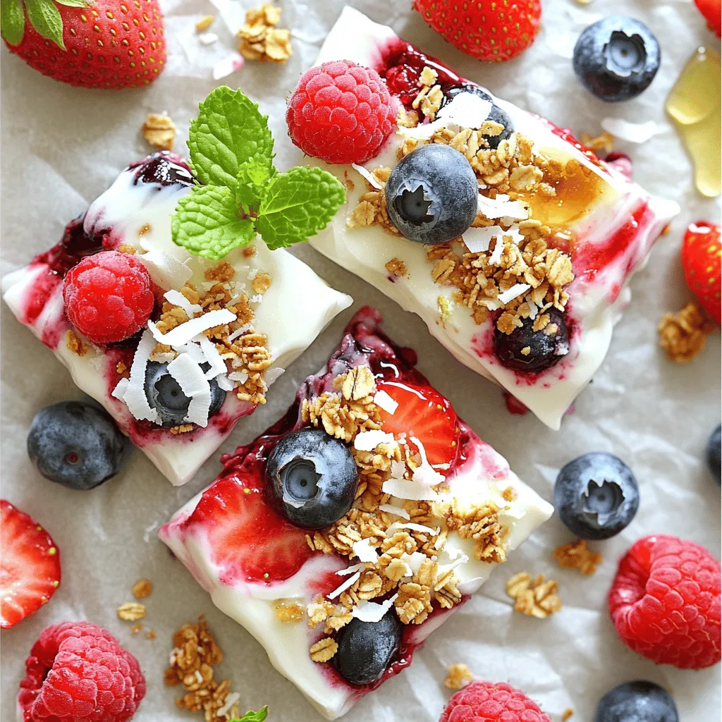 Granola adds a delightful crunch. It’s excellent for texture. If you like, sprinkle some shredded coconut on top. It adds a tropical touch. For a pretty finish, fresh mint leaves make a great garnish. They add a pop of green color and a fresh taste.Creating this yogurt bark is simple and fun. Enjoy the process of mixing and layering these vibrant ingredients!