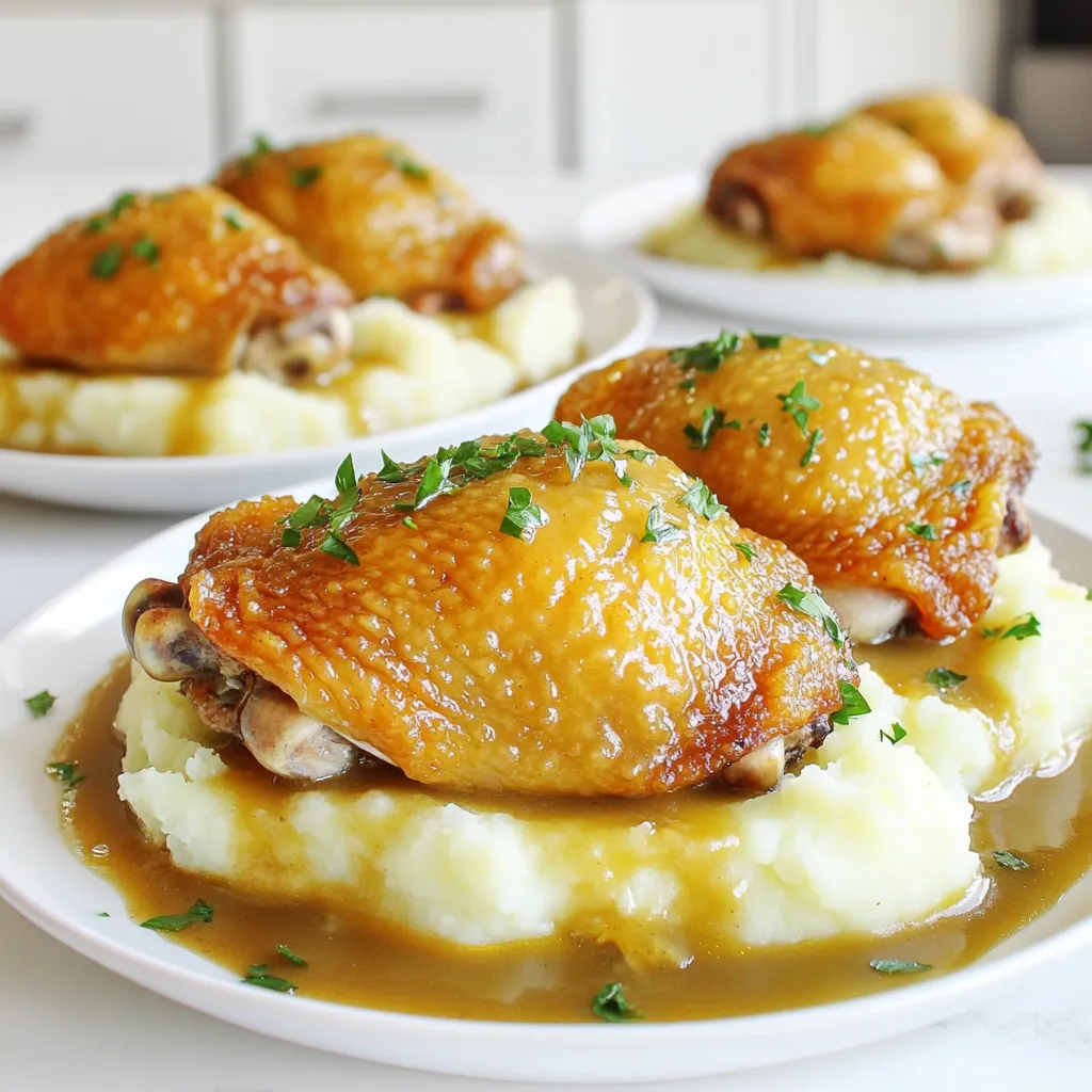 To serve, grab a large plate. Spoon a generous amount of mashed potatoes in the center. Top with a crispy chicken thigh and ladle creamy gravy over the top.