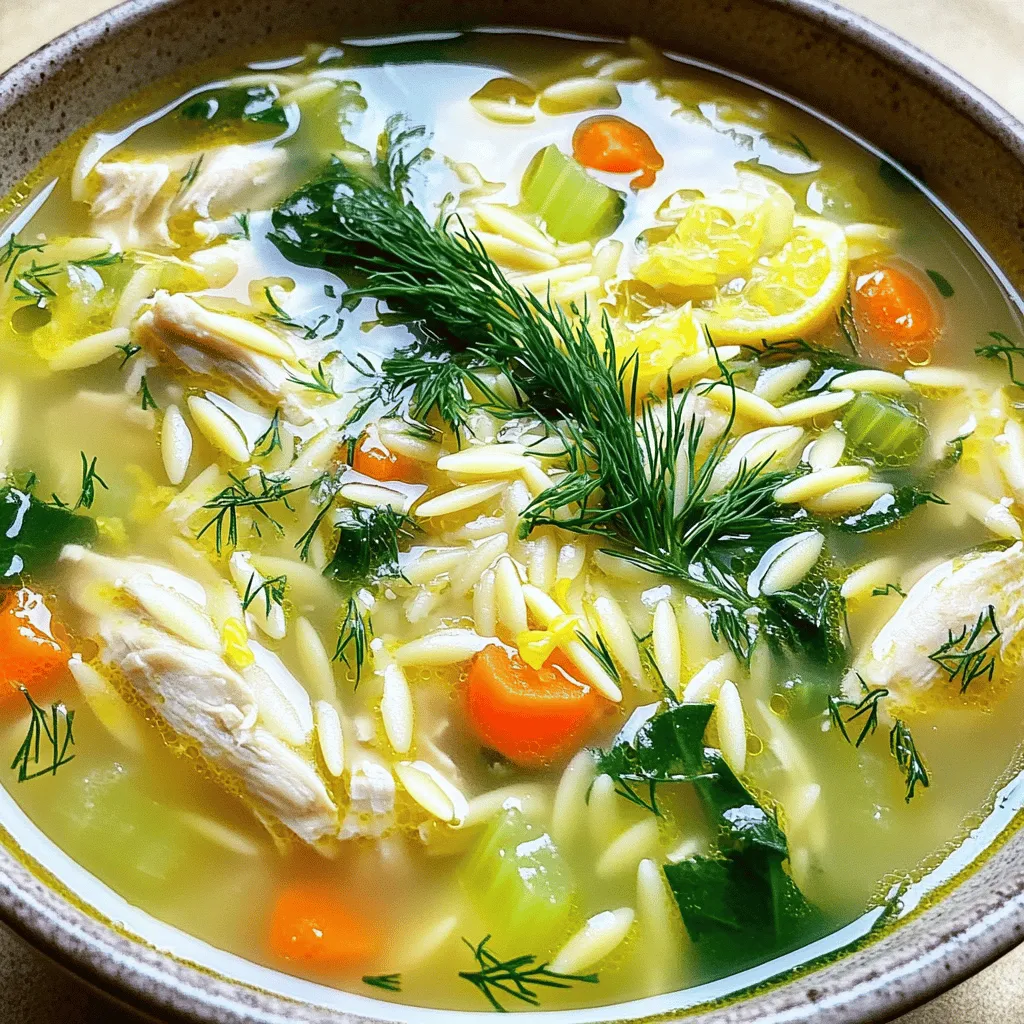 ![- 1 tablespoon olive oil - 1 medium onion, diced - 3 garlic cloves, minced - 3 medium carrots, sliced - 2 celery stalks, chopped - 1 pound boneless, skinless chicken breast (cut into bite-sized pieces) - 4 cups chicken broth - 1 cup water - 1 cup orzo pasta (or rice) - 1/2 teaspoon dried thyme - 1/2 teaspoon ground black pepper - Zest and juice of 2 large lemons - 1 cup fresh spinach, chopped - Salt to taste - Fresh dill for garnish For this Greek lemon chicken soup, I use fresh, quality ingredients. First, I start with olive oil and fresh vegetables. The onion adds sweetness. Garlic gives it a nice depth. Carrots and celery add crunch and flavor. Next, I choose chicken breast. It cooks quickly and stays tender. I also use chicken broth. It gives the soup a rich base. Water helps balance the flavors. For pasta, I like orzo. It’s small and cooks fast. You can swap it for rice if you prefer. Seasonings are key. I use dried thyme and black pepper for a warm taste. Then, I add the zest and juice of lemons. They bring bright flavor. Fresh spinach adds color and nutrients. Garnish with dill for a lovely finish. You can find the full recipe above to see how to put all these ingredients together! Cooking the base ingredients Start by heating the olive oil in a large pot over medium heat. Once hot, add the diced onion. Cook the onion for about five minutes until it turns soft and clear. Next, add minced garlic and cook for one more minute. The kitchen will smell great! After that, toss in the sliced carrots and chopped celery. Sauté these for three to four minutes until they start to soften. Adding chicken and liquids Now it’s time for the chicken. Add the bite-sized pieces of chicken breast to the pot. Cook them for about five minutes until they turn light brown, stirring often. After the chicken is cooked, pour in the chicken broth and water. Bring this mixture to a gentle simmer. Incorporating pasta and greens Once simmering, stir in the orzo pasta or rice, dried thyme, and black pepper. Add salt to taste as well. Cook this for about eight to ten minutes until the pasta is tender. After the pasta has cooked, add the lemon zest, lemon juice, and chopped spinach. Stir everything together and let it cook for another two minutes until the spinach wilts. Now, your soup is ready to serve! For the full recipe, you can refer back to the ingredients section. Adjusting lemon flavor To tweak the lemon flavor, use fresh juice and zest. Start with less lemon juice if you want a mild taste. Add more juice in small amounts until you find your favorite balance. Recommended seasoning variations You can try adding herbs like oregano or parsley. These herbs bring a new twist to the soup. A pinch of cayenne pepper adds a warm kick if you like spice. Cooking methods suggestions You can cook this soup on the stove or in a slow cooker. For a quick meal, use the stove method. It takes about 35 minutes in total. The slow cooker is great for busy days. Just set it and let it work while you're out. Try the [Full Recipe] for all the steps and enjoy a bowl of this warm goodness! {{image_2}} Gluten-free options: You can easily make this soup gluten-free. Just swap orzo for rice or gluten-free pasta. This keeps the soup tasty without the gluten. Vegetarian adaptations: To make a vegetarian version, skip the chicken. Use chickpeas or lentils for protein. Replace chicken broth with vegetable broth for flavor. Add extra veggies like zucchini or bell peppers. Ingredient substitutions: You can change some ingredients based on what you have. Use frozen spinach if fresh is not available. Swap out carrots for peas or green beans. If you do not have fresh dill, try parsley or basil for a different taste. These variations help you enjoy Greek lemon chicken soup in many ways. Each twist keeps the dish fun and exciting. For the complete recipe, check the [Full Recipe]. To keep your Greek Lemon Chicken Soup fresh, store it in an airtight container. This helps lock in flavor and prevents spills. If you have leftovers, let the soup cool first. It should cool for about 30 minutes before you store it. When refrigerated, the soup lasts about 3 to 4 days. If you want to keep it longer, freezing is a great option. Pour the cooled soup into freezer-safe bags or containers. Make sure to leave some space at the top, as liquids expand when frozen. In the freezer, it can last up to 3 months. For reheating, remove the soup from the fridge or freezer. If frozen, let it thaw overnight in the fridge. When ready to eat, warm the soup in a pot over low heat. Stir it often to ensure even heating. You can also use the microwave. Heat it in a microwave-safe bowl, stirring every minute until hot. By following these storage tips, you can enjoy your Greek Lemon Chicken Soup later without losing its great taste. Check the Full Recipe for all the details on making this delicious dish! You can serve Greek Lemon Chicken Soup with crusty bread. A slice of warm, fresh bread pairs well. It soaks up the soup's tangy broth. A simple salad also makes a great side. Try a Greek salad with feta and olives. This adds freshness and balances the soup's flavors. Yes, leftover chicken is perfect for this soup. It saves time and adds great flavor. Just shred or chop the chicken into small pieces. Add it to the pot when you combine the broth. This way, the chicken heats through without overcooking. To make it creamier, add a splash of heavy cream. Stir it in just before serving. You can also mix in some Greek yogurt. This adds creaminess and a nice tang. If you want a thicker soup, use less broth. Enjoy the smooth, rich texture! For the full recipe, visit [Full Recipe]. In this blog post, we explored how to make Greek Lemon Chicken Soup. We covered the key ingredients, such as olive oil, chicken, and fresh vegetables. You learned the step-by-step process, from cooking the base to adding pasta. I shared tips for enhancing flavors and dietary variations for everyone. Finally
