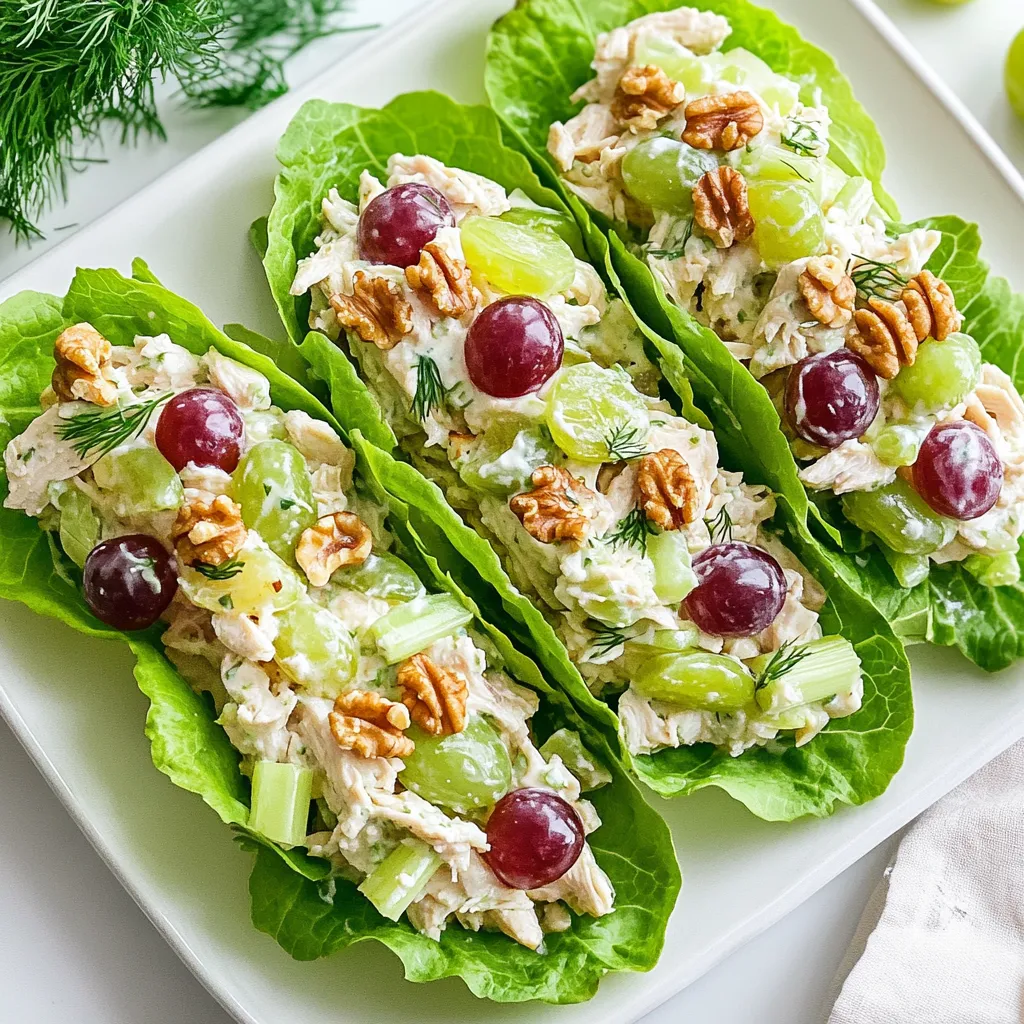 Serve the chicken salad in fresh lettuce leaves. This adds a nice crunch. If you want to prepare ahead, mix the chicken salad but keep it separate from the lettuce. Just assemble the wraps when you’re ready to eat. This keeps the lettuce crisp. Garnish with fresh dill or extra grape halves for a colorful look.