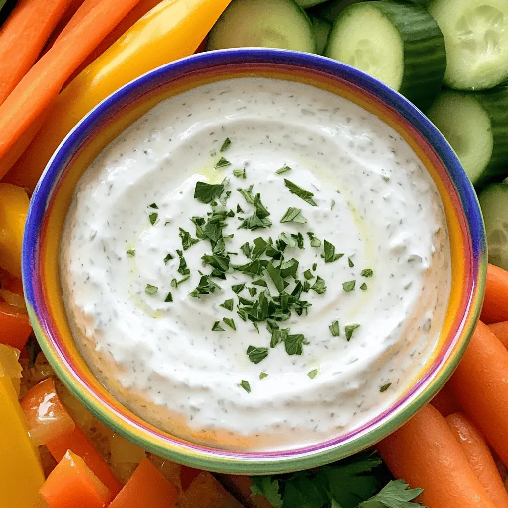 To make a tasty Greek Yogurt Ranch Dip, you need: - 1 cup plain Greek yogurt - 1 tablespoon mayonnaise - 1 teaspoon garlic powder - 1 teaspoon onion powder - 1 teaspoon dried dill - 1 teaspoon dried parsley - 1 teaspoon dried chives - 1 tablespoon lemon juice - Salt and pepper to taste These ingredients work together to create a creamy and flavorful dip. The Greek yogurt gives it a rich texture. The herbs and spices add depth and freshness. You can also add more flavors to your dip. Some great options are: - Fresh herbs like basil or cilantro - A pinch of cayenne for heat - A splash of Worcestershire sauce for umami - Chopped green onions for a little crunch These extras can make your dip unique. Feel free to mix and match based on what you like. Using Greek yogurt in this dip has many perks. It is lower in fat than sour cream. Greek yogurt is also high in protein, which helps keep you full. It has probiotics that support gut health. Plus, it's packed with calcium, which is good for your bones. By choosing Greek yogurt, you make a healthier dip without losing taste. Start by gathering your ingredients. You need plain Greek yogurt and mayonnaise. In a medium bowl, add 1 cup of Greek yogurt and 1 tablespoon of mayonnaise. Mix them well until the mix is smooth. This is the creamy base of your dip. The Greek yogurt adds a rich taste while keeping it healthy. Next, it’s time to add flavor. Add 1 teaspoon of garlic powder, 1 teaspoon of onion powder, 1 teaspoon of dried dill, 1 teaspoon of dried parsley, and 1 teaspoon of dried chives to the yogurt mixture. These spices bring out the ranch taste. Pour in 1 tablespoon of lemon juice for a fresh zing. Stir everything together until the herbs and spices blend into the creamy base. Now, you need to let the dip chill. Cover the bowl with plastic wrap. Place it in the fridge for at least 30 minutes. This step is key. Chilling allows the flavors to mix well. Before serving, give the dip a gentle stir. Taste it and adjust the salt and pepper if needed. This dip tastes even better after it has chilled! To make the dip suit your taste, start with the base. You can add more garlic powder for a bolder kick. If you enjoy herbs, increase the dill, parsley, or chives. A dash of hot sauce can give it a nice heat. Taste as you go. This way, you create a dip just for you. This dip is perfect for parties. Serve it in a pretty bowl. Top it with fresh herbs for a pop of color. Pair it with cut veggies like carrots, cucumbers, and bell peppers. For fun, add some chips or crackers. Your guests will love the fresh flavors and crunchy textures. To keep your dip fresh, store it in an airtight container. It stays good in the fridge for up to five days. If you want to keep it longer, double-check your ingredients. Some herbs may wilt faster, so use fresh ones for best results. When you're ready to enjoy it again, just give it a stir and taste for seasoning. {{image_2}} You can make a dairy-free version of this dip. Use coconut yogurt or almond yogurt instead of Greek yogurt. These options give you a creamy base. They also keep the flavor fresh and light. Add a bit more lemon juice to brighten up the taste. Want to spice things up? Add a dash of hot sauce or some cayenne pepper. You can also mix in diced jalapeños for a kick. For a smoky flavor, try smoked paprika. These additions make the dip exciting and fun for everyone. Seasonal veggies are a great way to change the dip's flavor. In spring, add fresh chives or radishes. In summer, try diced tomatoes or diced cucumbers. In fall, mix in roasted pumpkin or sweet potatoes for a warm twist. These ingredients keep the dip bright and tasty all year long. To keep your Greek yogurt ranch dip fresh, store it in an airtight container. This helps keep out air and moisture. Make sure to cover the dip tightly. If you use a bowl, wrap it well with plastic wrap. This will help keep it creamy and tasty. When stored properly in the fridge, the dip lasts about 3 to 5 days. Check for any changes in smell or texture before using it. If it looks or smells off, it’s best to toss it. Always trust your senses! You can freeze Greek yogurt ranch dip, but it may change texture. If you want to freeze it, use a freezer-safe container. Leave some space at the top for expansion. It will stay good for about 2 to 3 months. To eat, thaw it in the fridge overnight. Stir it well before serving to help restore its creaminess. Yes, you can skip the mayonnaise. Use only Greek yogurt for a creamier texture. It will still taste great! The dip may be thicker, but you can add a little water or lemon juice to thin it if you like. This option is healthier and keeps it light. To make a vegan version, replace Greek yogurt with a plant-based yogurt. Look for options made from almond, soy, or coconut. You can also add a little nutritional yeast for a cheesy flavor. The herbs and spices can stay the same, so your dip remains tasty and fresh. This dip pairs well with many snacks. You can serve it with: - Carrot sticks - Cucumber slices - Bell pepper strips - Celery sticks - Cherry tomatoes - Pita chips These fresh veggies and chips add color and crunch to your platter. Enjoy sharing this dip at parties or gatherings! Greek yogurt ranch dip is simple and fun to make. We covered essential and optional ingredients for a tasty dip. You can adjust flavors and serve it for any crowd. Remember, storage is key to keep it fresh. This dip offers a healthy twist on a classic favorite. Try different variations to keep it exciting. Enjoy your cooking adventures and share this dip with others!