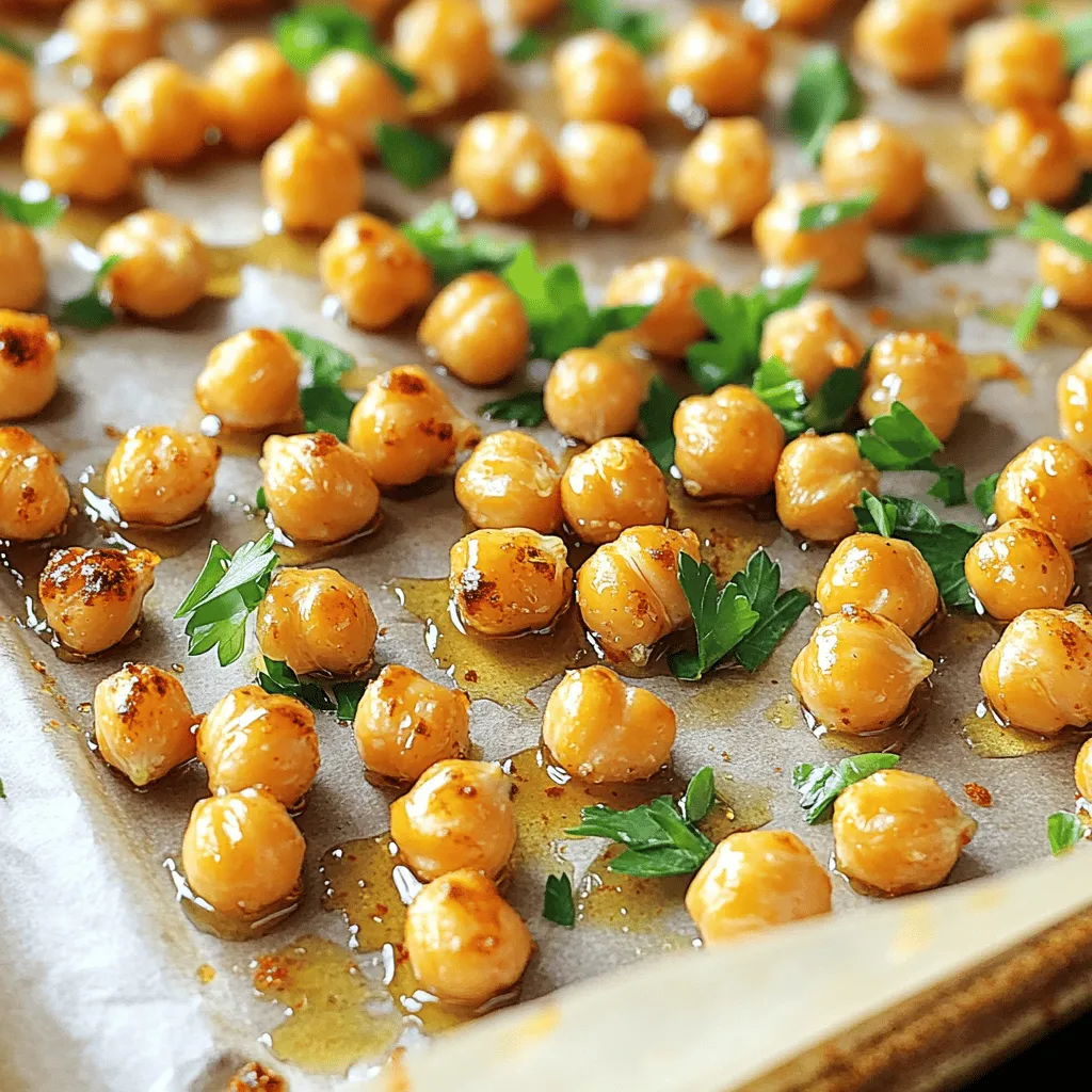 - Chickpeas: Canned vs. Dried You can use canned or dried chickpeas. Canned chickpeas are easy and quick. Just drain and rinse them. Dried chickpeas take longer. You must soak and cook them first. For this recipe, I recommend canned chickpeas for speed. - Olive Oil: Types and Substitutes Olive oil adds flavor and helps crisp the chickpeas. Use extra virgin for the best taste. If you don’t have it, you can use other oils like avocado or canola. Just make sure it has a high smoke point. - Sweeteners: Using Honey vs. Alternatives Honey gives a nice sweetness and glaze. If you want a vegan option, try maple syrup or agave nectar. Both work well and add their own unique flavors. - Garlic: Fresh vs. Powdered Fresh garlic is best for this recipe. It gives a strong and tasty flavor. If you don’t have fresh garlic, you can use garlic powder. Use less, about half the amount, since it’s more concentrated. - Spice Options: Smoked Paprika, Salt, and Pepper Smoked paprika adds depth to the dish. The salt enhances all the flavors. Black pepper adds a nice touch of heat. These three spices combined make the chickpeas pop. - Optional Spice: Adding Cayenne for Heat If you like it spicy, add cayenne pepper. It kicks up the heat and balances the sweetness. Adjust the amount to match your taste. Start with a little and add more if you dare! Setting the Oven Temperature Start by preheating your oven to 400°F (200°C). This hot oven will help make your chickpeas crispy and delicious. Preheating is key for even cooking. Preparing the Baking Sheet Next, grab a baking sheet. Line it with parchment paper. This will stop the chickpeas from sticking and make cleanup easy. Combining Chickpeas with Seasonings In a medium bowl, add your drained and rinsed chickpeas. Pour in two tablespoons of olive oil and two tablespoons of honey. Then, add three minced garlic cloves, one teaspoon of smoked paprika, half a teaspoon of salt, and a quarter teaspoon of black pepper. If you want some heat, add half a teaspoon of cayenne pepper. Mix well until the chickpeas are fully coated. Importance of Even Coating Coating the chickpeas evenly is very important. It ensures every bite is full of flavor. If you skip this step, some chickpeas may taste bland. Recommended Roasting Time Spread the chickpeas in a single layer on your prepared baking sheet. Roast them in the preheated oven for about 25 to 30 minutes. They should turn golden brown and crispy. Tips for Achieving Crispiness Toss the chickpeas halfway through roasting. This helps them cook evenly and become extra crispy. Keep an eye on them toward the end to prevent burning. The goal is to have a crunchy texture that makes them a perfect snack. To make your honey garlic roasted chickpeas super crispy, drainage is key. After you drain the chickpeas, rinse them well. This removes excess starch, which helps them crisp up nicely. Dry them with a clean towel to get rid of any moisture. The drier they are, the better they roast. When it’s time to roast, spread the chickpeas in a single layer on your baking sheet. This helps the hot air circulate around them. Toss them halfway through cooking for even browning. Keep an eye on them during the last few minutes. You want them golden brown, not burnt. These chickpeas pair well with dips like hummus or tzatziki. You can also serve them with a spicy sauce for a kick. Try them on top of salads or grain bowls for added crunch. They make a great topping for soups too! For fun snack ideas, enjoy them straight from the bowl. They can also be mixed with nuts or seeds for a tasty trail mix. You might even sprinkle them over popcorn for a unique twist. If your chickpeas come out not crispy enough, check the cooking time. They may need a few more minutes in the oven. Ensure that they are spread in a single layer and not crowded. If you find that the chickpeas are overcooked, don’t worry. You can still use them! Crush them into a fine powder. This can become a crunchy topping for salads or soups. It’s a great way to avoid waste while adding flavor to your meals. {{image_2}} Sweet Variations with Other Syrups You can swap honey for maple syrup or agave nectar. Both work great. Maple adds a rich flavor, while agave is lighter. Try these for a new twist. You might find a favorite! Savory Options: Cheesy or Herb-Infused For a cheesy taste, add nutritional yeast. It gives a great umami flavor. You can also mix in dried herbs like thyme or rosemary. This adds depth and makes the chickpeas more exciting. Vegan-Friendly Substitutes This recipe is already vegan! If you want to avoid honey, use maple syrup or agave nectar. Both keep the sweetness while being plant-based. You can enjoy this snack without worry. Gluten-Free Considerations Good news! Chickpeas are naturally gluten-free. Just make sure your spices and any additional ingredients are also gluten-free. This snack is perfect for those with gluten sensitivities. Adjusting Cayenne for Different Palates If you like less heat, reduce the cayenne pepper. You can start with a pinch and taste. If you want more heat, add more cayenne or even some chili powder. Adjust it to suit your taste! Incorporating Other Spicy Ingredients Try adding crushed red pepper flakes or hot sauce. These can kick up the heat level. Experiment with different spicy ingredients to find your perfect blend. Spice it up! To keep your honey garlic roasted chickpeas fresh, store them in airtight containers. This helps prevent moisture from making them soggy. You can use glass jars or plastic containers with tight-fitting lids. Make sure to let them cool completely before sealing. Roasted chickpeas can last up to a week when stored properly. They will still be tasty, but they may lose some crunch over time. Check them for any signs of spoilage before eating. If you want to enjoy your chickpeas warm and crispy again, here’s how. The best way to re-crisp them is in the oven. Preheat your oven to 350°F (175°C). Spread the chickp
