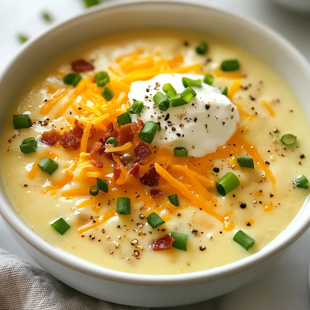 A creamy and comforting soup loaded with potatoes, cheese, and optional toppings.