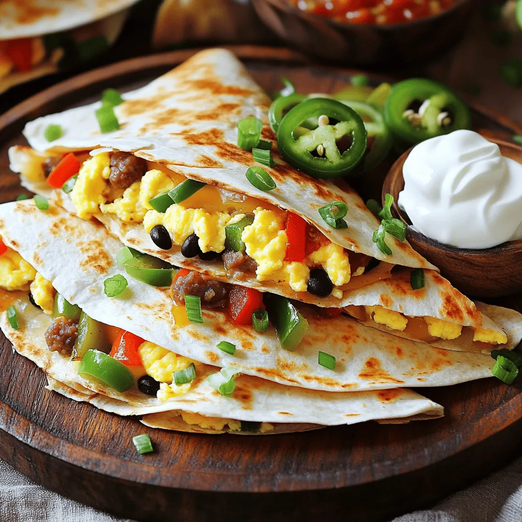 To make loaded breakfast quesadillas, you need key ingredients. Here’s what you will use: - 4 large flour tortillas - 6 large eggs - 1 cup shredded cheese (cheddar or a Mexican blend) - 1 cup cooked and crumbled sausage (or use diced vegetables for a vegetarian option) - ½ cup diced bell peppers (red and green) - ½ cup chopped green onions - ½ cup black beans, drained and rinsed - 1 jalapeño, sliced (optional, for heat) - 2 tablespoons olive oil - ½ teaspoon ground cumin - Salt and pepper to taste - Sour cream and salsa for serving These ingredients create a hearty and satisfying meal. The eggs offer protein, while cheese adds creamy goodness. You can make these quesadillas your own. Here are some optional ingredients to consider: - Avocado or guacamole for creaminess - Spinach or kale for extra greens - Hot sauce for added spice - Chopped tomatoes for freshness - Different types of beans, like pinto or refried beans Feel free to mix and match based on what you love! Everyone can enjoy this dish. Here are some easy swaps: - Eggs: Use silken tofu for a vegan option. - Cheese: Try dairy-free cheese for a lactose-free choice. - Sausage: Use tempeh or jackfruit for a plant-based protein. - Tortillas: Opt for corn tortillas if you want a gluten-free option. These substitutions help you cater to different diets while keeping the flavors delicious. For the full recipe, check the details above. To start, gather your ingredients. You need eggs, salt, pepper, and ground cumin. Crack six large eggs into a bowl. Whisk them until they are mixed well. Add salt, pepper, and ground cumin. Mix again until everything is combined. This egg mixture is key for flavor. Next, heat one tablespoon of olive oil in a non-stick skillet over medium heat. Pour the egg mixture into the skillet. Scramble the eggs until they are just set. This should take a few minutes. Once done, remove them from the heat and let them cool for a bit. Get a large mixing bowl. Add the scrambled eggs, cooked sausage (or vegetables), black beans, diced bell peppers, cheese, and green onions. Stir everything until it's evenly mixed. This mixture is what makes your quesadillas loaded and tasty. Now, take a tortilla and place it in the skillet over low heat. Sprinkle some cheese on one half of the tortilla. Then, add a generous scoop of the egg and filling mixture on top of the cheese. Fold the tortilla over to cover the filling. Cook for about 2-3 minutes on each side. You want it to be golden brown, and the cheese should melt. Repeat this process with the rest of the tortillas and filling. If needed, add more oil to the skillet to prevent sticking. Once done, slice each quesadilla into wedges. Serve the quesadillas warm for the best taste. Place them on a plate and offer sour cream and salsa on the side. This adds extra flavor and a nice touch to your meal. You can also garnish with chopped green onions or avocado slices for a pop of color. Enjoy your loaded breakfast quesadillas! Check out the Full Recipe for more details. To get a great quesadilla, focus on the right heat. Use medium heat to cook. This helps the tortillas get crispy without burning. Always use enough oil in the pan. It helps the quesadilla not stick and makes it golden. Flip them gently to keep the filling inside. If you like extra crunch, use two tortillas per quesadilla. Mornings can be hectic. Prep your ingredients the night before. Chop your veggies and cook the sausage ahead of time. Store them in the fridge. You can even whisk the eggs the night before. In the morning, just mix everything quickly. This way, you can enjoy loaded breakfast quesadillas with less fuss. Having the right tools makes cooking easier. Use a non-stick skillet for even cooking. A spatula helps flip the quesadillas without spilling filling. For cutting, a pizza cutter works wonders. It gives neat slices. If you love cooking, consider a quesadilla maker for quick meals. These tools save time and make cooking fun. Check out the Full Recipe for more tips! {{image_2}} To make a vegetarian breakfast quesadilla, skip the sausage and add more veggies. You can use mushrooms, spinach, or zucchini. These ingredients not only add flavor but also boost nutrition. For a vegan version, replace the eggs with tofu or chickpea flour. Tofu scrambles well and takes on flavors nicely. Use vegan cheese to keep it dairy-free. This way, everyone can enjoy a loaded breakfast quesadilla! You can switch out the sausage for various proteins. Try bacon or ham for a smoky flavor. Ground turkey or chicken works well too. If you want a meatless option, use black beans or refried beans. These add protein and creaminess to your quesadilla. Mix and match these proteins to find your favorite combination. Remember, the key is to balance flavors and textures. Get creative with flavors by adding different spices and herbs. Chopped cilantro or parsley adds freshness. A dash of hot sauce can kick it up a notch. You might also try adding avocado for creaminess. For a Mediterranean twist, add feta cheese and olives. The possibilities are endless! Experimenting with these ideas can lead to unique and tasty results. Check out the Full Recipe for more details on how to create your own loaded breakfast quesadillas. To store leftover quesadillas, let them cool first. Place them in an airtight container. You can also wrap them in foil or plastic wrap. Make sure to keep them in the fridge. They stay fresh for about 3 days. If you want to enjoy them later, freezing is a great option. Reheat quesadillas on the stove for best results. Place them in a non-stick skillet over medium heat. Cook for about 2-3 minutes on each side. This keeps them crispy and warms the filling evenly. You can also use a microwave, but they may get soft. If you use the microwave, heat them in short bursts. Check every 30 seconds until warm. To freeze quesadillas, wrap each one in plastic wrap. Then place them in a freezer-safe bag. This helps avoid freezer burn. 