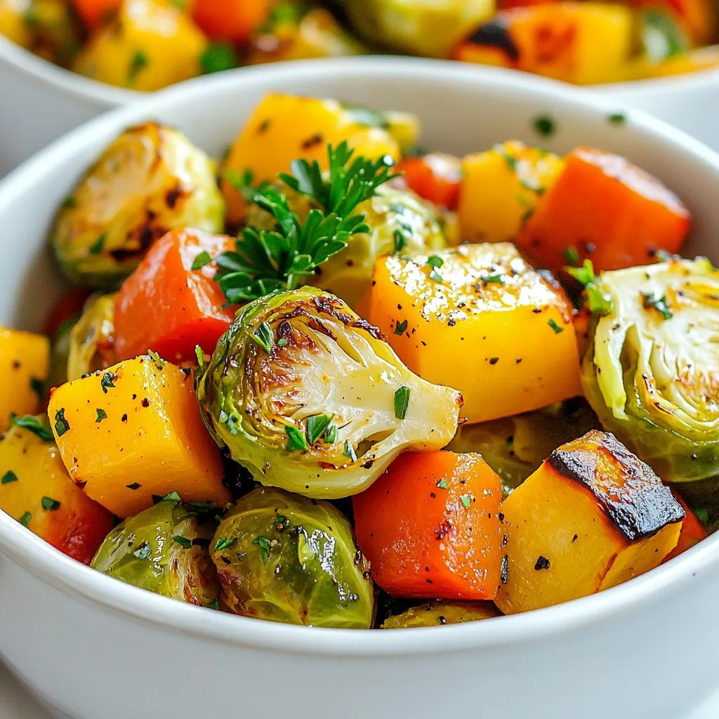 In a large bowl, combine the Brussels sprouts, butternut squash, carrots, and red bell pepper.
