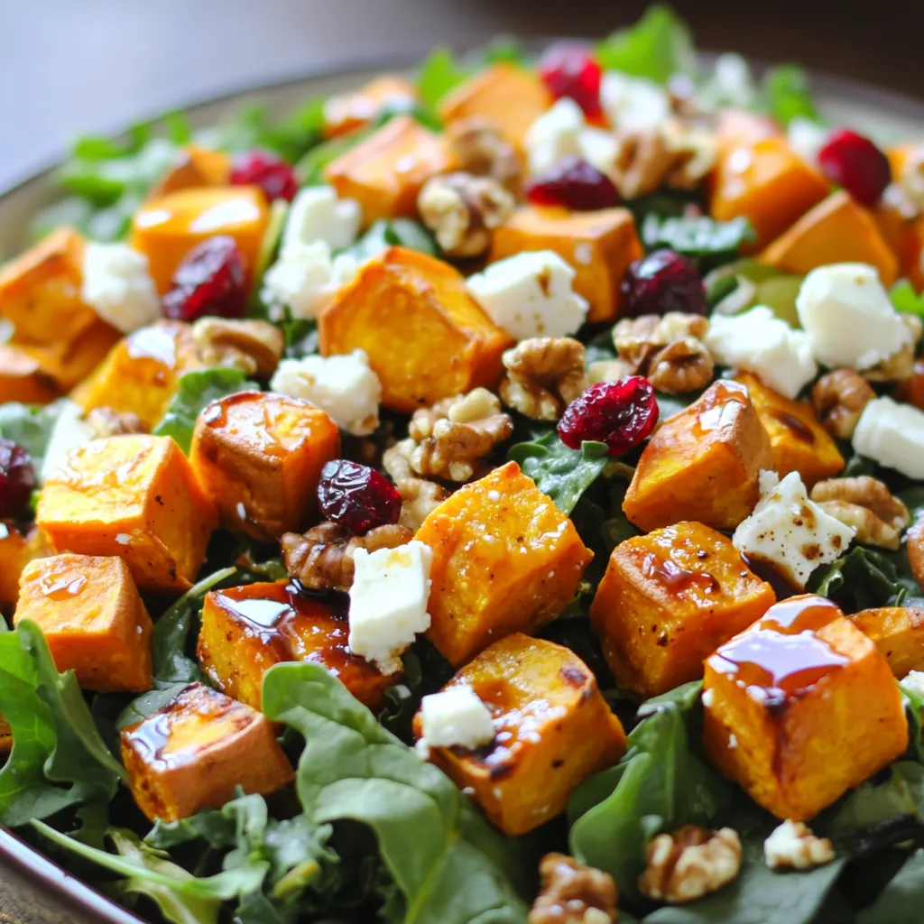 - 2 large sweet potatoes, peeled and cubed - 3 tablespoons olive oil - 2 tablespoons pure maple syrup - 1 teaspoon ground cinnamon Sweet potatoes are the star of this salad. They bring a sweet, earthy flavor. Their bright orange color makes the dish pop. Olive oil is key for roasting. It helps the sweet potatoes cook evenly and adds richness. Maple syrup adds a delightful sweetness. This blend of flavors makes every bite special. Ground cinnamon gives warmth and depth. It enhances the sweet notes in the potatoes. - 4 cups mixed greens (spinach, arugula, and kale) - 1/2 cup feta cheese, crumbled - 1/4 cup walnuts, roughly chopped - 1/4 cup dried cranberries - 2 tablespoons balsamic vinegar Mixed greens are fresh and crunchy. They balance the sweetness of the roasted sweet potatoes. Feta cheese adds a salty creaminess. Its tangy flavor contrasts nicely with the sweet elements. Walnuts bring a nice crunch and nutty taste. Dried cranberries add a bit of chewiness and sweetness. They also bring color to the salad. Balsamic vinegar ties everything together. It adds a tangy finish that elevates the dish. - Salt - Pepper Salt and pepper are must-haves in any dish. They enhance flavors and bring everything to life. A pinch of salt can brighten the sweetness of the sweet potatoes. Freshly cracked pepper adds a hint of spice. Adjust these seasonings to your taste for the best result. Preheating the oven Start by preheating your oven to 400°F (200°C). This step is crucial for roasting. A hot oven helps the sweet potatoes become tender and caramelized. Preparing sweet potatoes Next, take 2 large sweet potatoes. Peel and cube them into bite-sized pieces. In a large bowl, mix the cubed sweet potatoes with 3 tablespoons of olive oil, 2 tablespoons of pure maple syrup, 1 teaspoon of ground cinnamon, salt, and pepper to taste. Toss everything together until the sweet potatoes are fully coated. Roasting the sweet potatoes Spread the seasoned sweet potatoes on a baking sheet lined with parchment paper. Make sure they lay flat and do not overlap. Roast them in the oven for about 25-30 minutes. Halfway through, turn them to ensure even cooking. Check for tenderness and caramelization; they should be soft and golden brown. Assembling the salad While the sweet potatoes roast, prepare the salad base. In a large serving bowl, place 4 cups of mixed greens like spinach, arugula, and kale. Once the sweet potatoes cool slightly, add them to the greens. Next, sprinkle 1/2 cup of crumbled feta cheese, 1/4 cup of roughly chopped walnuts, and 1/4 cup of dried cranberries on top. Finally, drizzle 2 tablespoons of balsamic vinegar over everything and gently toss to combine. Serve your salad immediately for a warm, comforting dish. If you prefer, chill it for 10 minutes before serving. This allows the flavors to meld together, enhancing the taste. Enjoy each bite of this delightful salad! To get the best flavor, you want sweet potatoes to caramelize. This adds a nice sweetness and depth. Here’s how to ensure that: - Use a hot oven: Preheat to 400°F (200°C). This heat helps with browning. - Spread them out: Make sure sweet potatoes are in a single layer. This lets them roast, not steam. Cutting sweet potatoes evenly is key for even cooking. Here’s how: - Uniform cubes: Aim for 1-inch cubes. This size cooks well and gives great texture. - Use a sharp knife: A sharp knife helps you cut through the tough skin easily. You can boost the flavor of your salad with these fun toppings: - Avocado: Adds creaminess. - Pumpkin seeds: For a crunchy texture. - Fresh herbs: Like parsley or cilantro for extra freshness. If you want to switch up the dressing, try these alternatives: - Honey mustard: For a tangy twist. - Lemon vinaigrette: Adds brightness and acidity. Leftovers are great for lunch or snacks. Here’s how to store them: - Use airtight containers: This keeps the salad fresh. - Refrigerate: It can last up to three days in the fridge. When it comes to reheating, follow these tips: - Microwave: Heat in short bursts, stirring often. - Enjoy cold: This salad tastes great cold too! {{image_2}} You can change the feta cheese if you want. Try goat cheese for a tangy kick. Creamy ricotta also makes a great choice. If you need a dairy-free option, use a vegan cheese. For nuts, walnuts add a nice crunch. However, you can swap them for pecans or almonds. Each nut gives a different taste and texture to the salad. To make this dish vegan, skip the feta cheese. You can add avocado for creaminess. Use a vegan balsamic dressing instead of standard balsamic vinegar. For a gluten-free option, this salad is already safe. Just be sure your maple syrup and any added toppings are gluten-free. This way, everyone can enjoy it! In spring, add fresh berries like strawberries or blueberries. They provide a sweet burst that pairs well with sweet potatoes. In the fall, try chopped apples or pears for a cozy flavor. You can also mix in root vegetables like carrots or beets. They roast nicely and add color to the dish. Feel free to blend different veggies for a heartier salad! To keep your Maple Roasted Sweet Potato Salad fresh, use airtight containers. Glass containers work best as they do not stain or hold odors. Make sure to cool the salad before sealing. Store it in the fridge for up to four days. If you want to freeze leftovers, follow these steps: 1. Let the salad cool completely. 2. Portion it into freezer-safe bags or containers. 3. Remove as much air as possible to prevent freezer burn. To thaw, place the salad in the fridge overnight. Reheat it in the microwave for a few minutes or enjoy it cold. In the fridge, the salad lasts about four days. If it starts to smell sour or looks slimy, it’s time to toss it. Always check for any signs of spoilage before eating. Can I make this salad ahead of time? Yes, you can make this salad ahead of time. I suggest roasting the sweet potatoes first. Let them cool. Then, store them in the fridge. You can mi