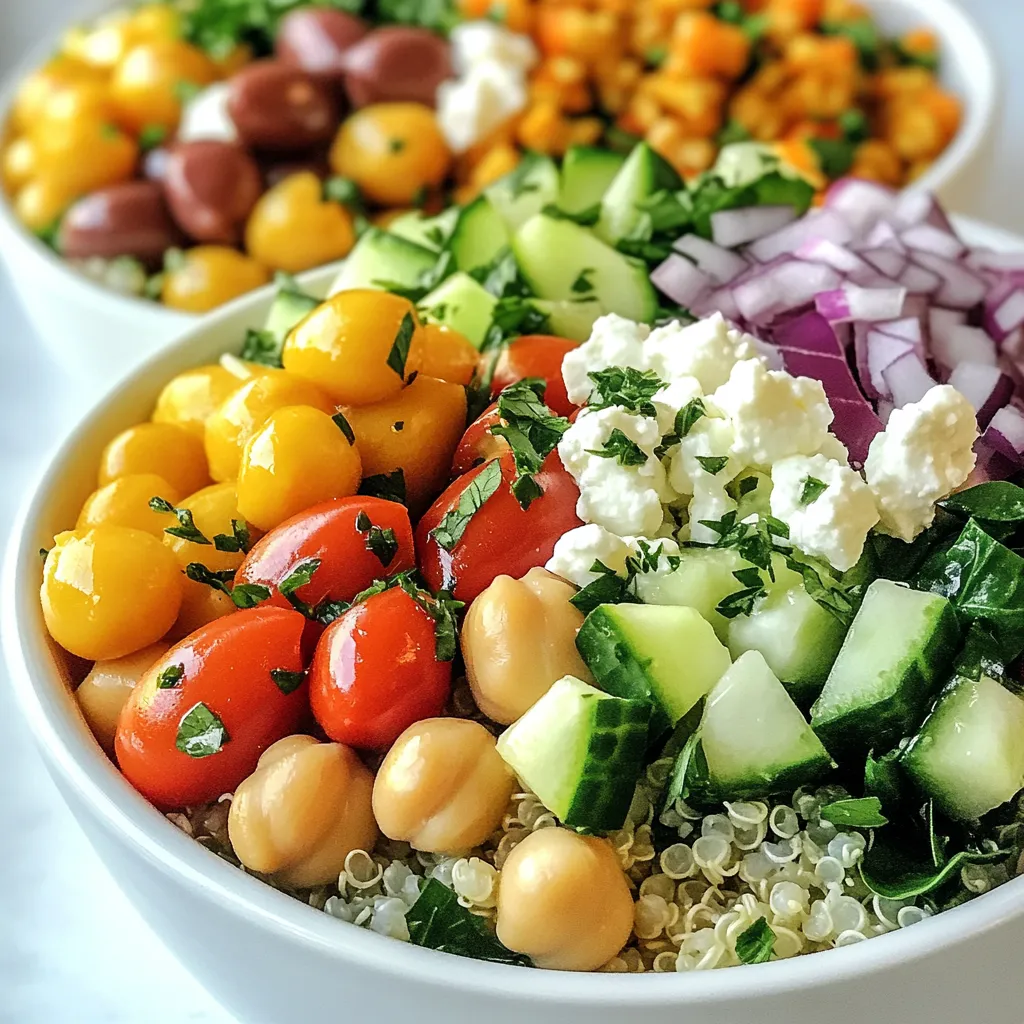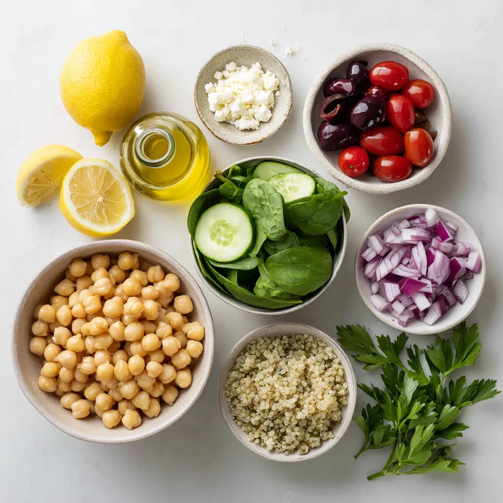 These ingredients make a colorful and healthy meal. Chickpeas are full of protein and fiber. Quinoa adds a nutty flavor and is a great base. Fresh veggies like cherry tomatoes and cucumber give crunch and freshness. The kalamata olives bring a salty bite, while the feta cheese adds creaminess. Olive oil and lemon juice enhance the taste and help blend all the flavors together.