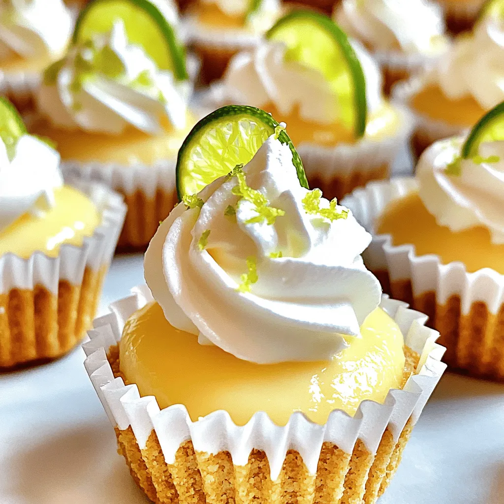 ![To make these mini key lime cheesecakes, gather the following items: - 1 cup graham cracker crumbs - 1/4 cup unsalted butter, melted - 2 tablespoons sugar - 16 oz cream cheese, softened - 1/2 cup granulated sugar - 1/4 cup sour cream - 1/4 cup fresh key lime juice - 2 teaspoons key lime zest - 2 large eggs - Pinch of salt - Whipped cream, for topping - Lime slices, for garnish You can swap some ingredients if needed. Here are a few simple ideas: - Graham cracker crumbs: Use crushed cookies like digestive biscuits or vanilla wafers. - Unsalted butter: Coconut oil can work as a dairy-free option. - Sour cream: Greek yogurt provides a similar tangy flavor and texture. - Fresh key lime juice: Regular lime juice works too, but the taste may differ slightly. - Cream cheese: For a lighter version, try using reduced-fat cream cheese. Fresh ingredients make your mini key lime cheesecakes taste great. Here are some tips: - Key limes: Choose limes that feel heavy for their size and have a glossy skin. - Cream cheese: Look for blocks of cream cheese, not the spreadable kind. Check the expiration date for freshness. - Butter: Select high-quality unsalted butter for the best flavor. - Eggs: Use fresh eggs; they should be clean and free of cracks. These steps will help you gather the best ingredients for your mini key lime cheesecakes. For the full recipe, check out the [Full Recipe]. First, we need to gather our ingredients. You will need graham cracker crumbs, butter, and sugar for the crust. For the filling, grab cream cheese, granulated sugar, sour cream, key lime juice, key lime zest, eggs, and a pinch of salt. 1. Preheat your oven to 325°F (160°C). Line a 12-cup muffin tin with paper liners. 2. In a medium bowl, mix the graham cracker crumbs, melted butter, and 2 tablespoons of sugar. Stir until the crumbs are fully coated with butter. 3. Press about a tablespoon of this mixture into the bottom of each muffin liner. This forms the crust. Bake for 5-7 minutes, or until slightly golden. Remove them from the oven and let them cool. Now, let’s make the cheesecake filling. 1. In a large mixing bowl, beat the softened cream cheese until it is smooth. 2. Gradually add in 1/2 cup of granulated sugar. Mix until well combined. 3. Next, stir in the sour cream, key lime juice, zest, and a pinch of salt. Mix until the mixture is smooth and creamy. 4. Add the eggs one at a time. Keep the mixer on low speed to avoid overmixing. 5. Spoon the cheesecake batter evenly over the cooled crusts in the muffin tin. Time to bake the cheesecakes! 1. Bake for 20-25 minutes. The edges should be set, and the centers may jiggle a bit. 2. Remove them from the oven and let cool in the tin for about 10 minutes. 3. After that, transfer them to the refrigerator. Chill for at least 2 hours or until they are completely set. 4. Before serving, top each cheesecake with whipped cream and garnish with a slice of lime. For the complete recipe, check out the Full Recipe section. Enjoy your mini key lime cheesecakes! To make the best crust, use fresh graham cracker crumbs. Mix them with melted butter and sugar. Press this mixture firmly into the muffin liners. Bake until slightly golden. This gives the crust a nice crunch. One common mistake is overmixing the cream cheese. Mix just until smooth. Overmixing can add too much air, making the cheesecakes puff up and crack. Another mistake is not chilling them enough. They need time in the fridge to set properly. Serve your mini key lime cheesecakes with whipped cream on top. A slice of lime adds a nice touch. You can also sprinkle some key lime zest for extra flavor. For a fun twist, try adding fresh berries on the side. These cheesecakes are perfect for summer gatherings or any sweet treat moment. For the full recipe, check out the instructions above! {{image_2}} You can easily change the flavor of your mini key lime cheesecakes. One fun option is coconut. To do this, add 1/2 cup of shredded coconut to the batter. This gives a tropical twist. Another tasty option is raspberry. You can swirl in some raspberry puree before baking. This adds a nice color and flavor. If you need a gluten-free treat, it’s simple to adapt this recipe. Use gluten-free graham cracker crumbs for the crust. Many brands offer these crumbs in stores. Check the label to ensure they are truly gluten-free. This lets everyone enjoy the dessert without worry. For a dairy-free version, swap out the cream cheese and sour cream. Use a dairy-free cream cheese made from nuts or soy. Also, choose a non-dairy sour cream or yogurt. These swaps keep the texture creamy and delicious. You can still enjoy the tangy flavor of key lime. This way, everyone can join in on the fun! For the complete approach, check the Full Recipe. To keep your mini key lime cheesecakes fresh, place them in an airtight container. You can stack them carefully, but use parchment paper between layers to prevent sticking. Store them in the fridge for easy access. They stay delicious and creamy this way. If you want to save some for later, freezing is a great option. First, let the cheesecakes cool completely. Then, wrap each cheesecake in plastic wrap and place them in a freezer-safe bag. You can also use a container that seals tight. They can stay in the freezer for up to three months. When you’re ready to enjoy them, thaw them overnight in the fridge. Mini key lime cheesecakes last about a week in the fridge. To enjoy them at their best, eat them within the first few days. Keep an eye out for changes in texture or smell. If you notice anything off, it’s best to throw them away. Follow these tips for maximum freshness and flavor! For the complete recipe, check out the Full Recipe. Key limes are smaller than regular limes. They are also more tart and aromatic. The taste is unique and gives a special zing to desserts. Key limes have a yellowish hue when ripe. Regular limes remain green and are usually larger. You can find key limes in stores, but they m