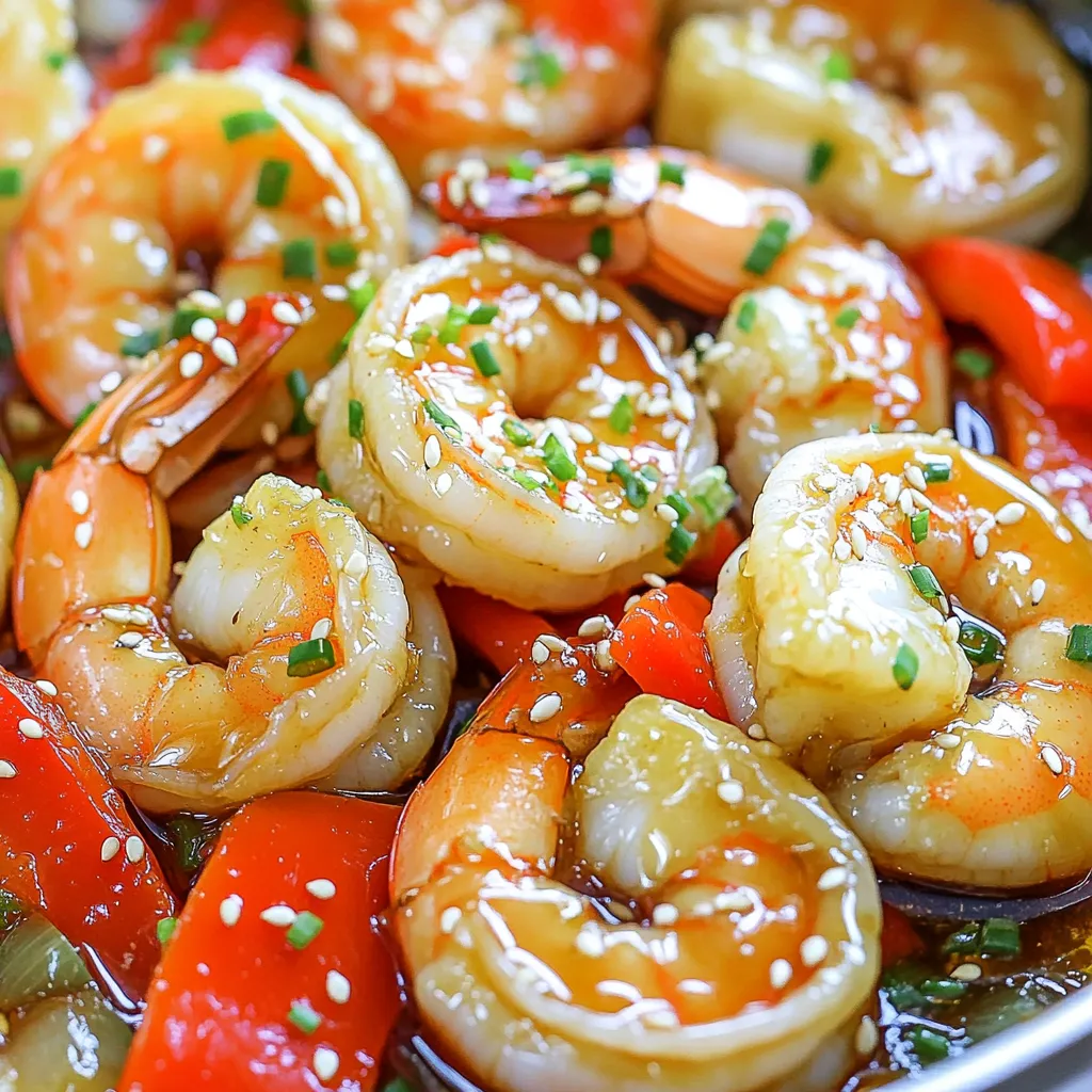 – Pour the honey garlic sauce over the shrimp and bell peppers. Stir gently to coat. Let it cook for another 2-3 minutes. The sauce will thicken slightly.
