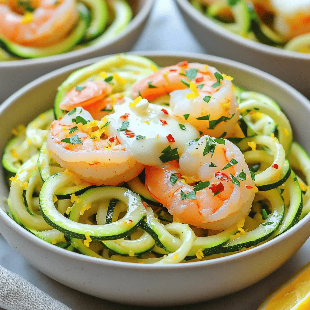 - 2 medium zucchinis, spiralized into noodles - 1 pound medium shrimp, peeled and deveined - 4 tablespoons unsalted butter - 4 cloves garlic, minced - 1 teaspoon red pepper flakes (adjust to taste) - 1 lemon, juiced and zested - 1/4 cup fresh parsley, chopped - Salt and pepper to taste - Optional: Grated Parmesan cheese for serving To make Minute Shrimp Scampi Zucchini Noodles, you need fresh, simple ingredients. Start with two medium zucchinis. Spiralize them to create noodle-like shapes. This step adds a fun twist to your meal. You will also need one pound of medium shrimp. Ensure they are peeled and deveined for easier cooking. Fresh shrimp make this dish shine. Next, gather four tablespoons of unsalted butter. This adds rich flavor and helps sauté the garlic. Four cloves of minced garlic bring a strong, tasty punch. Garlic is a key part of scampi. For heat, use one teaspoon of red pepper flakes. You can adjust this based on your spice preference. One lemon is essential. You’ll use both the juice and zest. The lemon brightens the dish and balances flavors. Add one-fourth cup of chopped fresh parsley for color and freshness. It also enhances the taste. Finally, don’t forget salt and pepper to taste. These basic seasonings bring out the best in each ingredient. Optionally, you can sprinkle some grated Parmesan cheese on top when serving. It adds a creamy, salty finish that many enjoy. With these ingredients, you are ready to make a delicious, quick meal! Spiralizing Zucchini Use a spiralizer to turn the zucchinis into noodles. Choose medium zucchinis for the best texture. Hold the zucchini firmly and twist it in the spiralizer. You will see long, thin noodles form quickly. This method makes the dish light and fun. Setting Aside Prepared Noodles Once spiralized, set the zucchini noodles aside. Place them in a bowl and cover them to keep them fresh. You want them ready for mixing later. This step lets the noodles maintain their crunch. Melting Butter and Sautéing Garlic In a large skillet, melt four tablespoons of butter over medium heat. Once the butter melts, add four minced garlic cloves and one teaspoon of red pepper flakes. Cook for about one minute. The kitchen will smell amazing! Be careful not to burn the garlic, as it can become bitter. Cooking Shrimp Properly Next, add one pound of peeled and deveined shrimp to the skillet. Season them with salt and pepper. Cook the shrimp for two to three minutes on one side. They will turn pink when ready. Flip them over and squeeze half a lemon over them. Cook for another two minutes to ensure they are fully cooked. Incorporating Zucchini Now, it is time to add the zucchini noodles to the skillet. Toss them gently with the cooked shrimp. Cook everything together for about two minutes. This step helps the flavors blend beautifully. The noodles should be just tender at this point. Adding Lemon and Parsley Remove the skillet from the heat. Stir in the zest of one lemon and a quarter cup of chopped fresh parsley. Taste the dish and adjust the seasoning with more salt, pepper, or lemon juice if needed. This adds brightness and freshness to your meal. - Adjusting Red Pepper Flakes: Start with 1 teaspoon of red pepper flakes. If you like more heat, add more. If you want less spice, use half. This helps you find your perfect balance. - Balancing Lemon Juice: Lemon adds brightness. I squeeze half a lemon over the shrimp while cooking. Taste it! If it needs more tang, add the other half. Zest the lemon for added flavor too. - Avoiding Overcooked Shrimp: Shrimp cook quickly. Watch closely! Cook them just until they turn pink. Overcooked shrimp are tough and chewy. - Perfecting Zucchini Texture: Zucchini noodles cook fast. Toss them in with the shrimp for just 2 minutes. This keeps them firm and bright, not mushy. - Garnishing Ideas: A sprinkle of fresh parsley brightens the dish. Grate some Parmesan cheese on top for a creamy touch. Add extra lemon zest for a pop of flavor. - Pairing with Sides: Serve with a crisp salad or garlic bread. These sides complement the scampi well and add to your meal experience. {{image_2}} You can switch the shrimp for chicken or tofu. Chicken works well in this dish. Use 1 pound of chicken breast, cut into bite-sized pieces. Cook it in the same way as the shrimp. Tofu is a great choice too. Use firm tofu and press it to remove extra water. Cut it into cubes and sauté until golden. You can also try other seafood. Scallops or mussels can give a different taste. Just cook them the same way as the shrimp. Adjust the cooking time as needed. Make sure they are fully cooked for safety. If you want a different base, try spaghetti squash. It has a mild flavor and a fun texture. Roast the squash, then scrape it out with a fork. It makes a great noodle substitute. Other vegetable noodles work, too. Carrot noodles or sweet potato noodles add color and taste. You can buy them pre-made or spiralize your own. Just remember to adjust cooking time for different noodles. You can boost your dish with extra veggies. Try adding cherry tomatoes, spinach, or bell peppers. They add color and nutrition. Sauté them with the garlic before adding the shrimp. Herbs and spices can enhance the flavor. Basil and oregano work well with this dish. You can also add more red pepper flakes for heat. Just sprinkle them in as you cook, tasting as you go. Refrigerating Shrimp Scampi Store leftover shrimp scampi in an airtight container. Place it in the fridge within two hours of cooking. It stays fresh for up to three days. The flavors will blend nicely as it chills. However, keep the zucchini noodles separate if you can. This helps them stay firm. Freezing Tips You can freeze shrimp scampi too. Use a freezer-safe container or bag. Make sure to remove as much air as possible. It will last for about two months. When you’re ready to eat, thaw it in the fridge overnight. It’s best to reheat it on the stove for even heating. Best Methods for Reheating Th